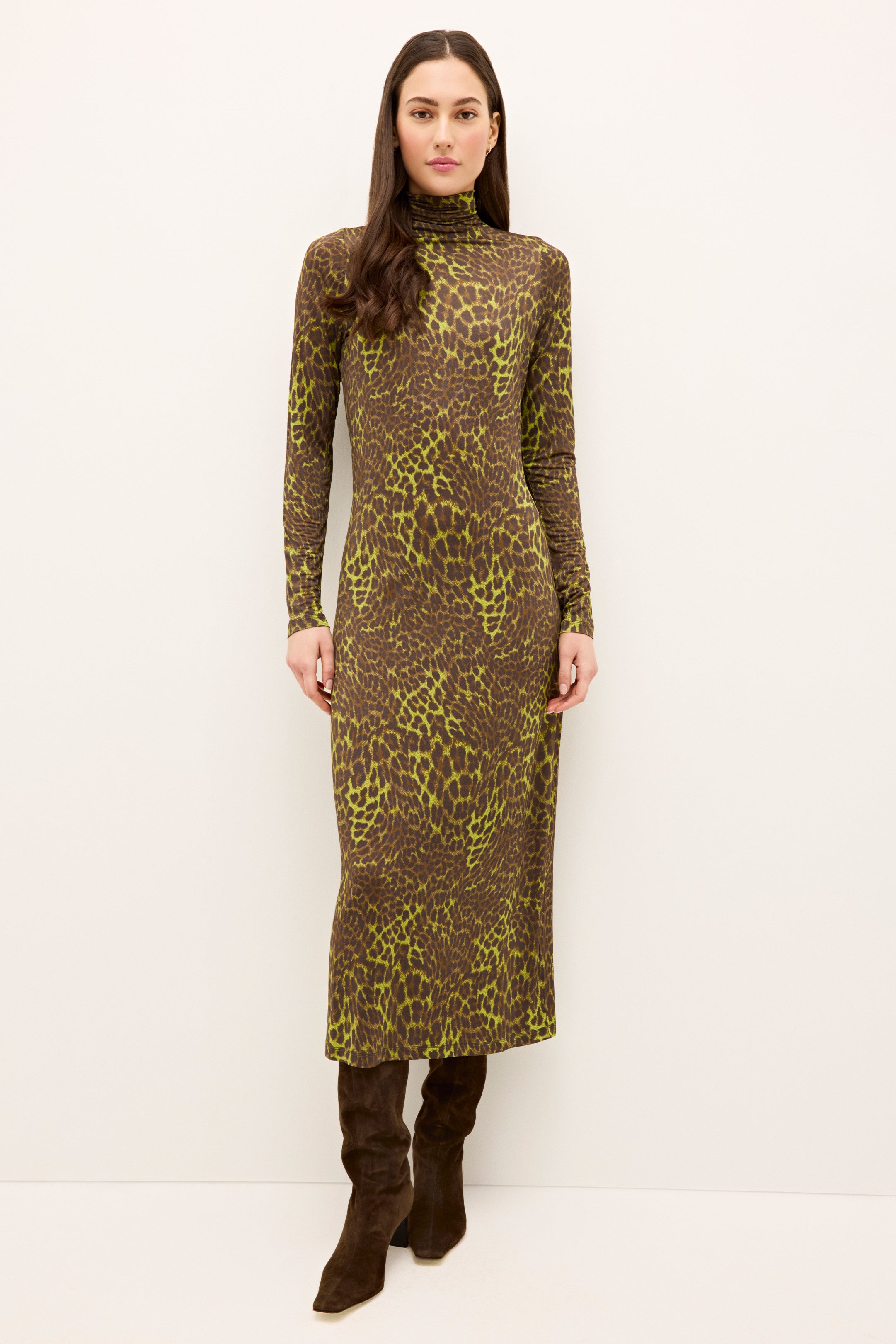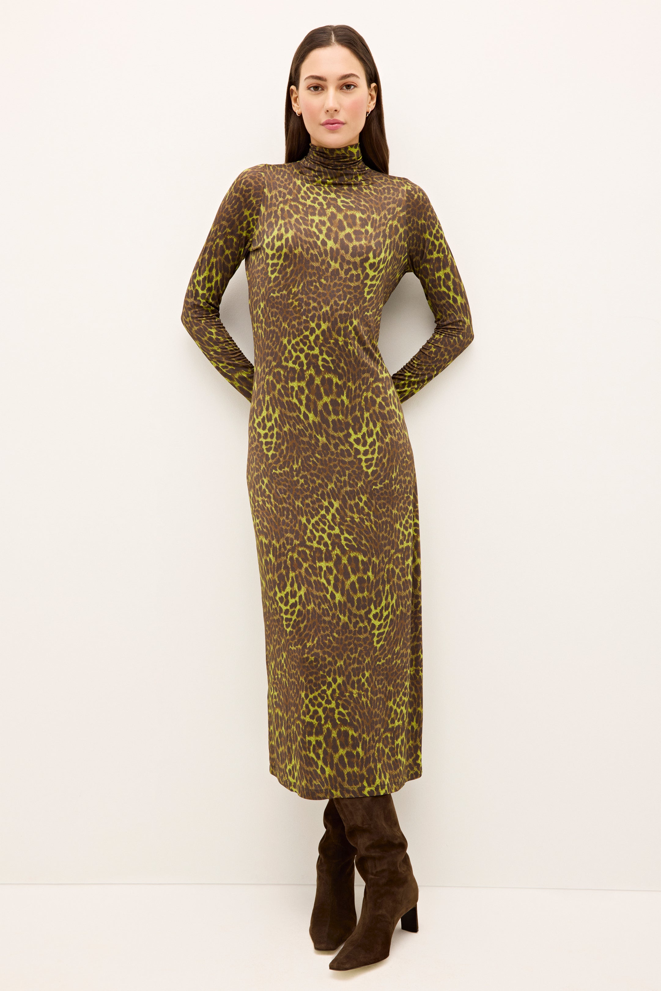 One of our Founder’s favorite seasonal silhouettes, this figure-skimming turtleneck dress features a soft jersey knit that underscores Paxton’s elegant lines. The slip-on style is pictured here in Grasslands, our scorched olive leopard print that gives the layer-ready statement piece even more contemporary appeal.
