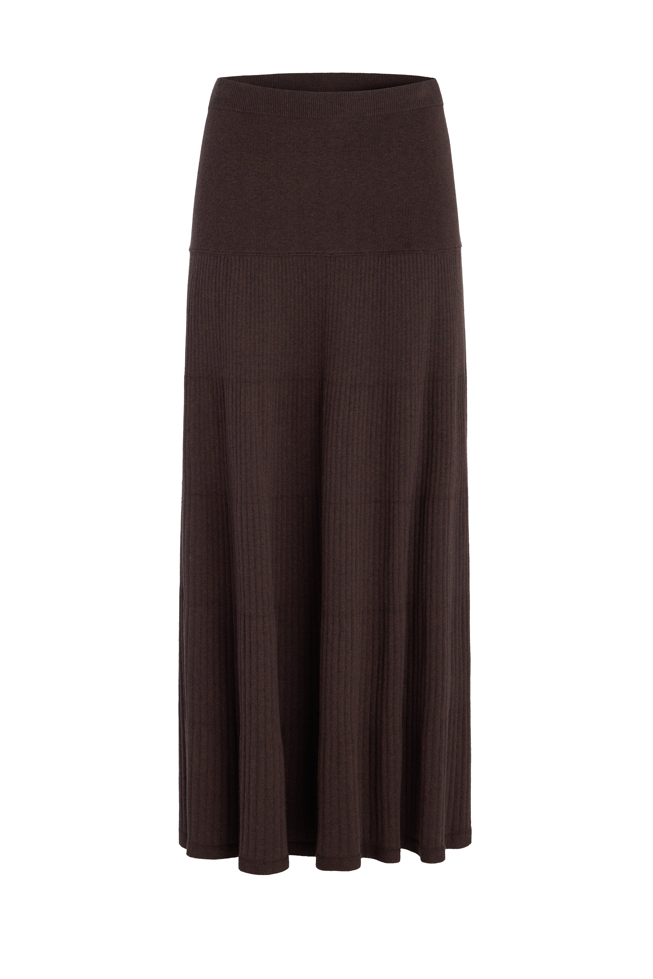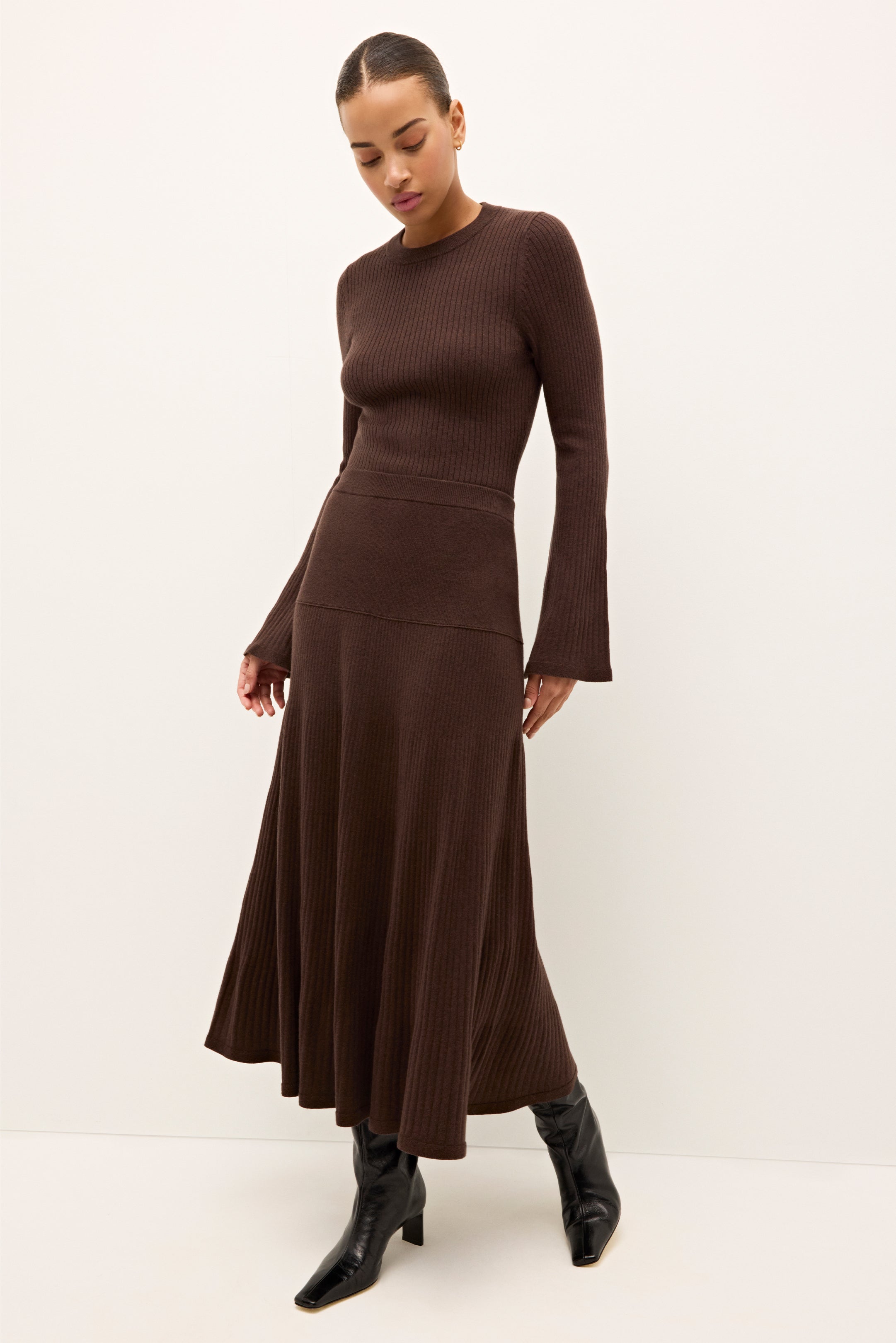 Less really is more when it comes to elevated wardrobe basics like our figure-skimming Kaylan skirt. The slinky ribbed knit maxi features a drop waist rib yoke and is fitted through the hips before gently flaring out toward the floor. Make it a chic set by pairing with our matching Carrey top in Cacao.