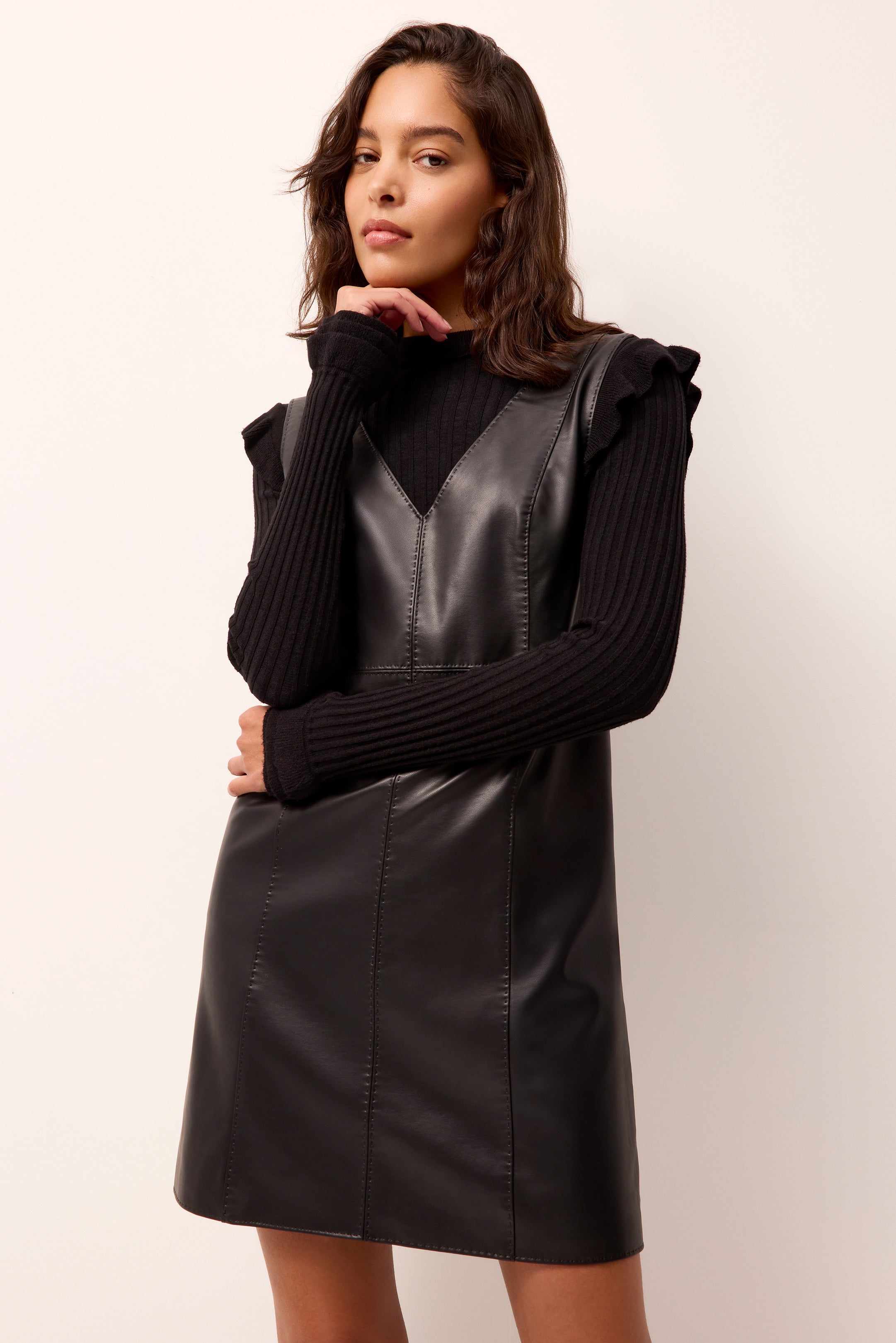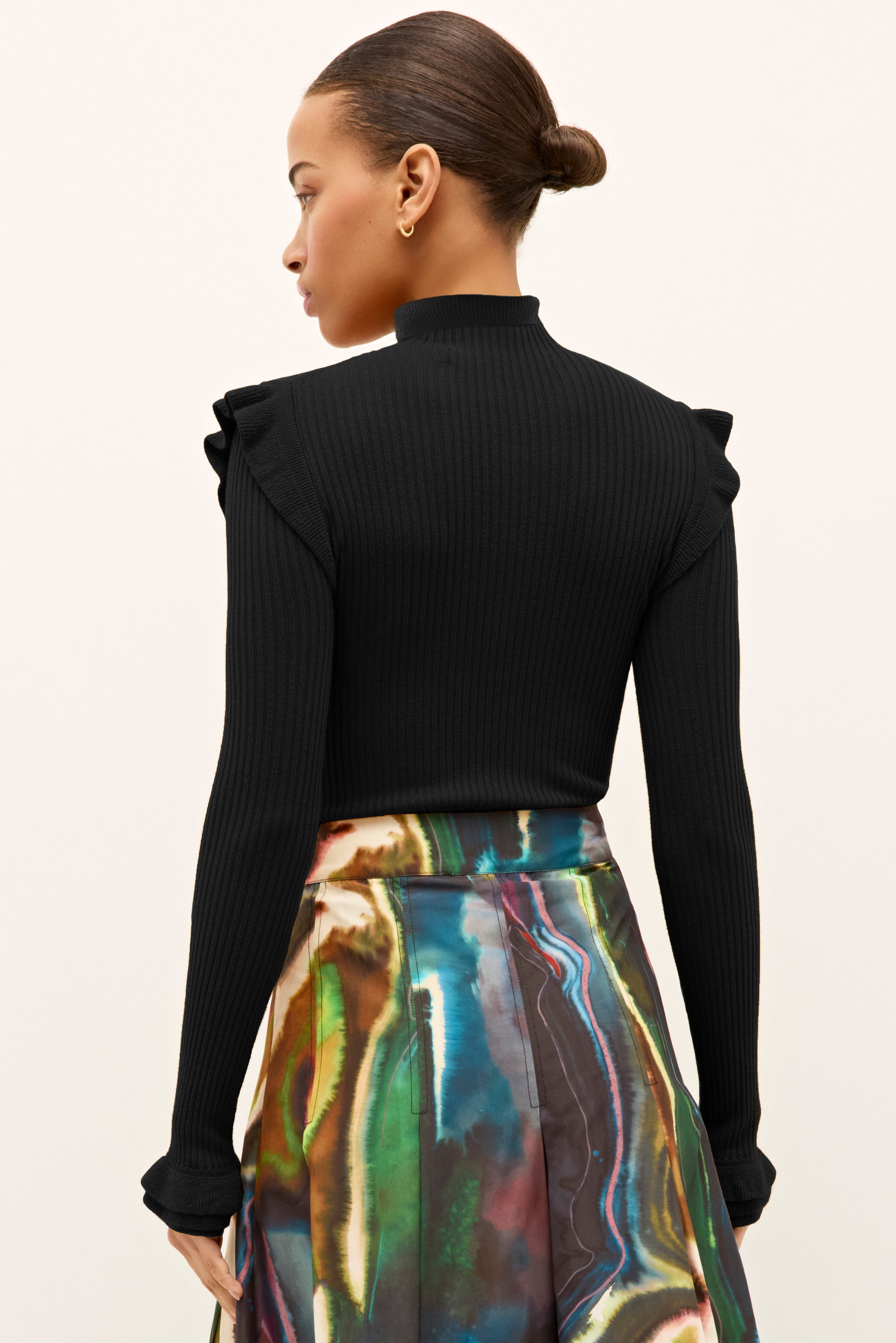 Tinley doesn’t play favorites. Ribbed and ruffled, this lightweight, form-fitting turtleneck is the perfect layering piece. Throw her on under a sleeveless maxi to extend the wearability of the dress, or tuck her into nearly any piece in our fall/winter skirt and short programs. In classic Black, she’s about as versatile as it gets.