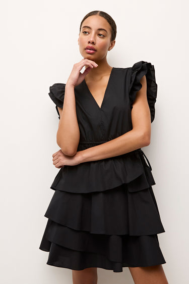 Our new favorite LLBD has arrived. This flirty, slip-on silhouette features a dramatic ruffled shoulder, asymmetrical tiered skirt, wrap front neckline, and adjustable tie waist.