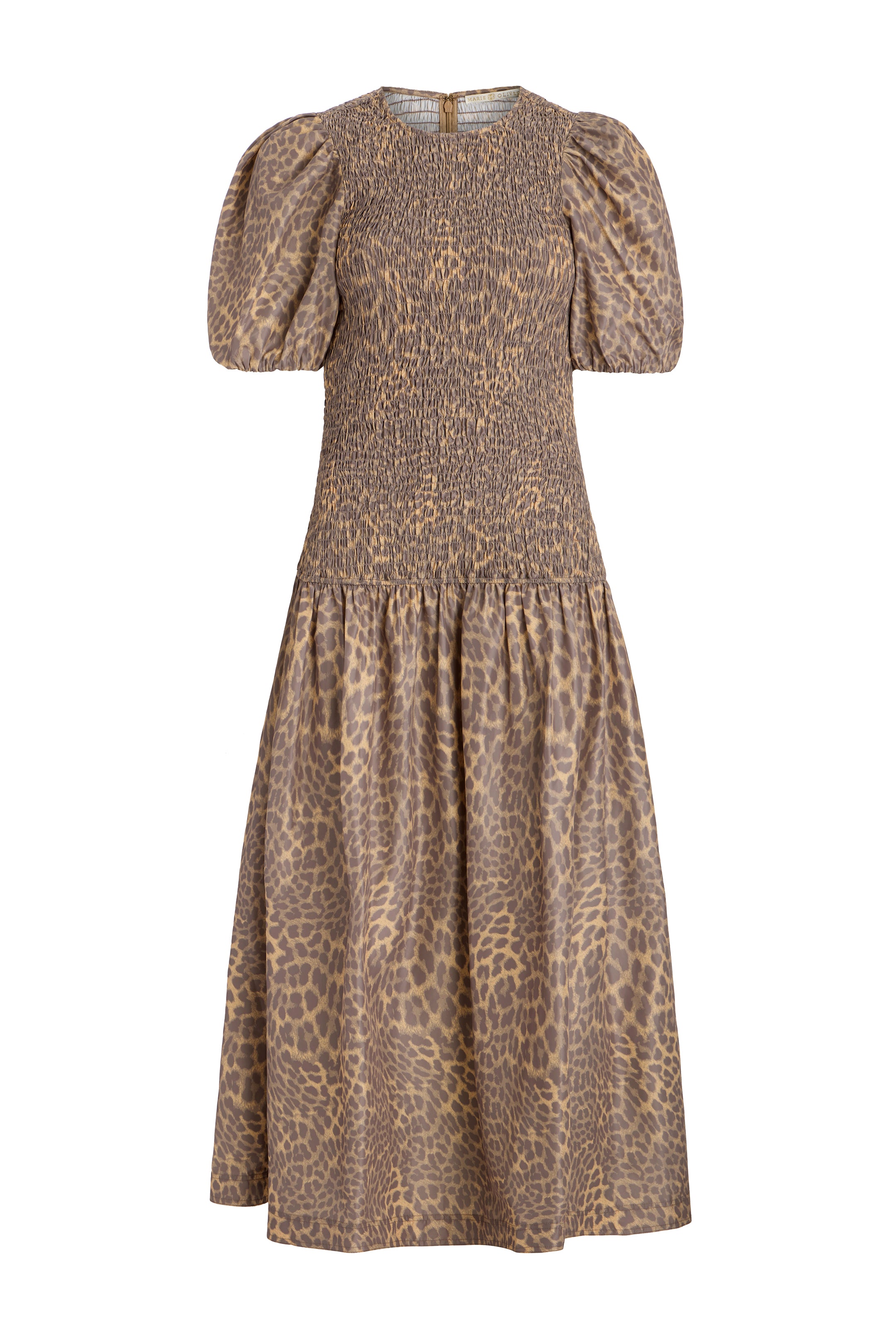 This playful, '80s-inspired party dress is designed to stand out with a fitted smocked bodice, puffed sleeves, and our fierce print. Its taffeta construction lends the silhouette an extra chic shape, and this washed Leopard stunner can be elevated with heels and jewelry, or made more casual with boots or flats.