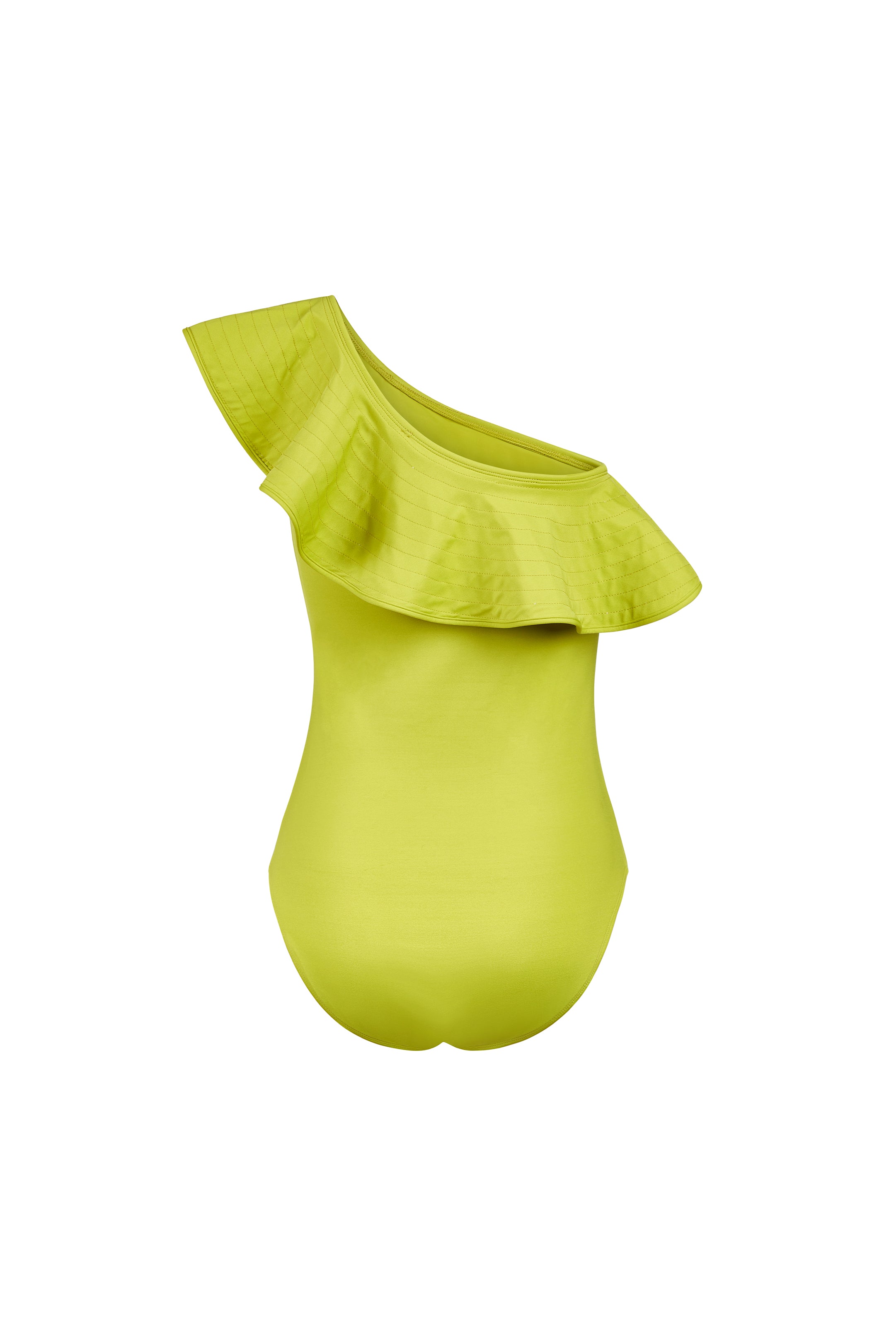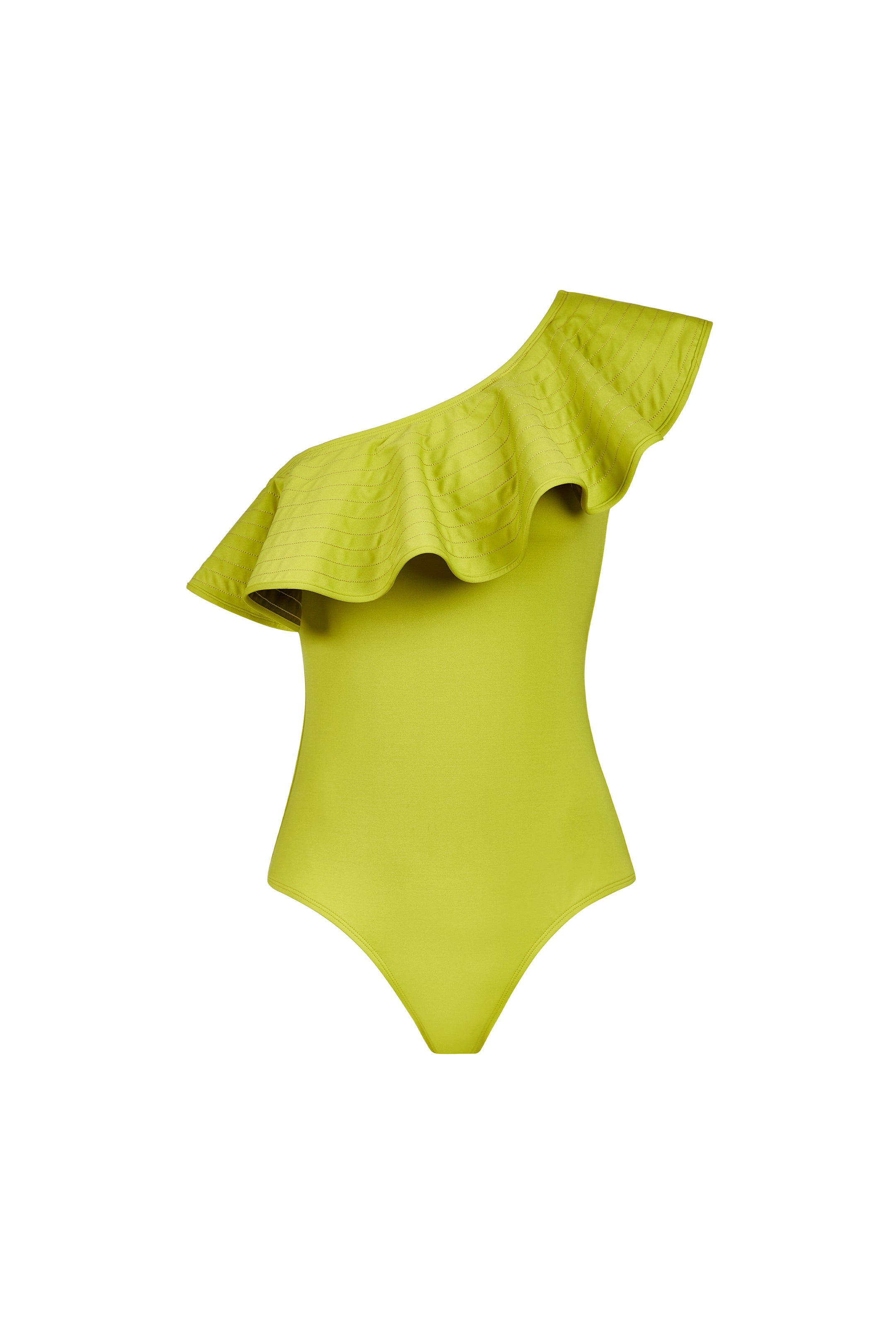 Arriving in punchy Apple green, our new Marissa one piece is a chic statement. With a classic one-shoulder shape and a dramatic trapunto stitched structured ruffle, this silhouette flatters beautifully, and the hue is perfect for any tropical getaway. Style back to coordinating Raina wrap skirt for a complete cabana look.