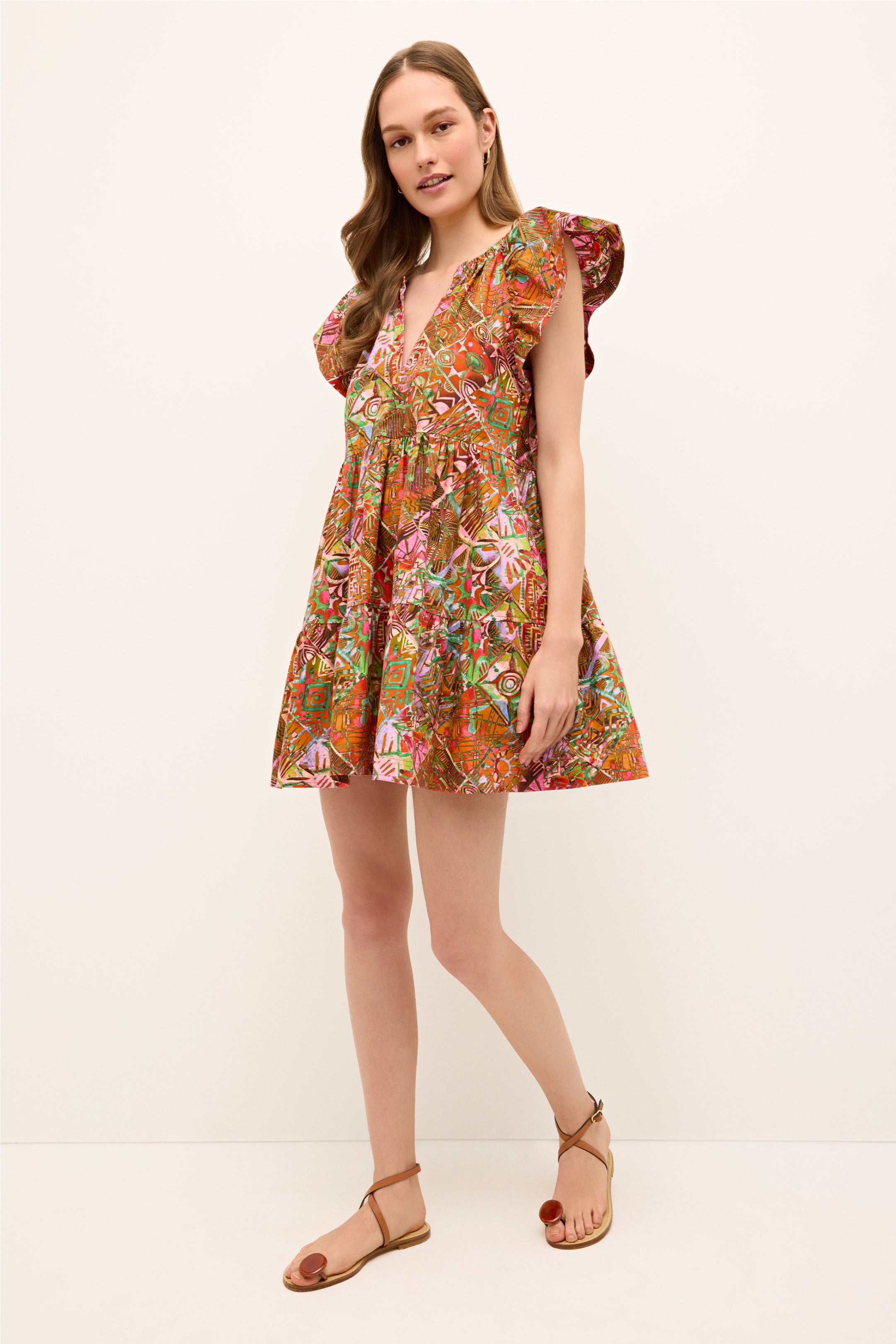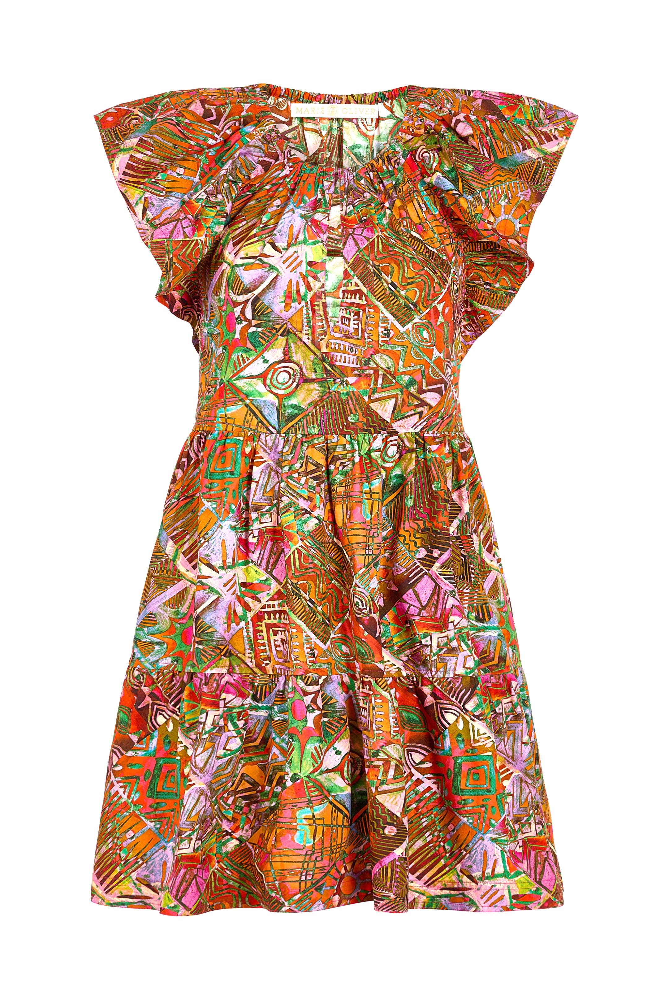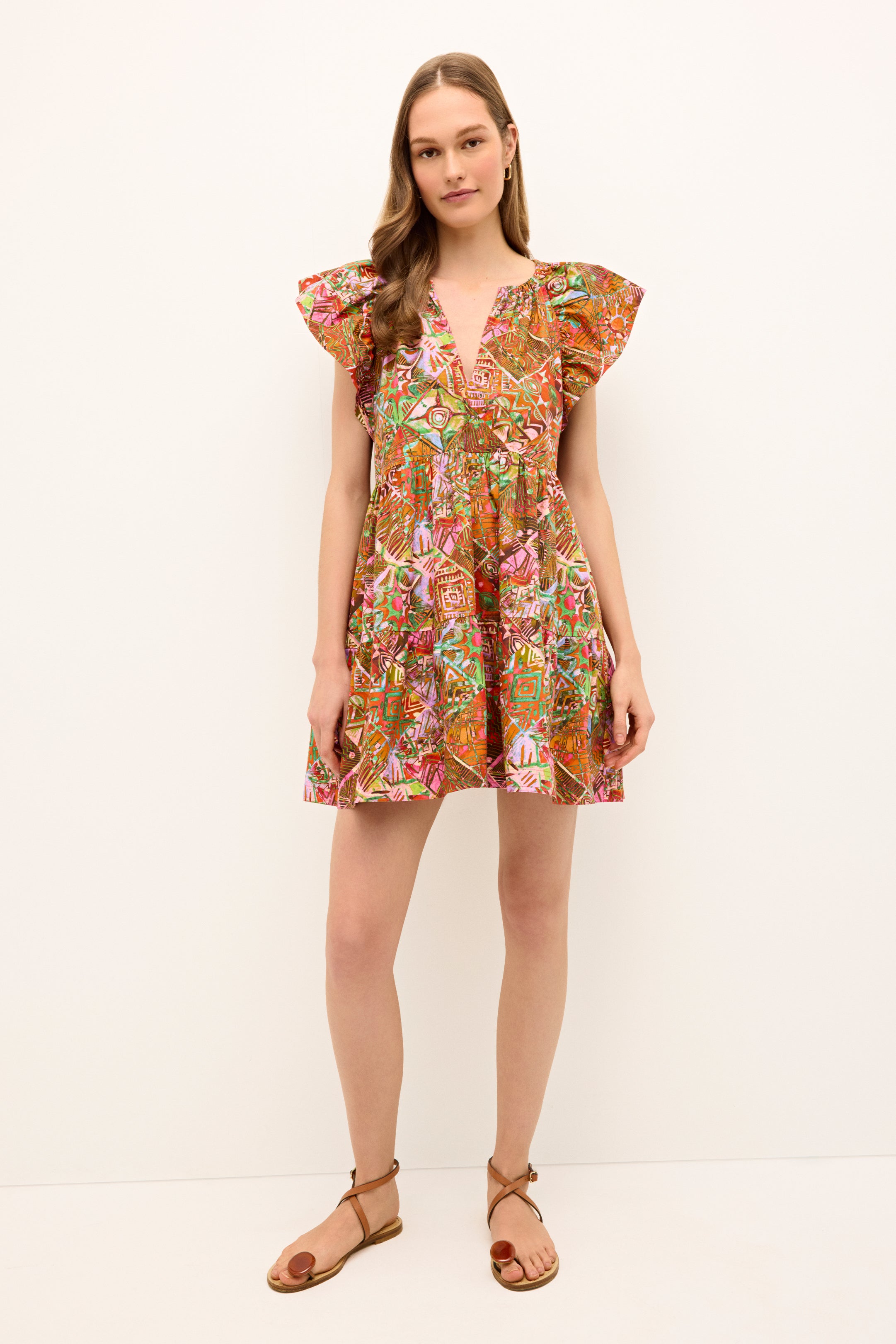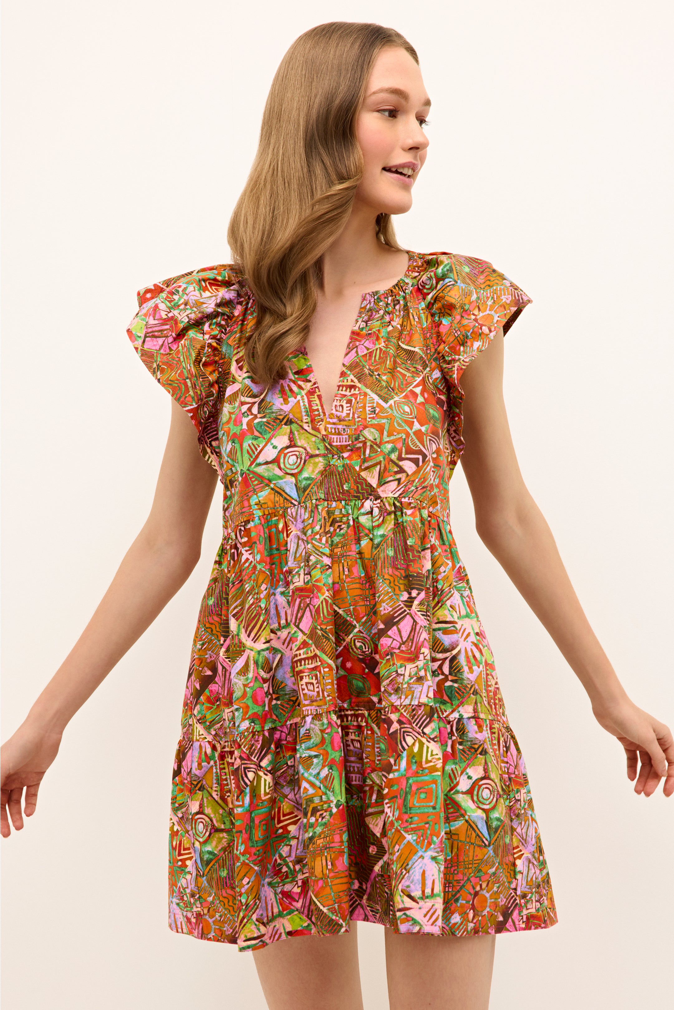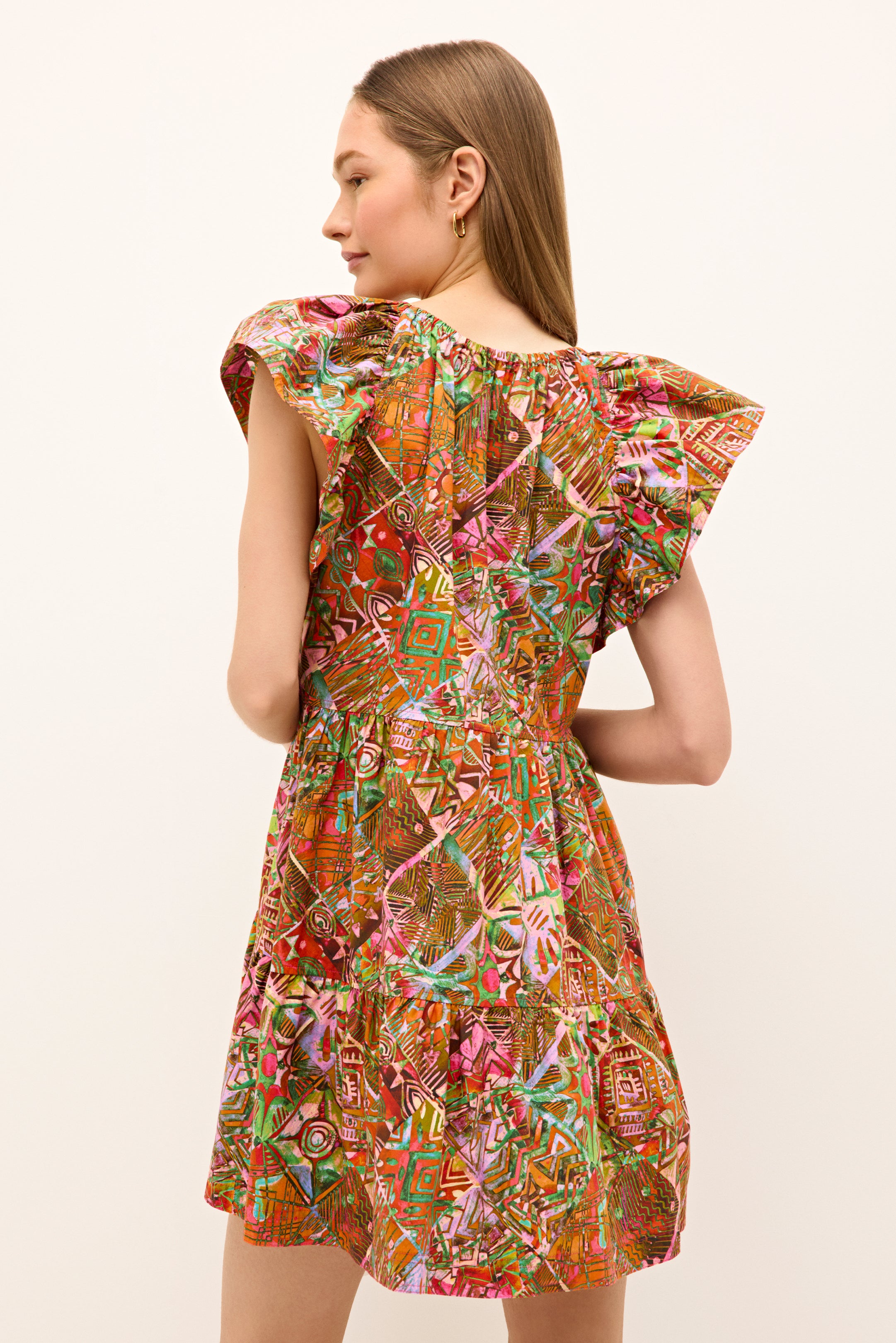 Our summer uniform is back in Tahiti, a painterly patchwork print in a bright kaleidoscope of color. The slip-on silhouette is a perennial best-seller for her wide flutter sleeves, tiered skirt, and her unique combination of comfort, quality, and seasonless style.