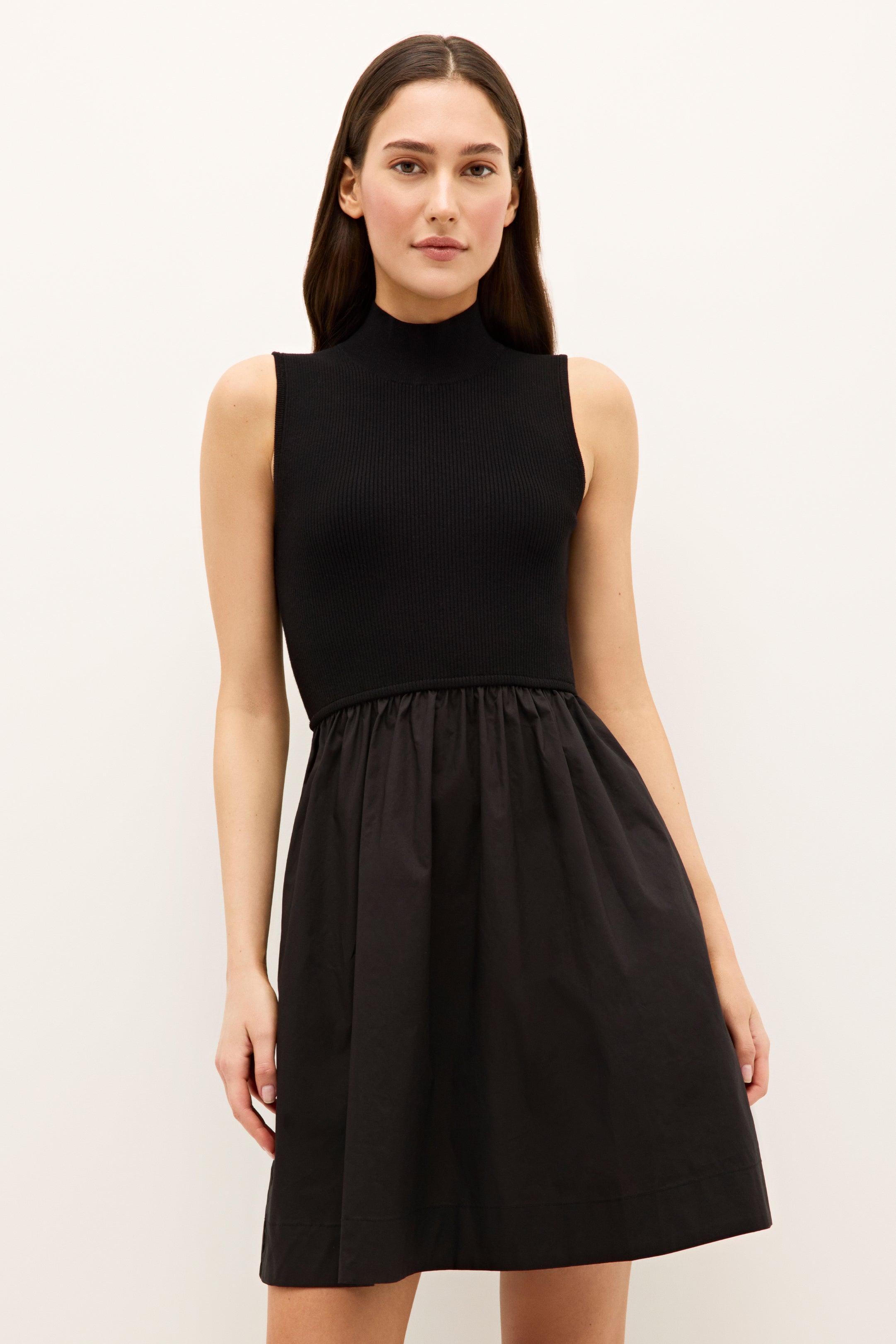 New for the season, our mixed-media Reynolds dress combines comfort and clean lines with a ribbed knit bodice and crisp cotton poplin mini skirt. The easy slip-on silhouette pairs perfectly with boots and a jacket for a polished, fall-ready look.