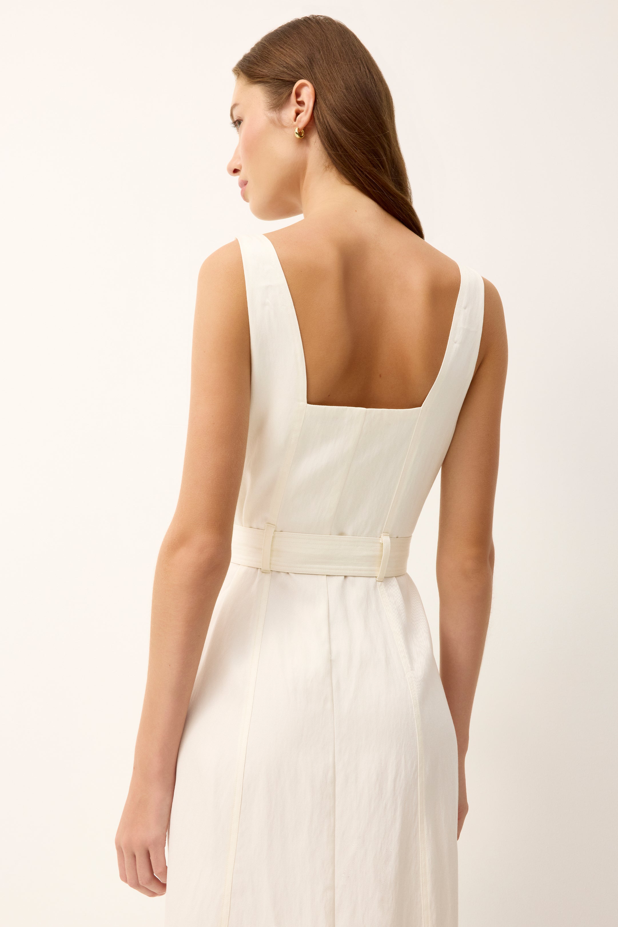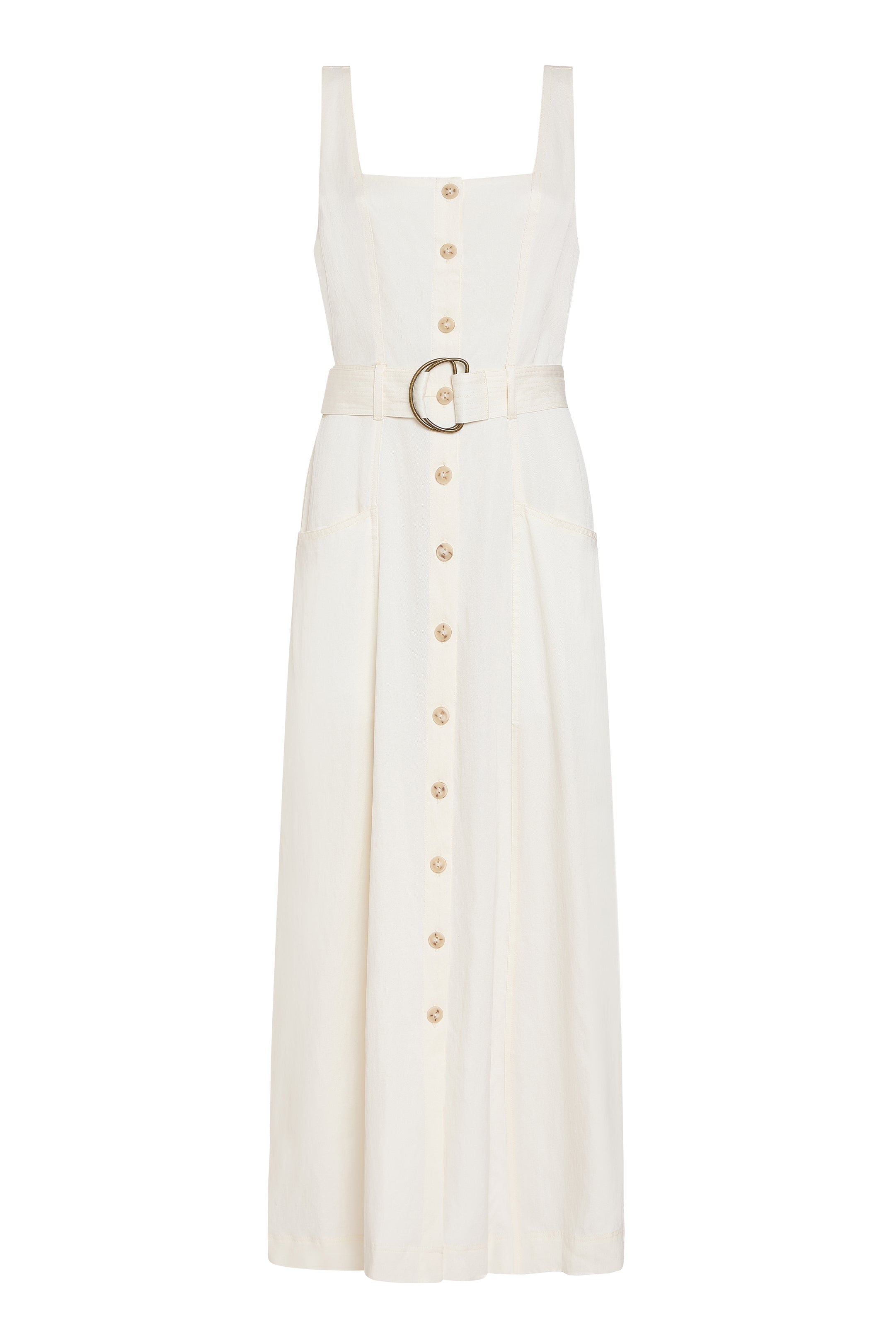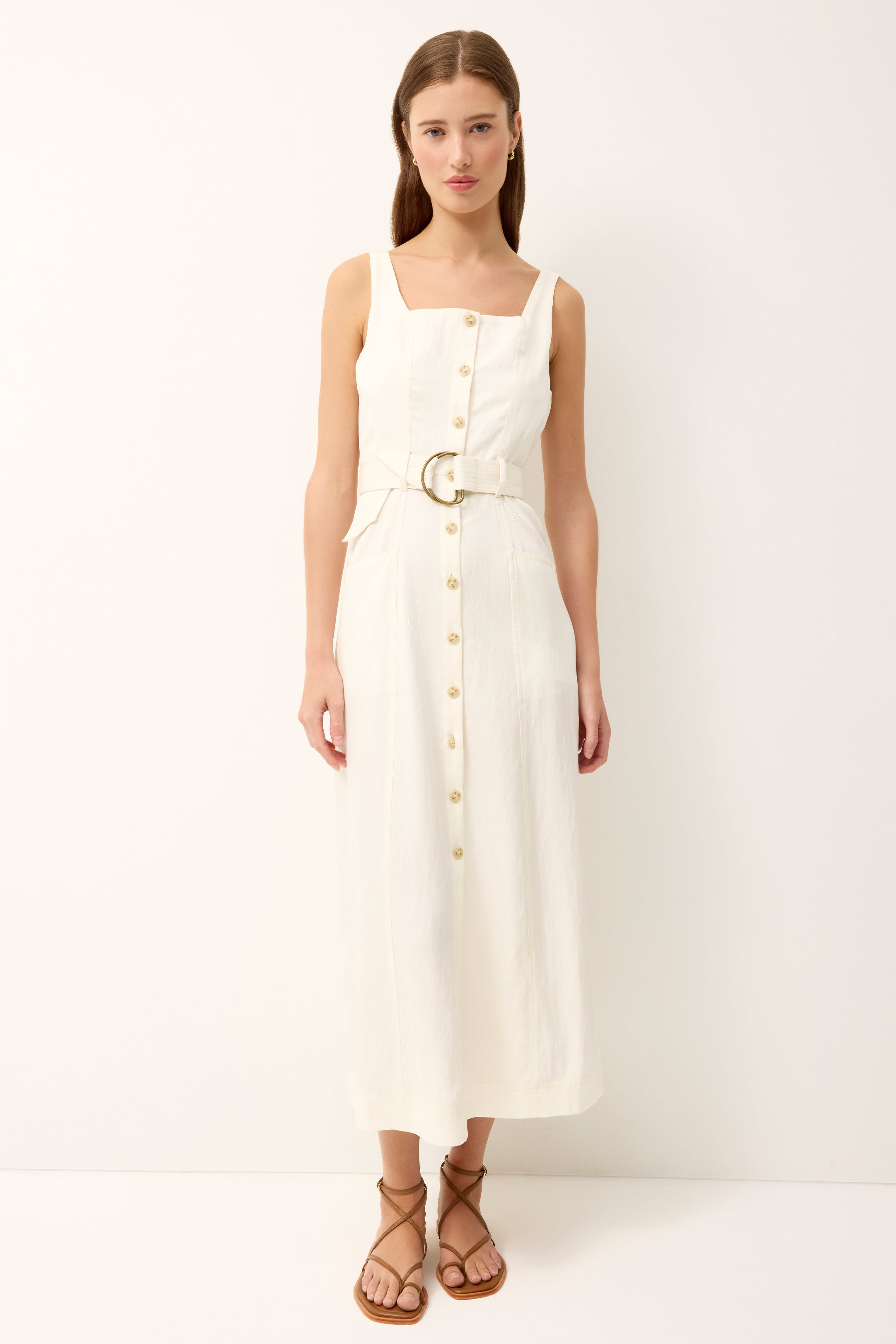 Equal parts polished and practical, this soft yet structured sundress features a button-front placket, apron-style pockets, and a bra-friendly silhouette. Rendered in timeless white, the easy midi length transitions seamlessly from spring into summer, and makes a perfect addition to any vacation suitcase.