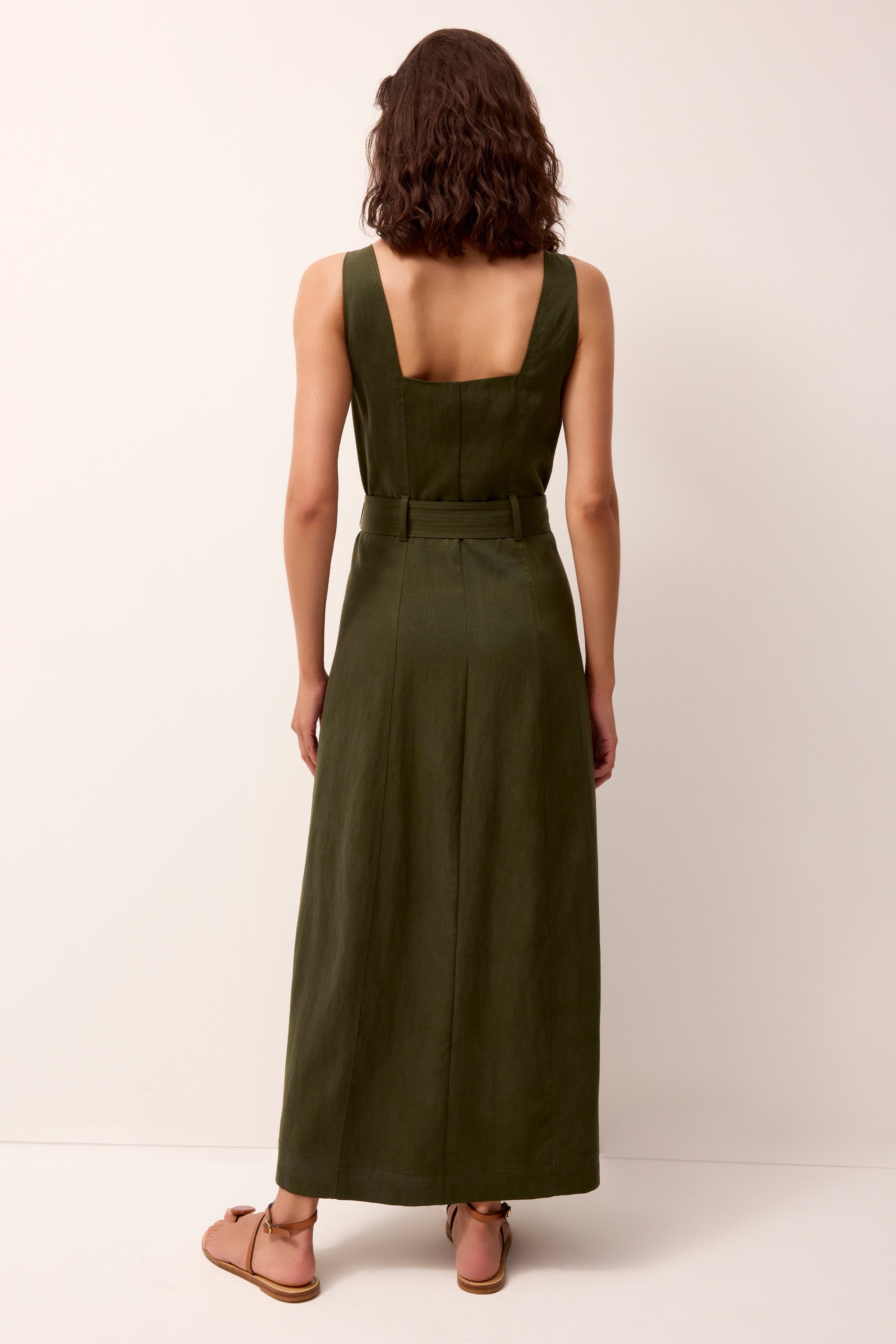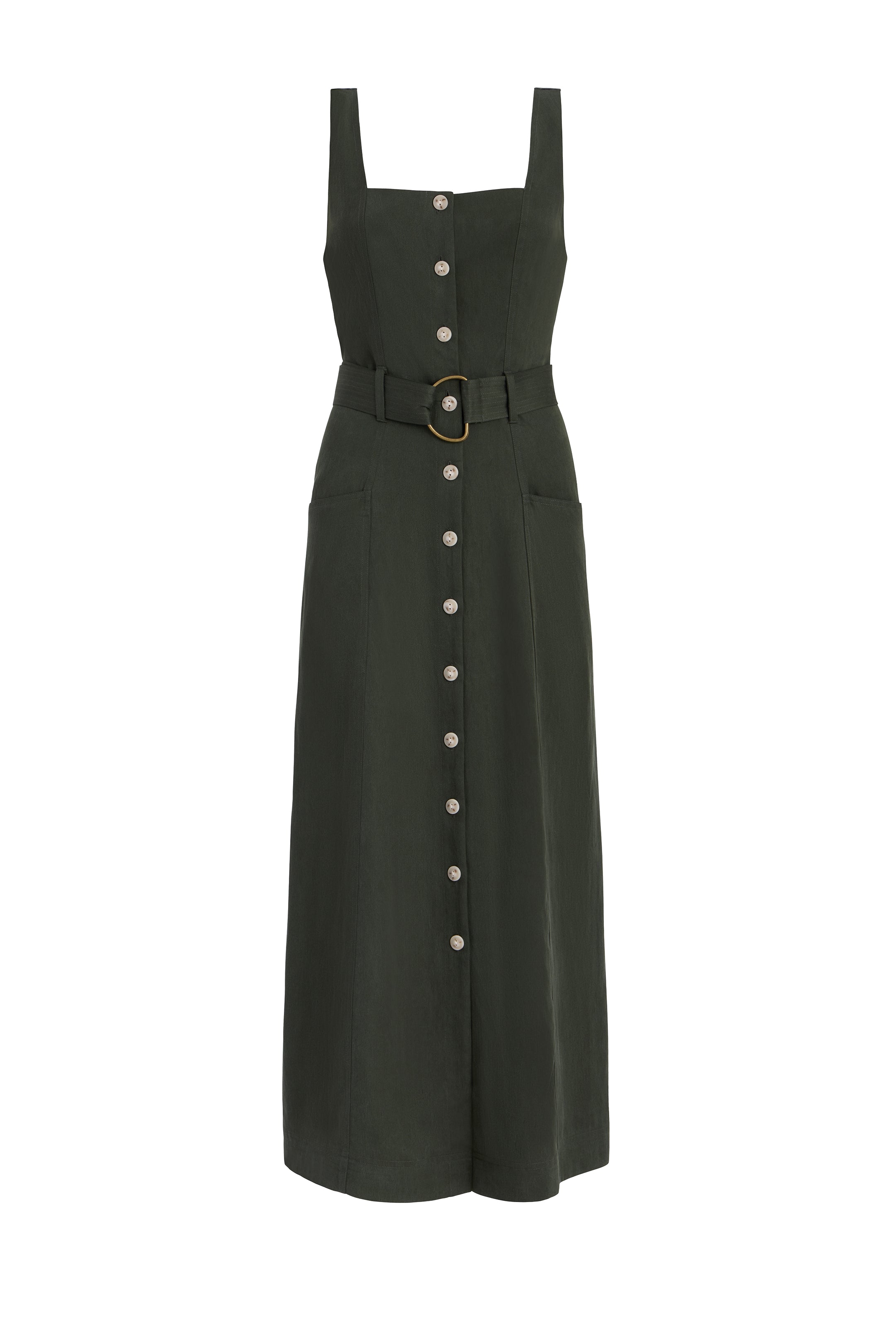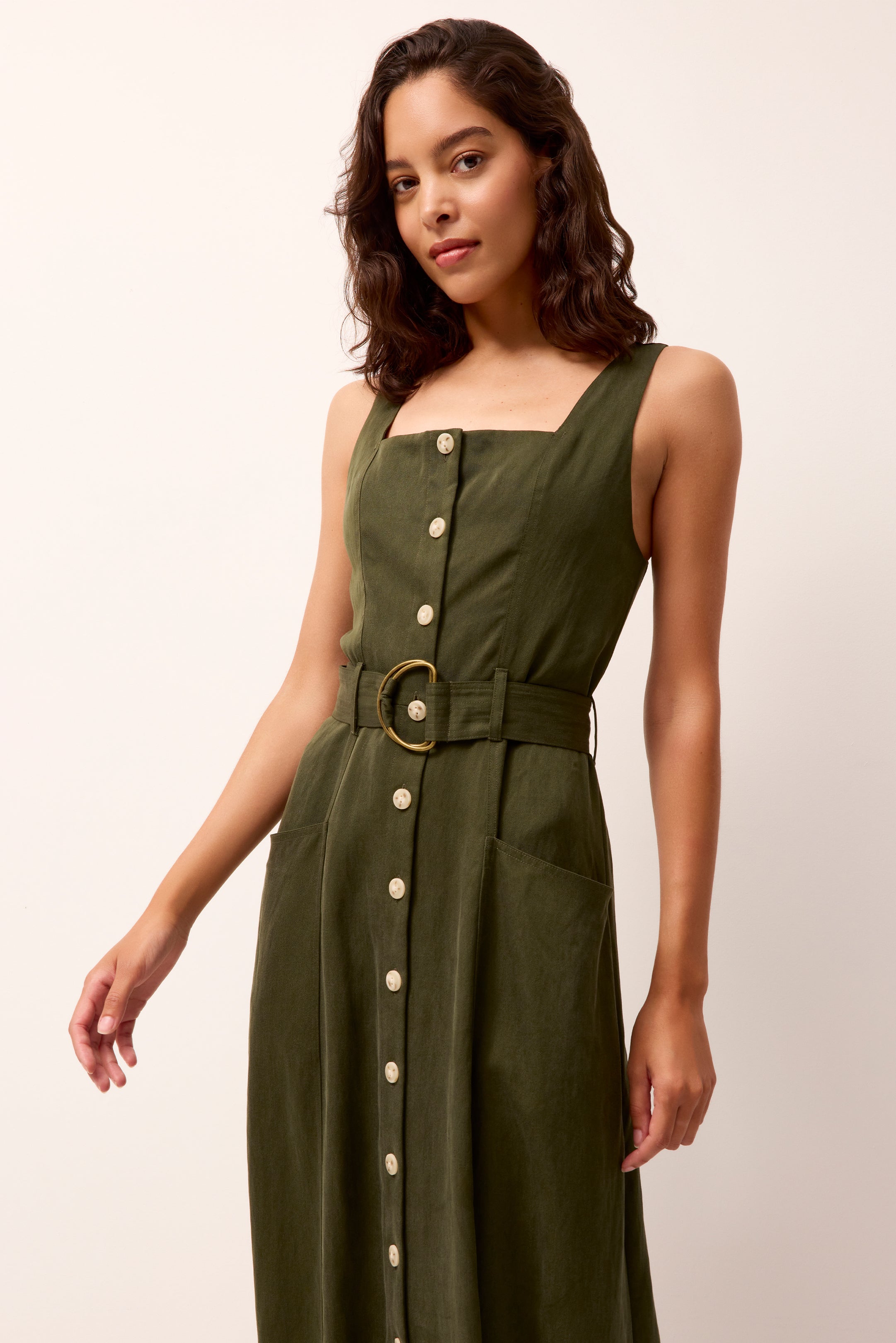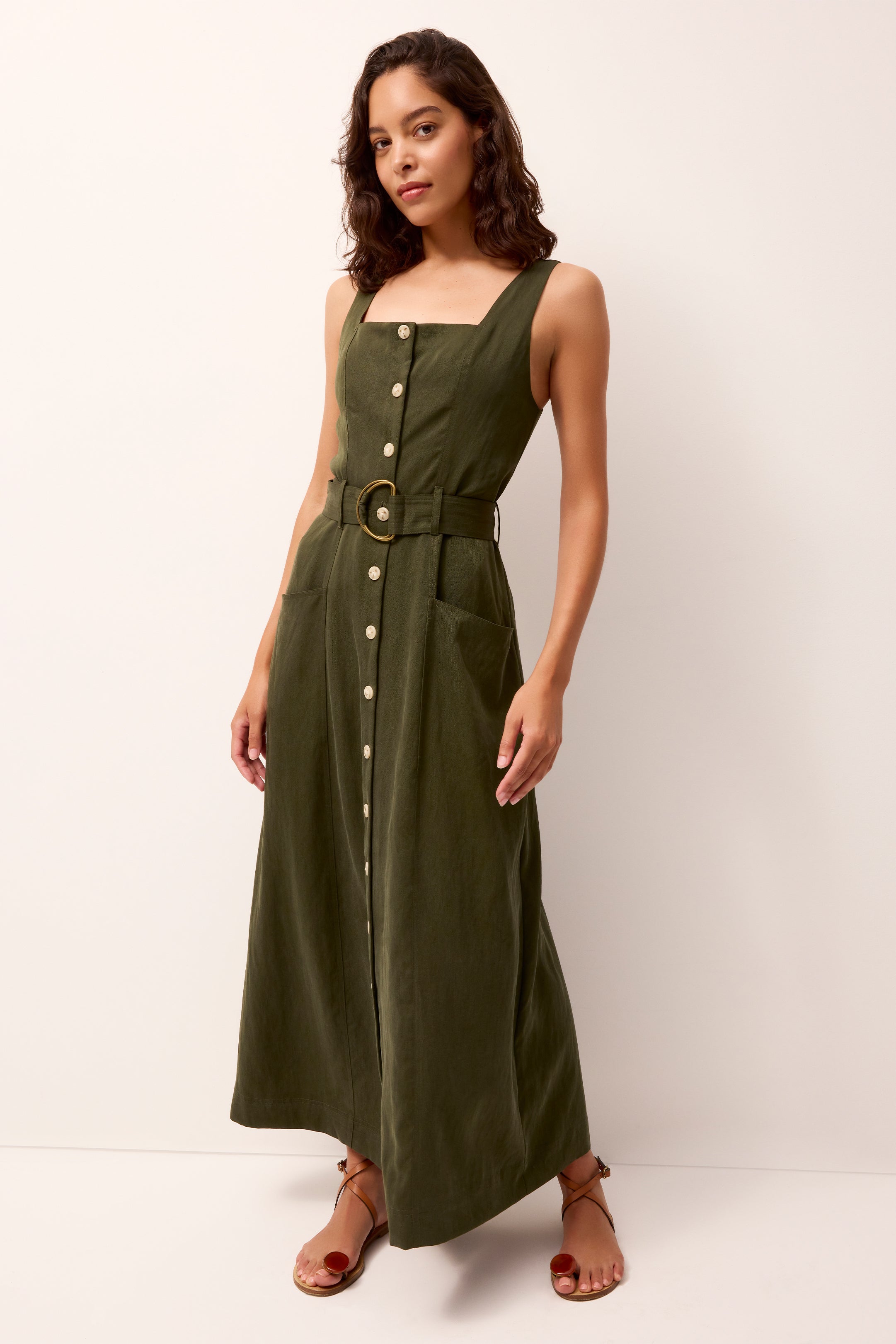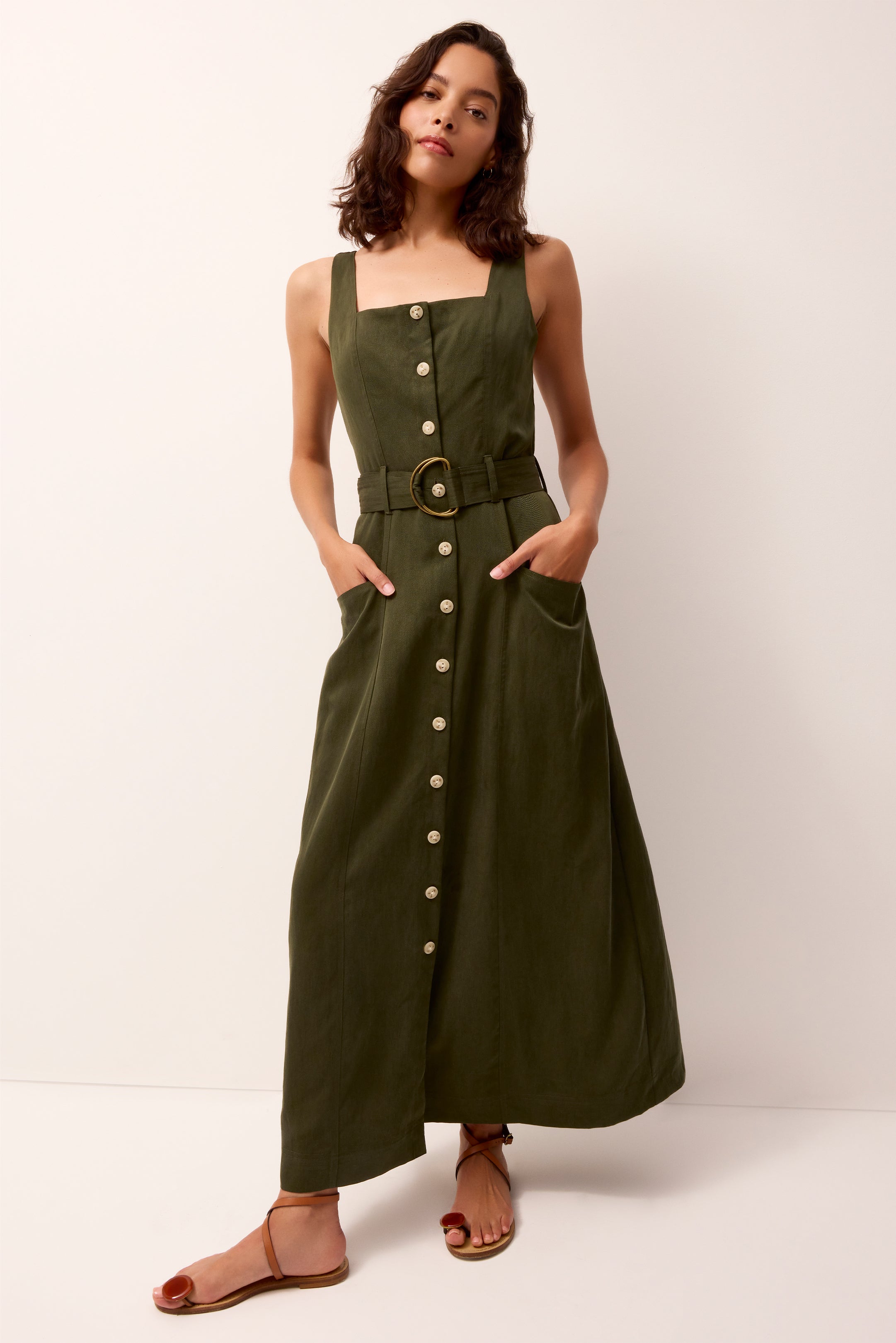 Equal parts polished and practical, this soft yet structured sundress features a button-front placket, apron-style pockets, and a bra-friendly silhouette. Rendered in a rich moss green, the easy midi length transitions seamlessly from late summer into early fall.