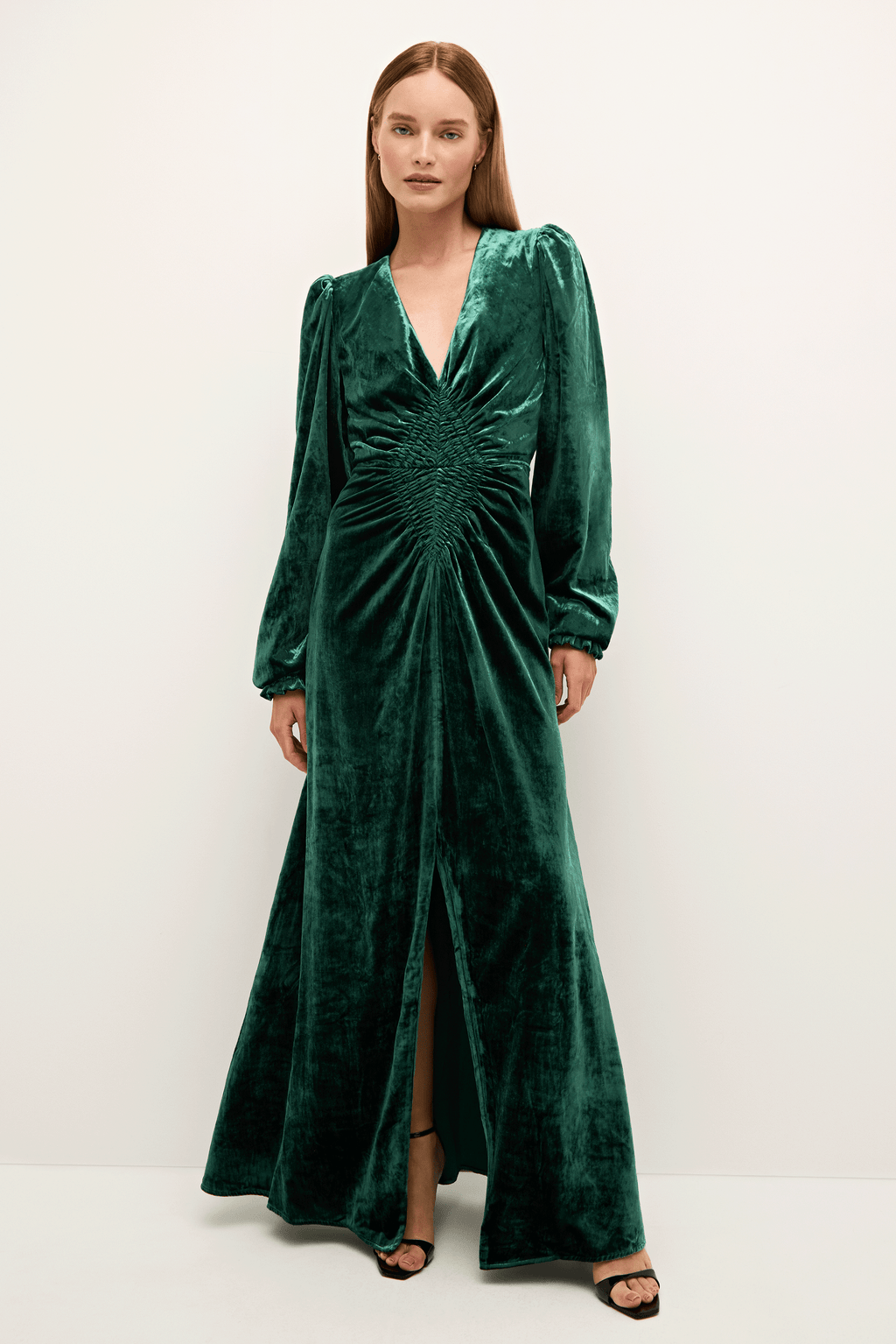 Elegant and easy with puff sleeves, side seam pockets, an elastic smocked waist, and a shallow v-neck, this effortless maxi is holiday party-ready in our woodsy Rosin green.