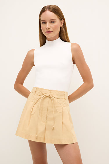 Cut in a lightly compressive rib knit, our sleeveless mock neck tank has become something of a staple at Marie Oliver. Its 90s-inspired look tucks beautifully into structured shorts, skirts, and wide-leg pants alike. Now in timeless Cool White, replace your basic tees with this modern must-have.