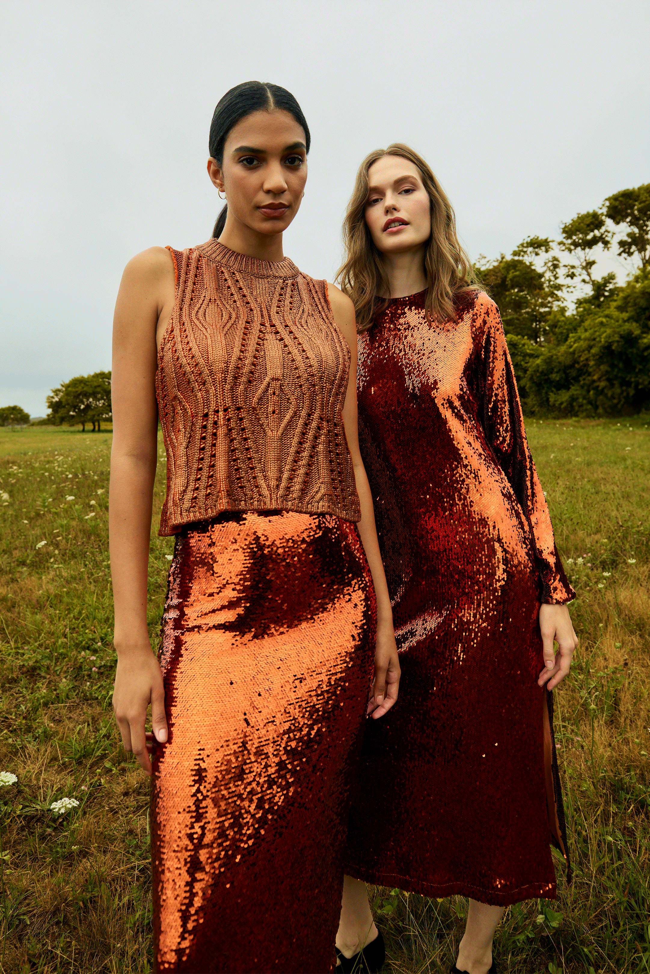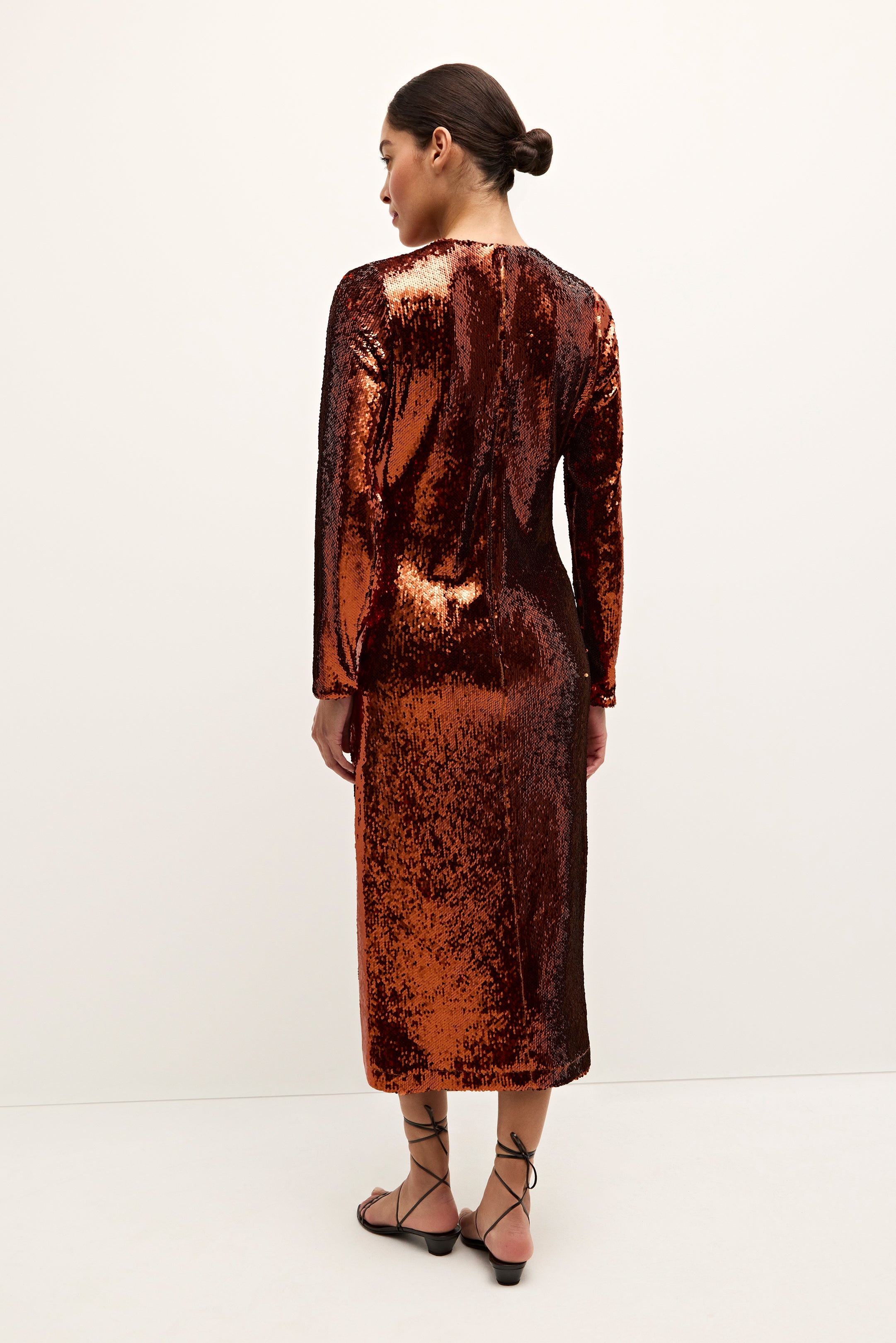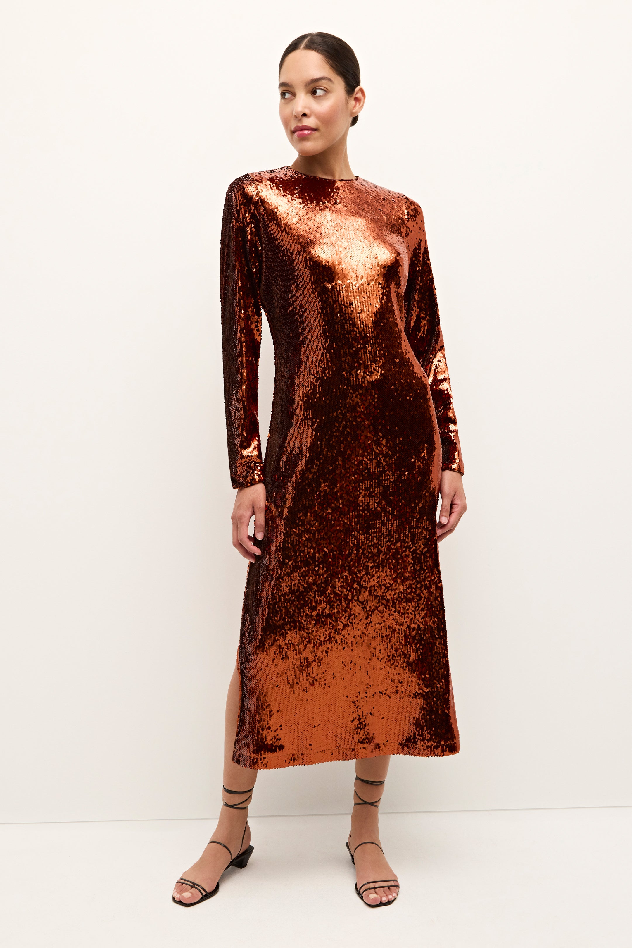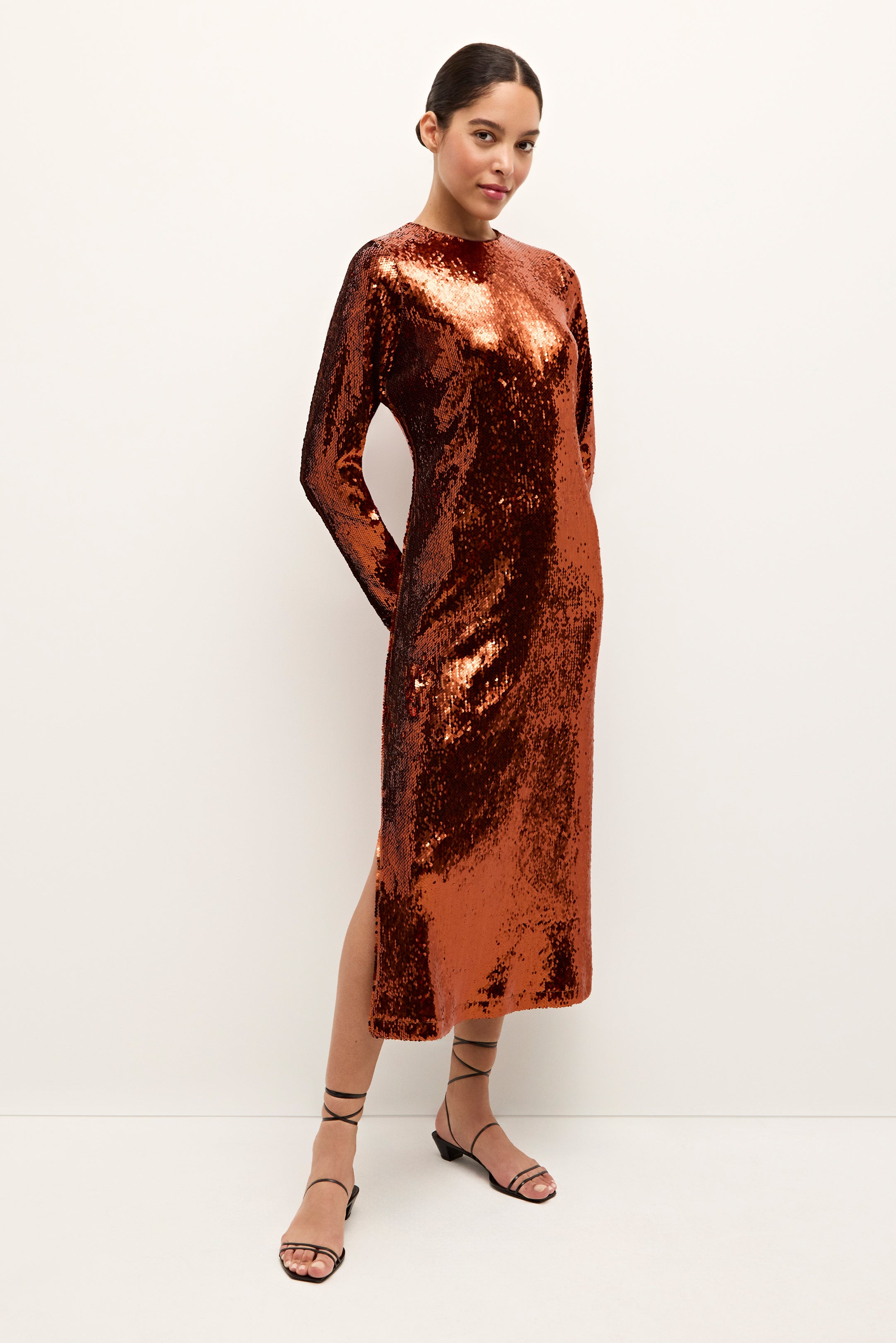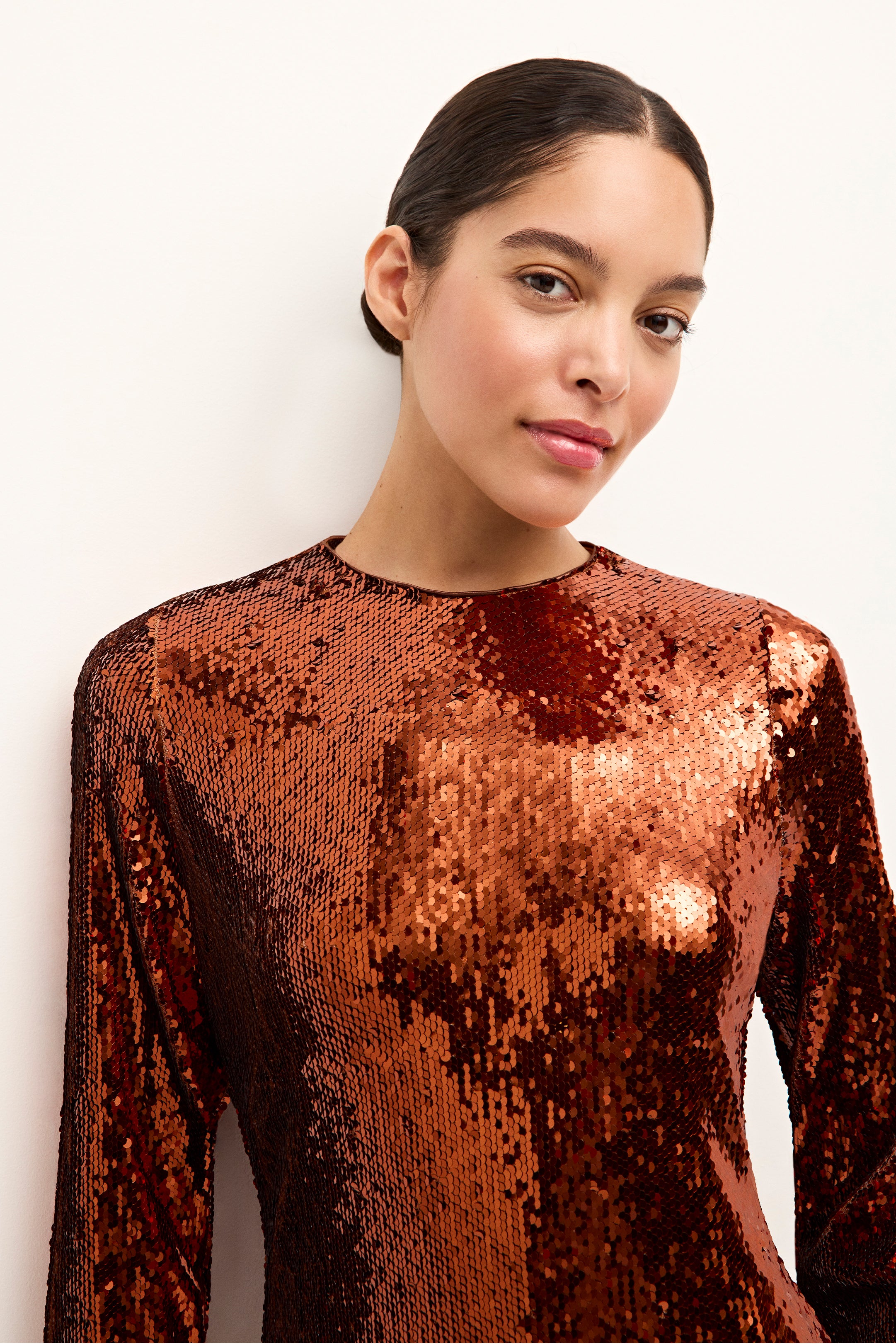This simple crewneck dress is the perfect canvas for head-to-toe sequins—no extra embellishment necessary. And in a warm Cinnamon hue, the stylish silhouette delivers instant autumn glamor.