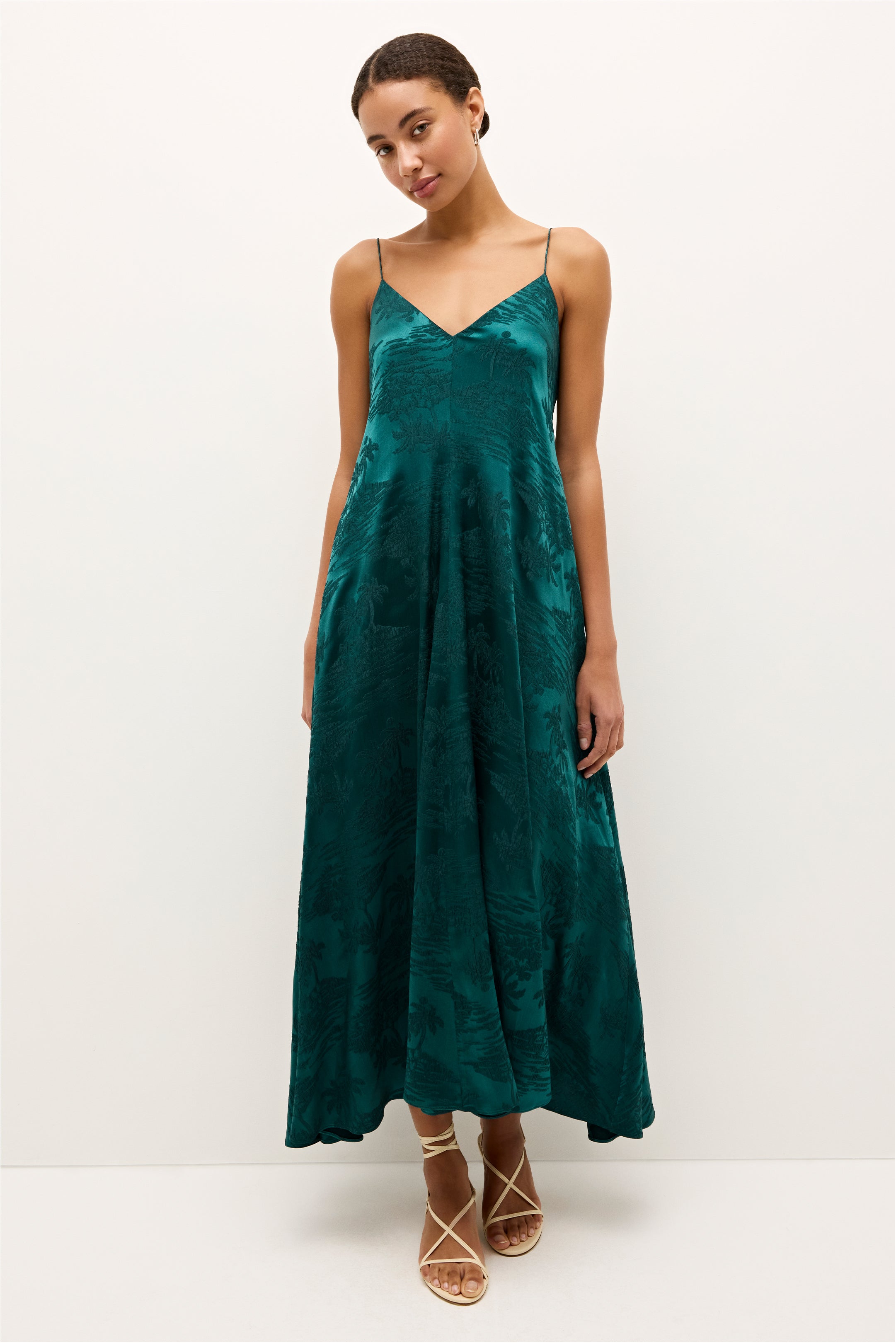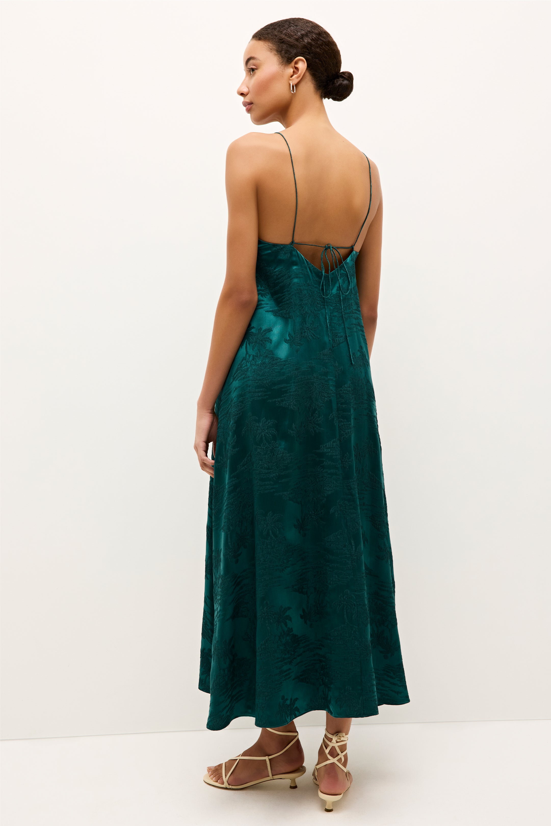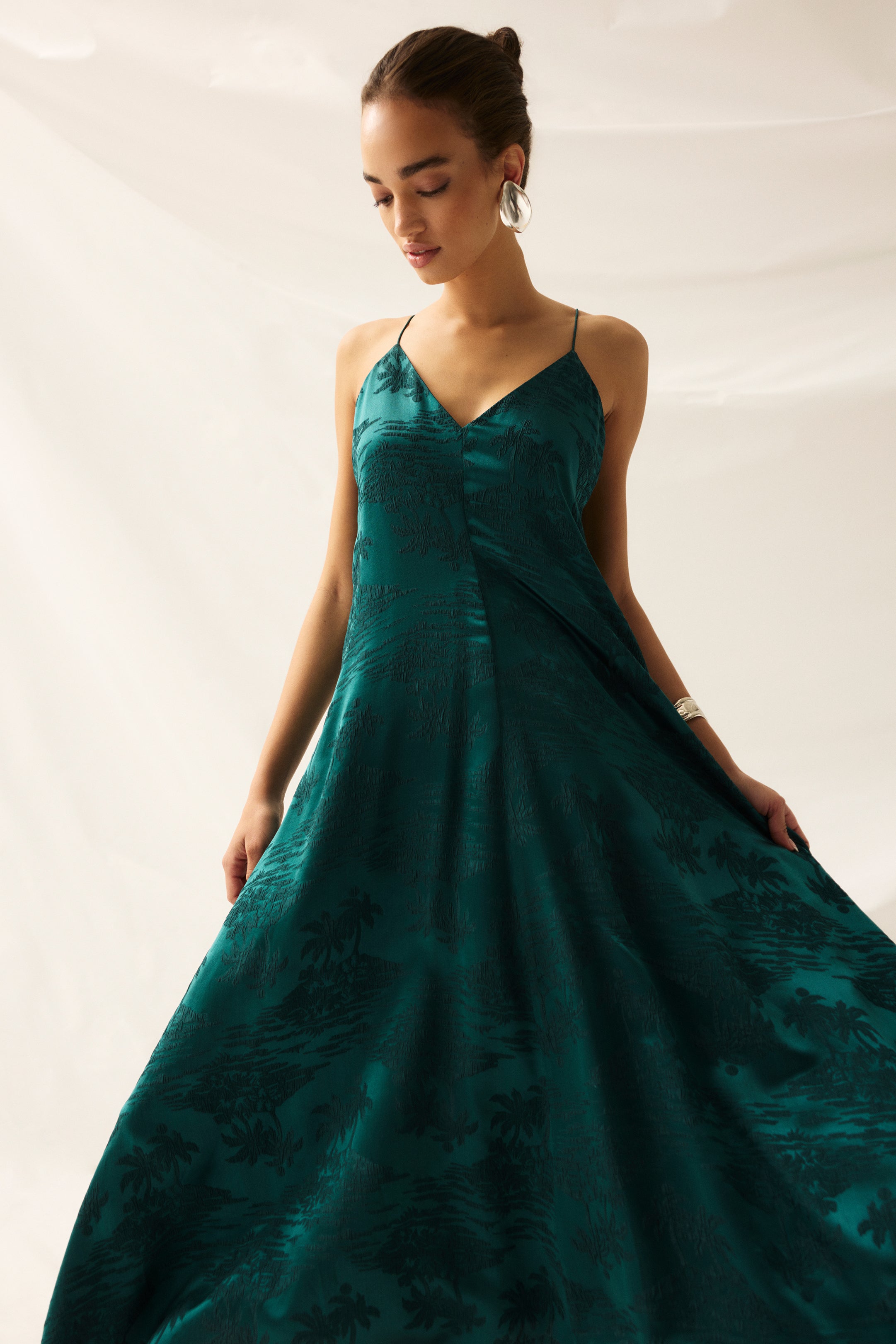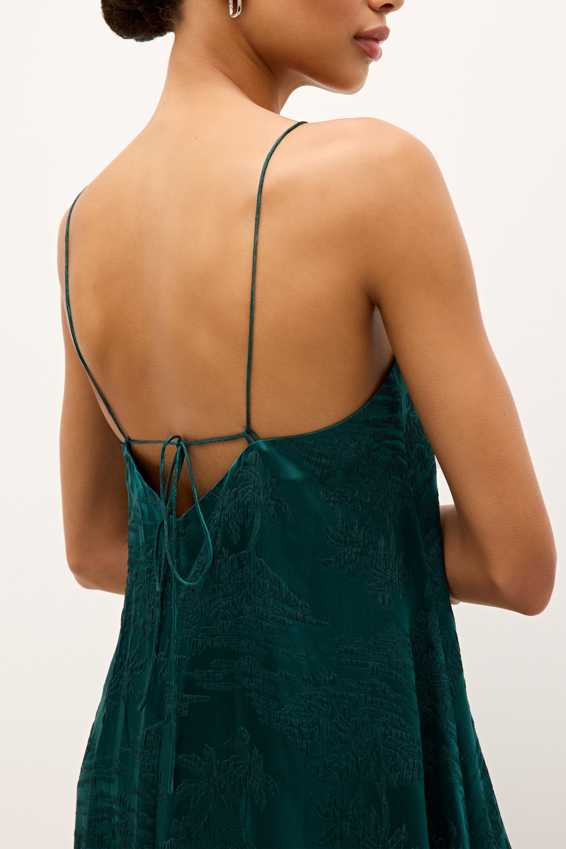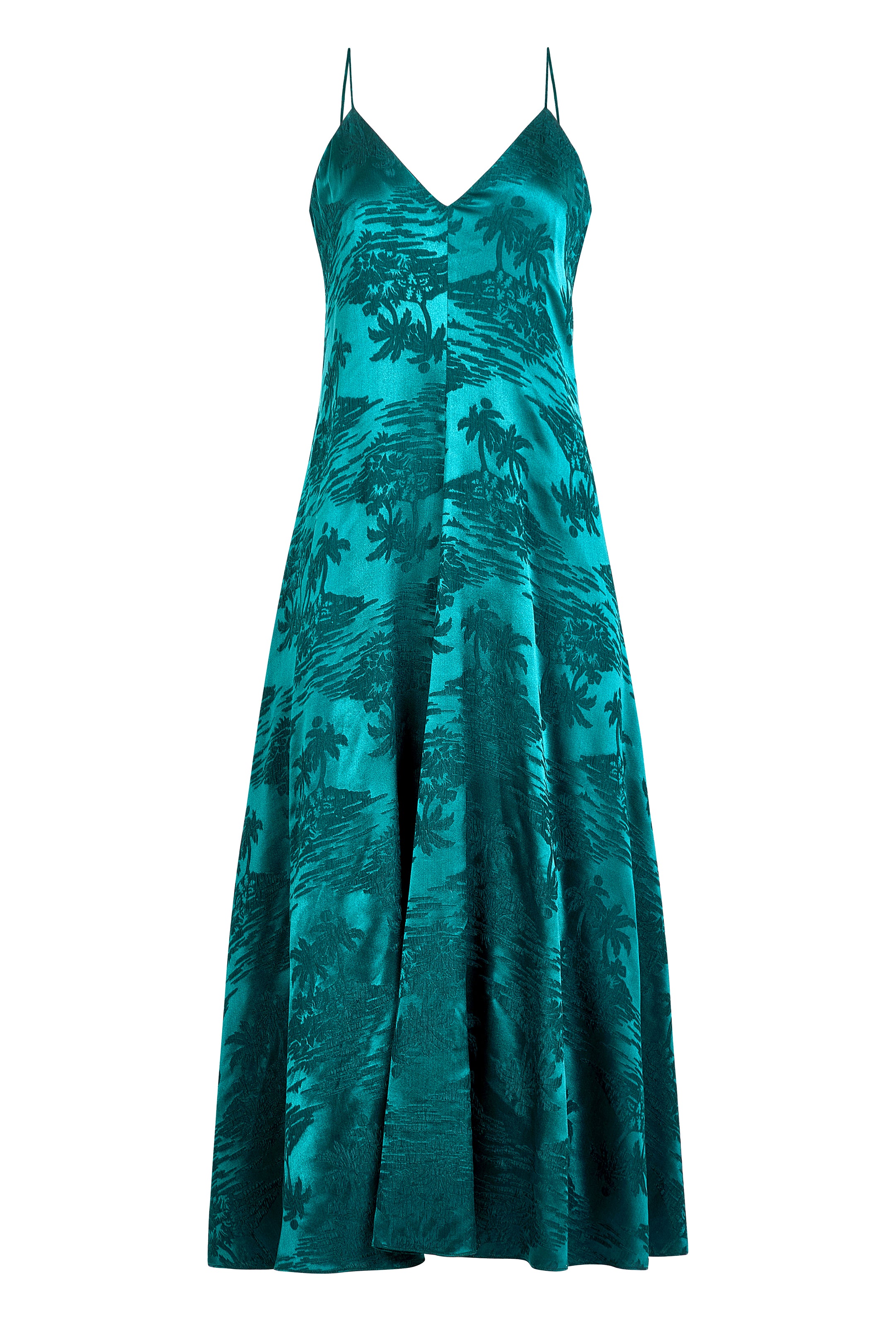 Our slinkiest silhouette to date, the Levine dress, which features a flattering v-neck at both front and back, adjustable spaghetti straps, and a relaxed silhouette, is a team favorite, winning extra style points for the palm-printed silk jacquard fabric in a deep sea green.