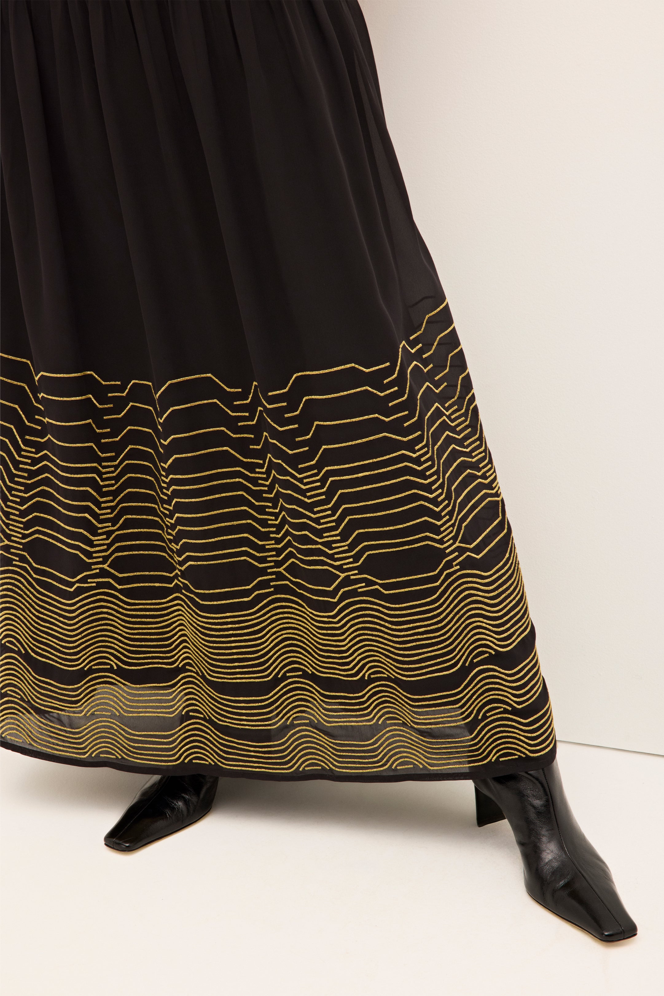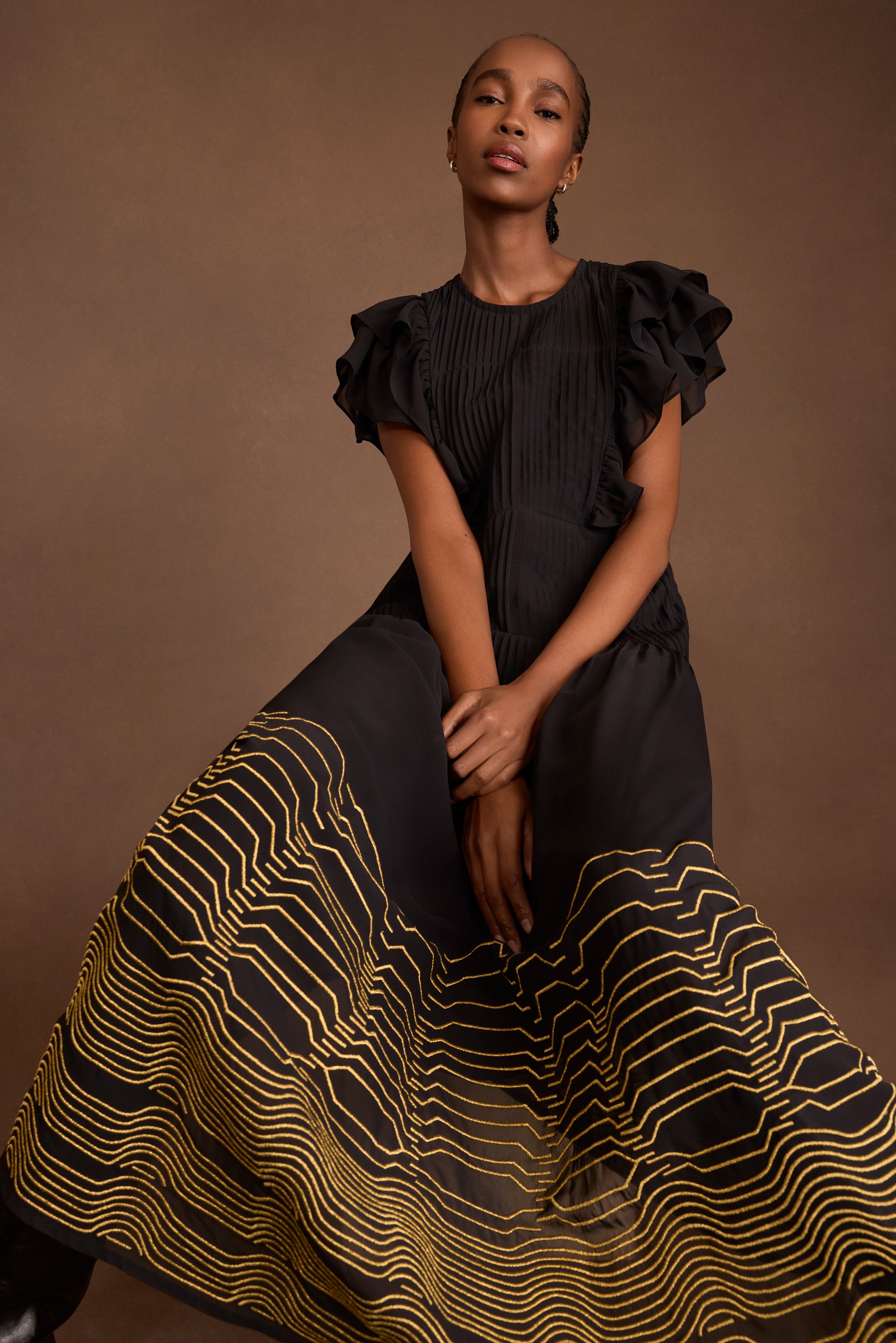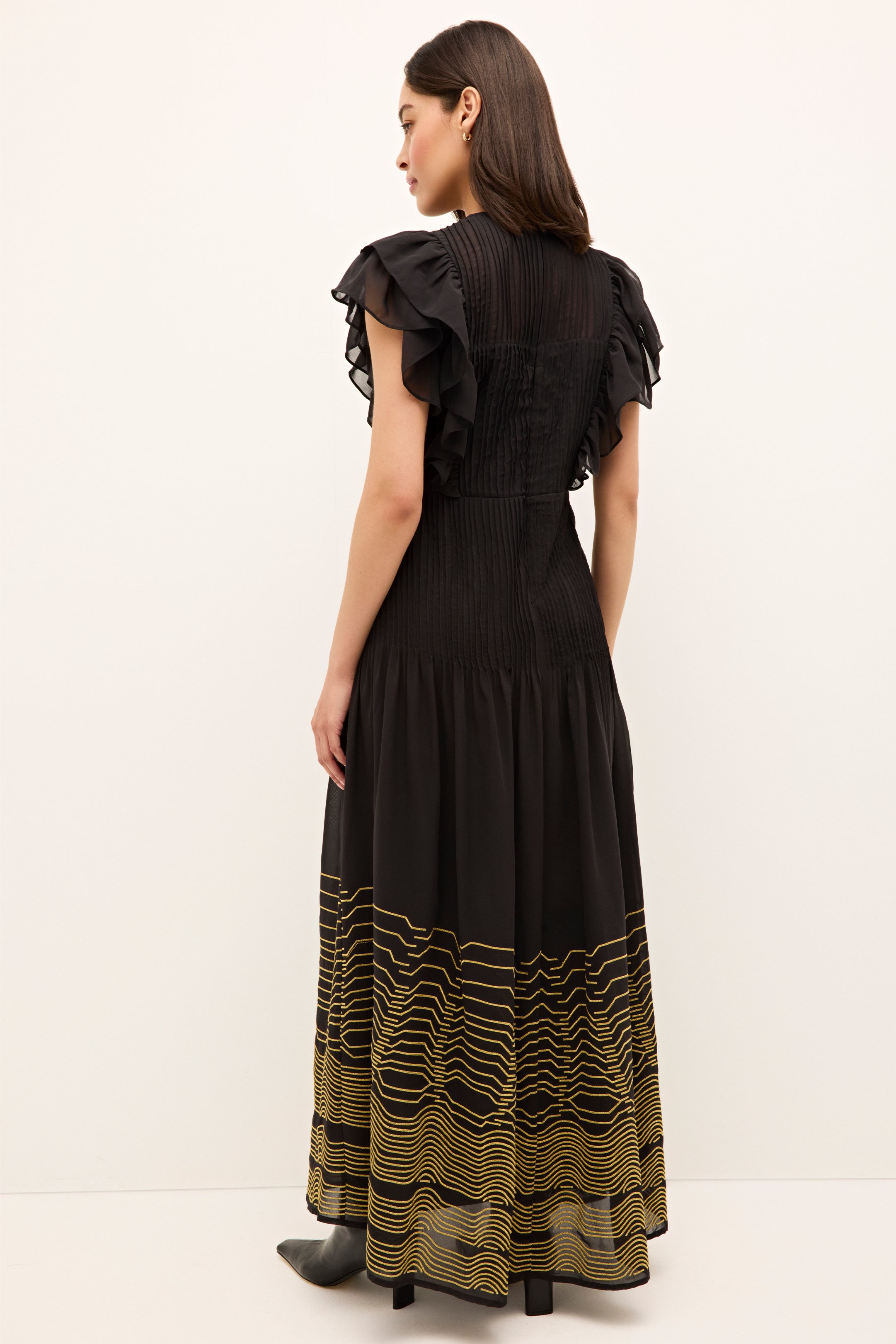 Consider your fall and winter wedding attire sorted with Winfrey. This dramatic maxi is designed with pintuck pleating through the bodice and hips and finished with romantic flutter sleeves. A classic black ground embroidered in metallic gold creates a striking visual that feels timeless and celebratory.