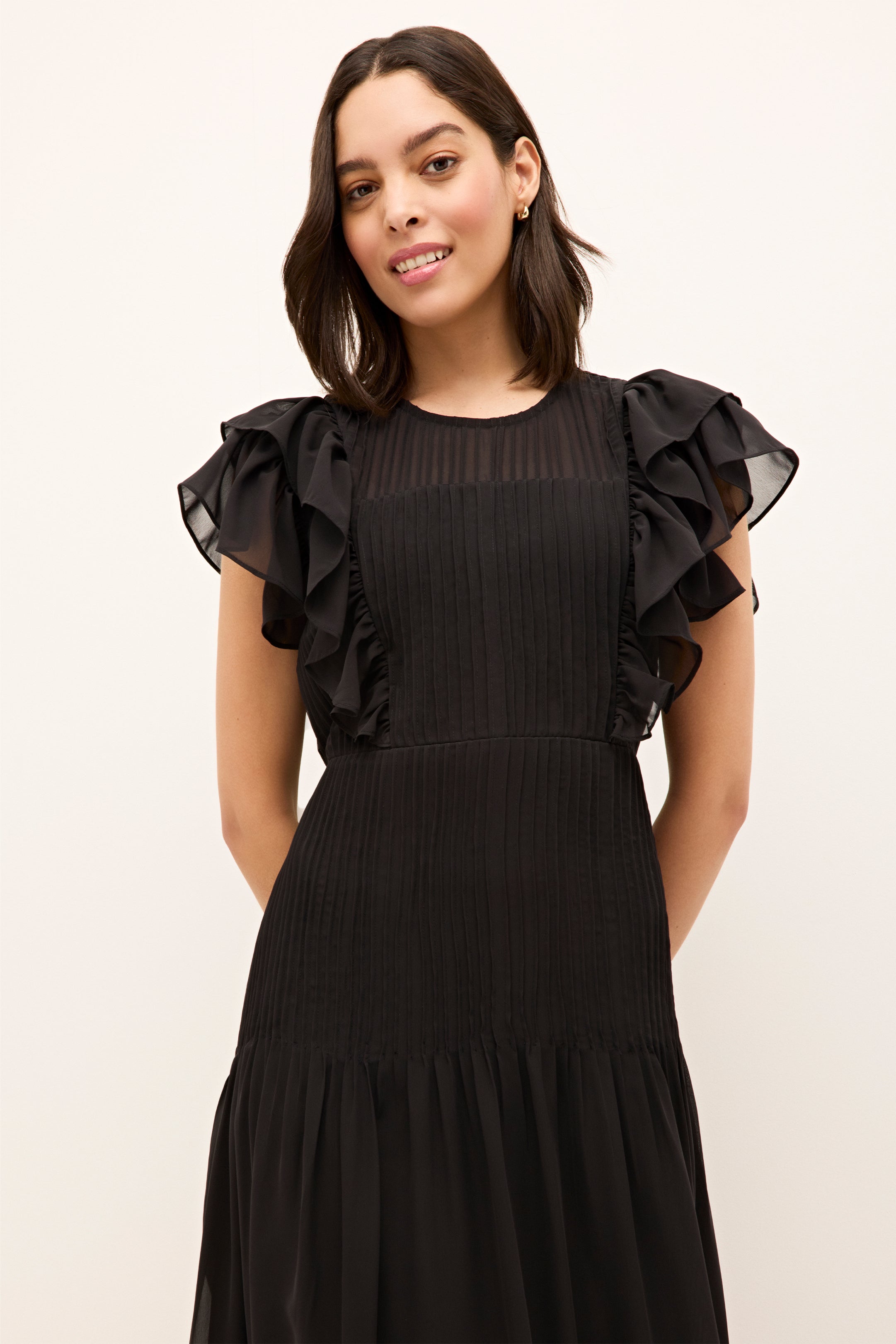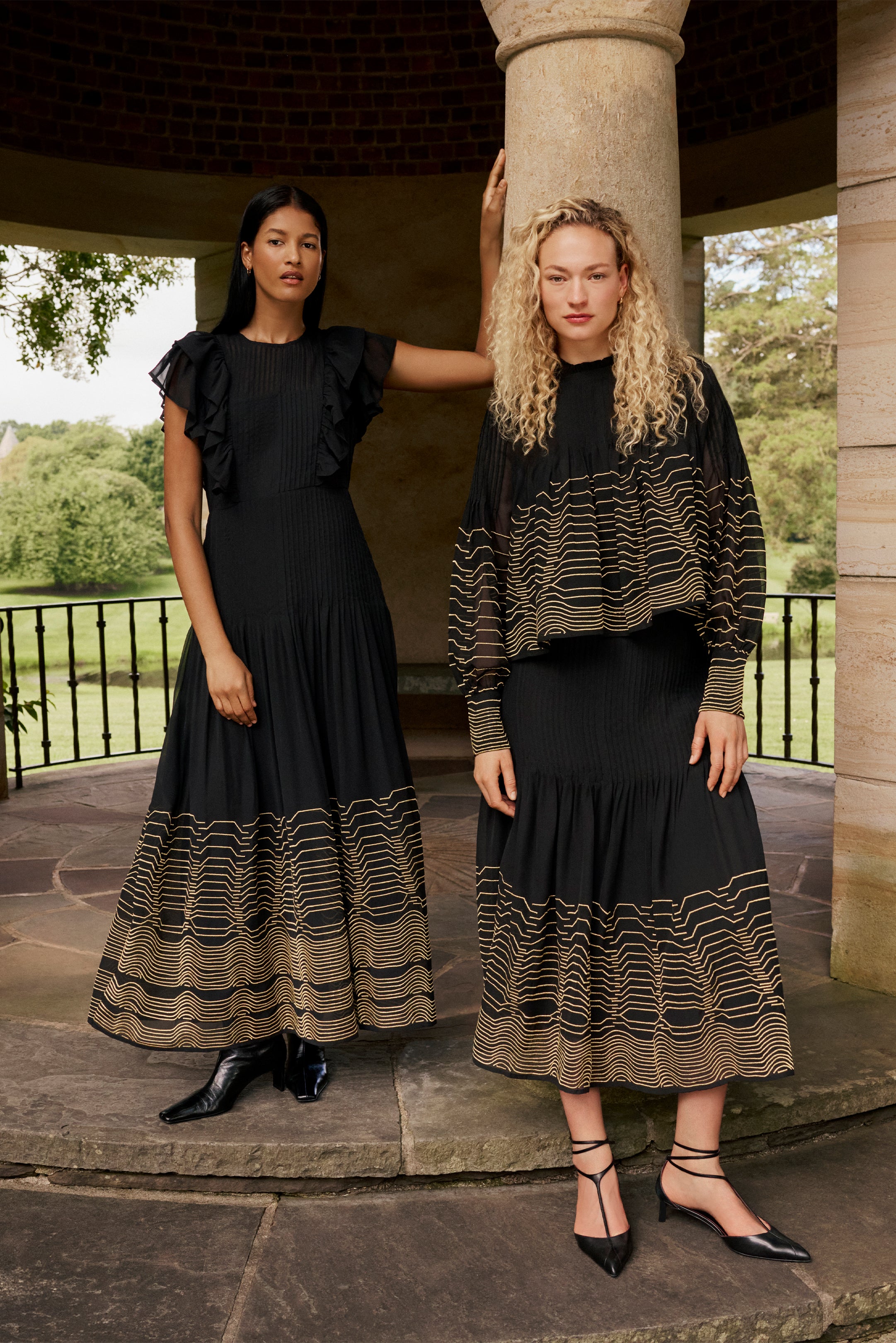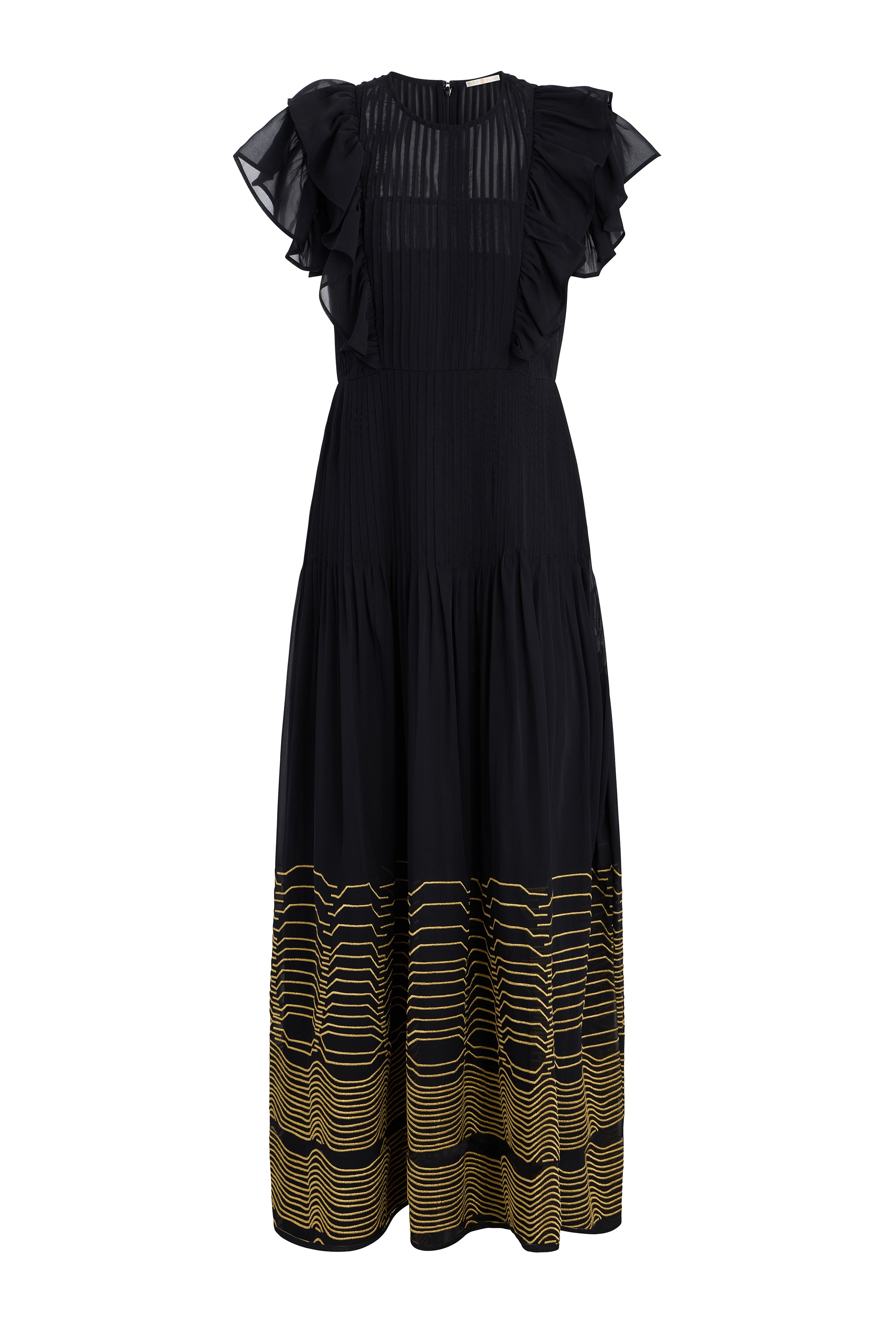 Consider your fall and winter wedding attire sorted with Winfrey. This dramatic maxi is designed with pintuck pleating through the bodice and hips and finished with romantic flutter sleeves. A classic black ground embroidered in metallic gold creates a striking visual that feels timeless and celebratory.