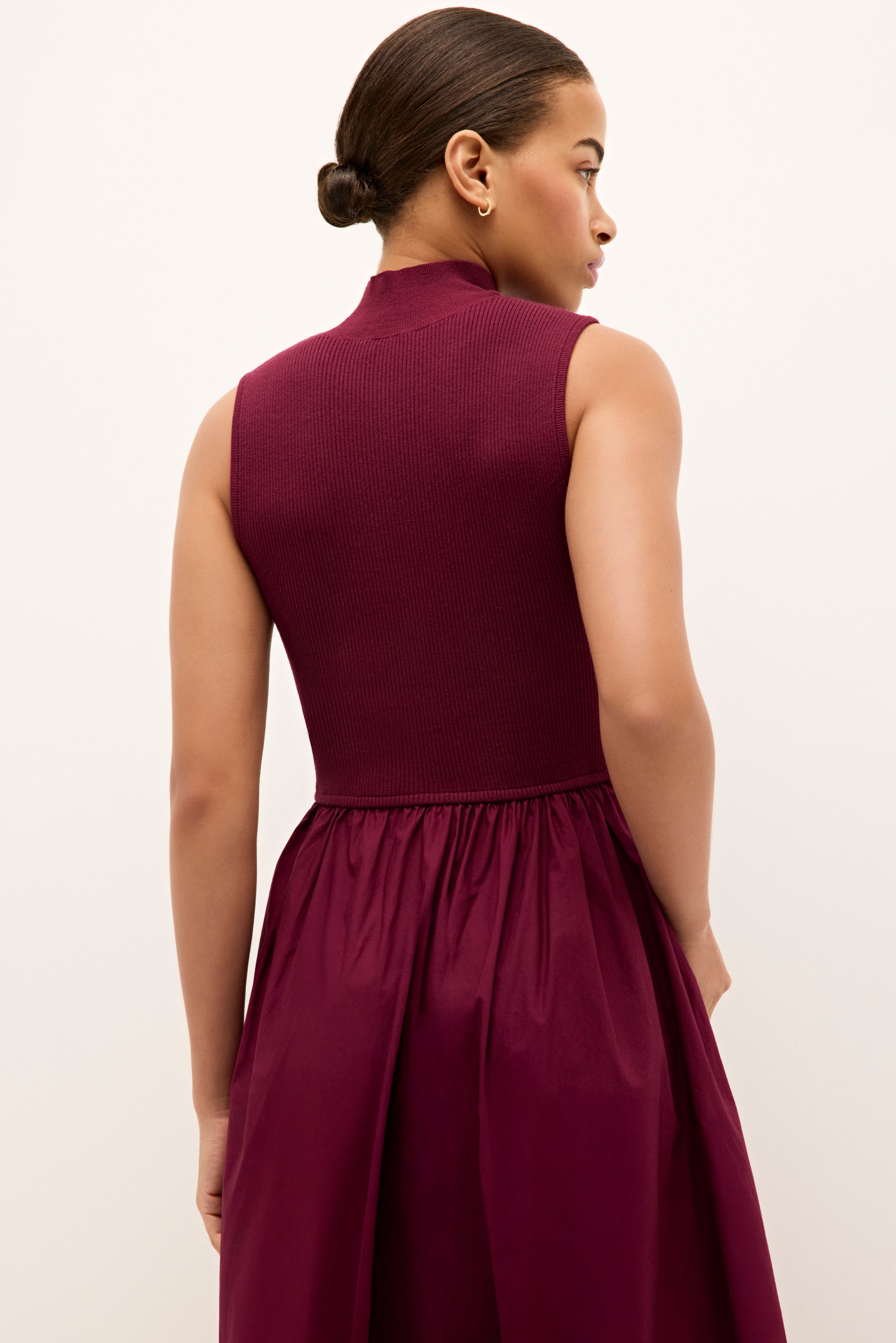 We reimagined the sleek lines of a mock turtleneck and figure-flattering bodice as a wear-everywhere maxi. With a full gathered skirt, mixed-media fabrics, and side pockets, this silhouette blends style and comfort in equal measure. Pictured here in Potion, a rich red-purple hue, Yana is poised to become a standout in your wardrobe.