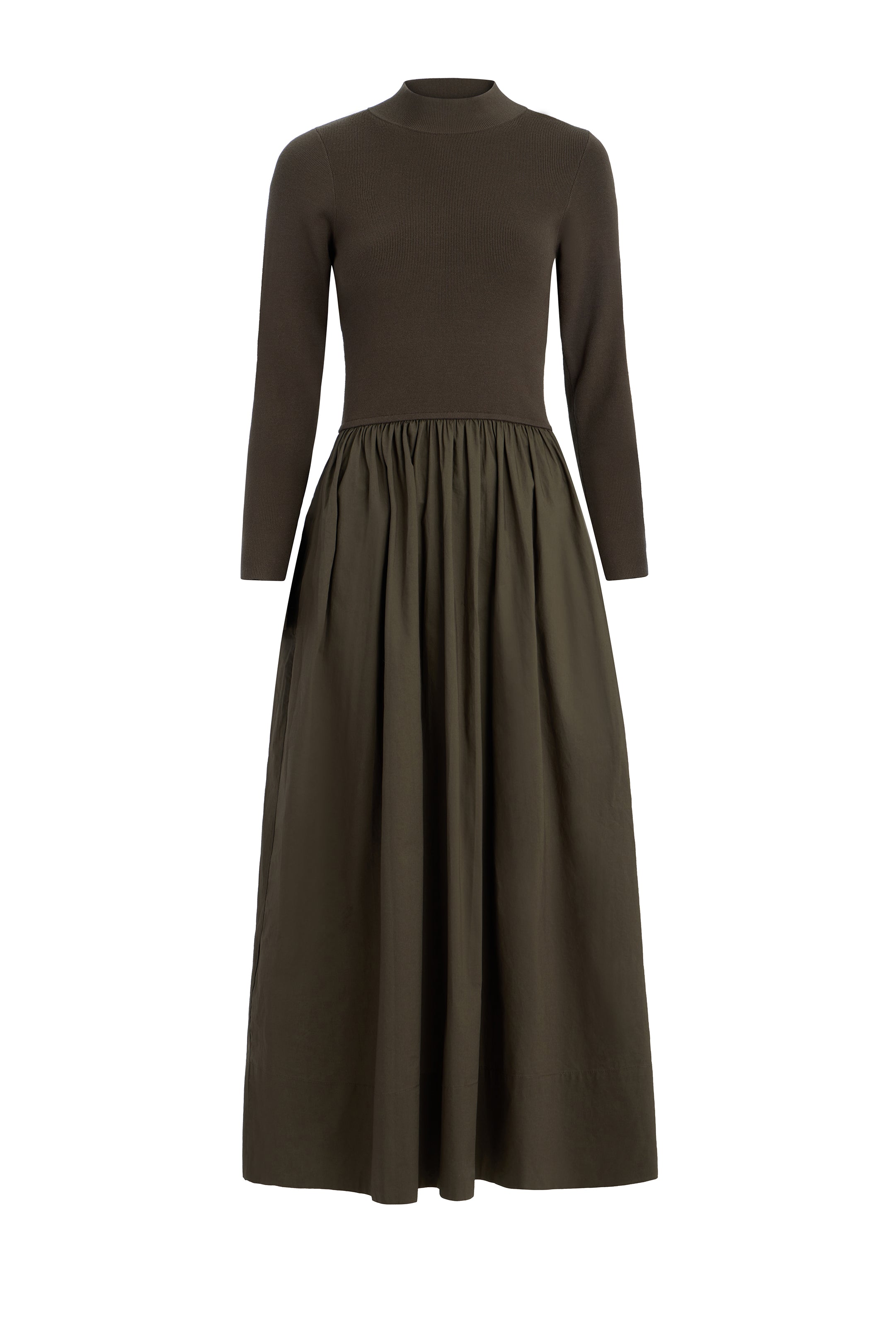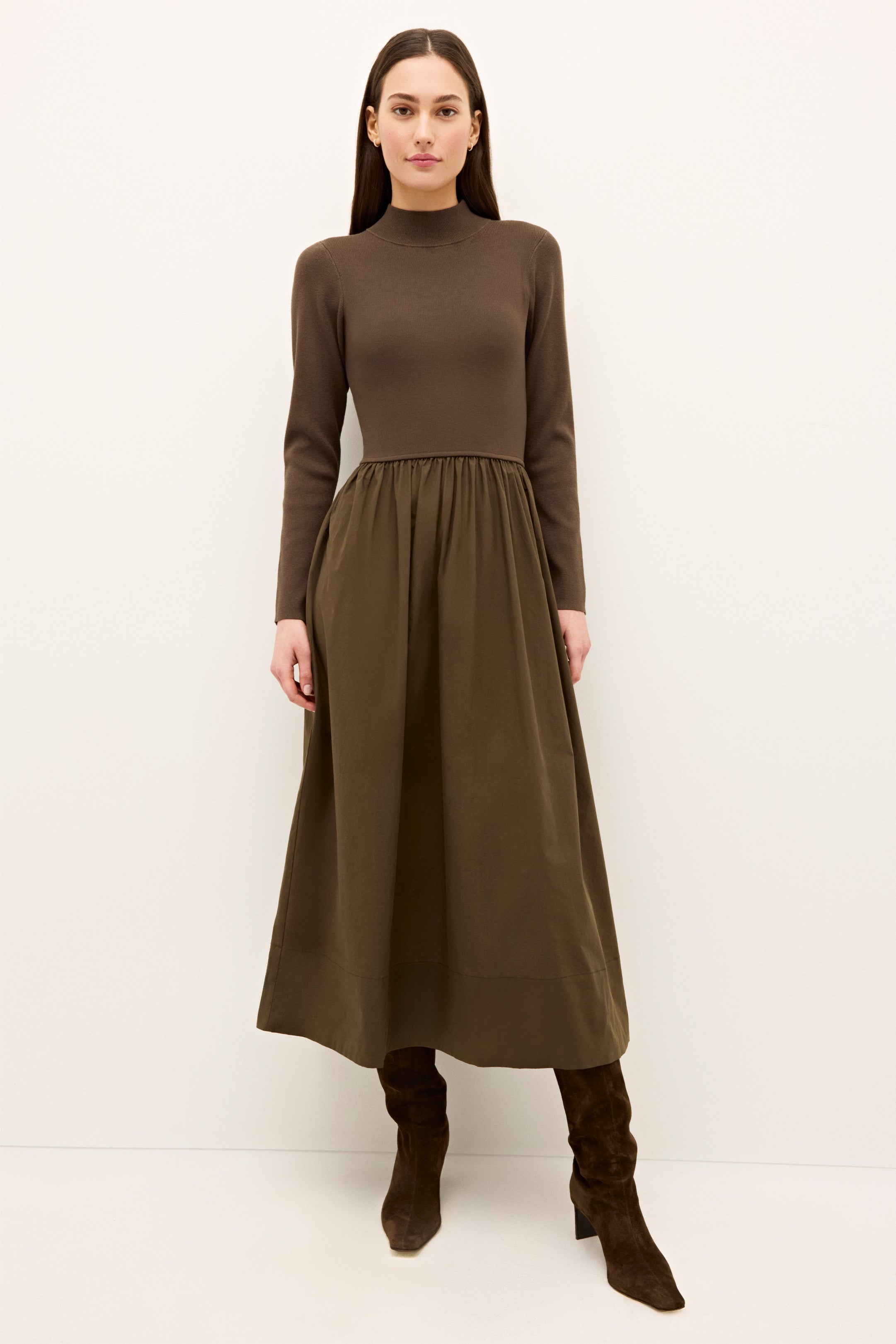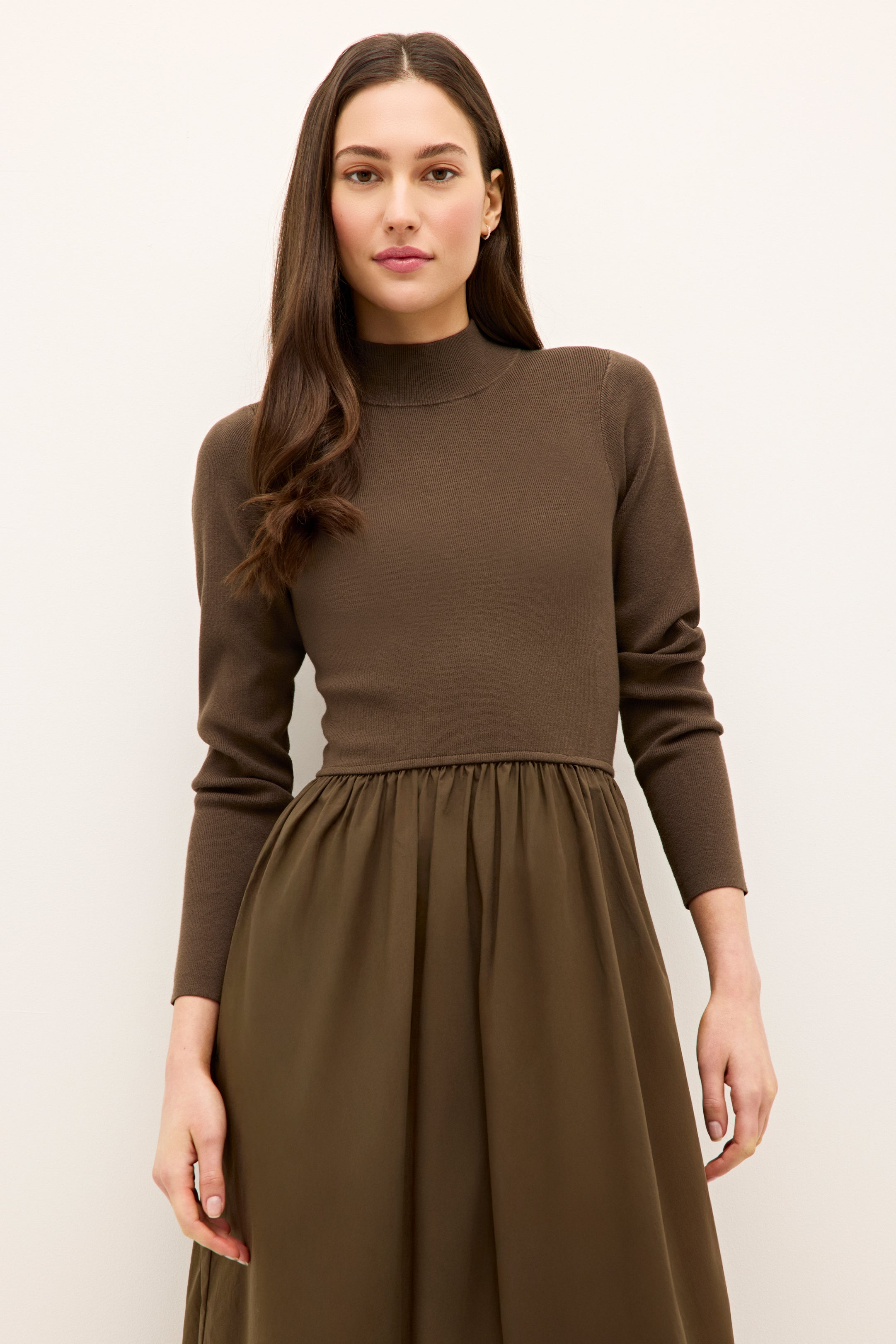 This stylish maxi dress features a mock turtleneck and a snug, figure-flattering bodice balanced by a full gathered skirt and side pockets. Equal parts chic and comfortable, the mixed-media silhouette is destined to become one of the most well-loved pieces in your closet. For extra warmth, layer on any of our seasonal vests, like Beatrice and Lyndon.