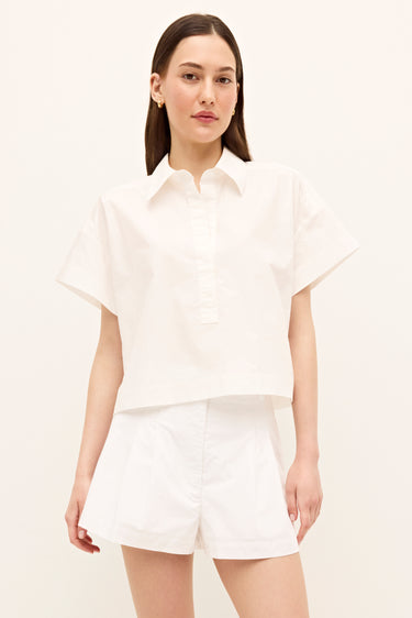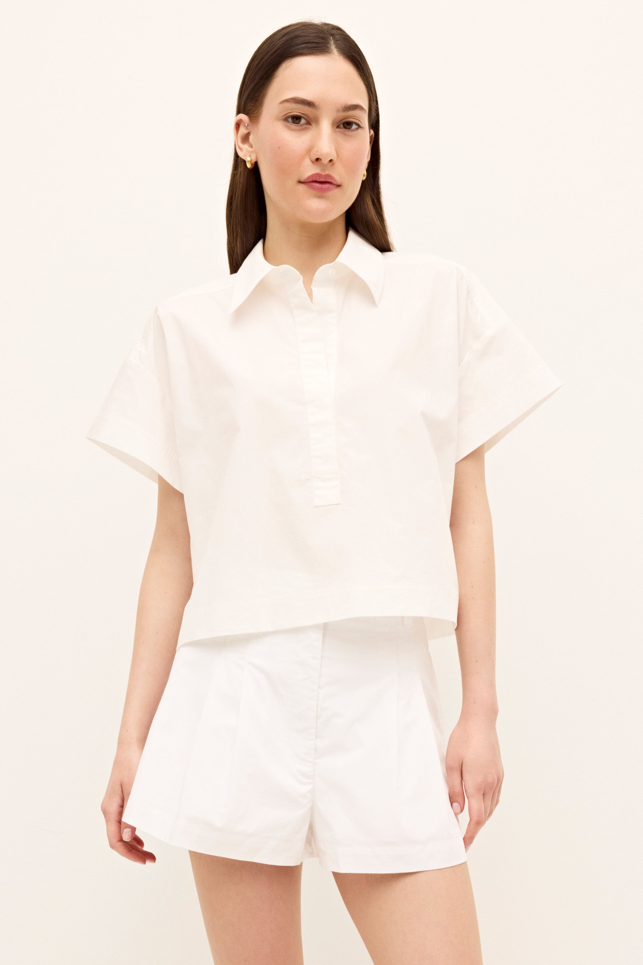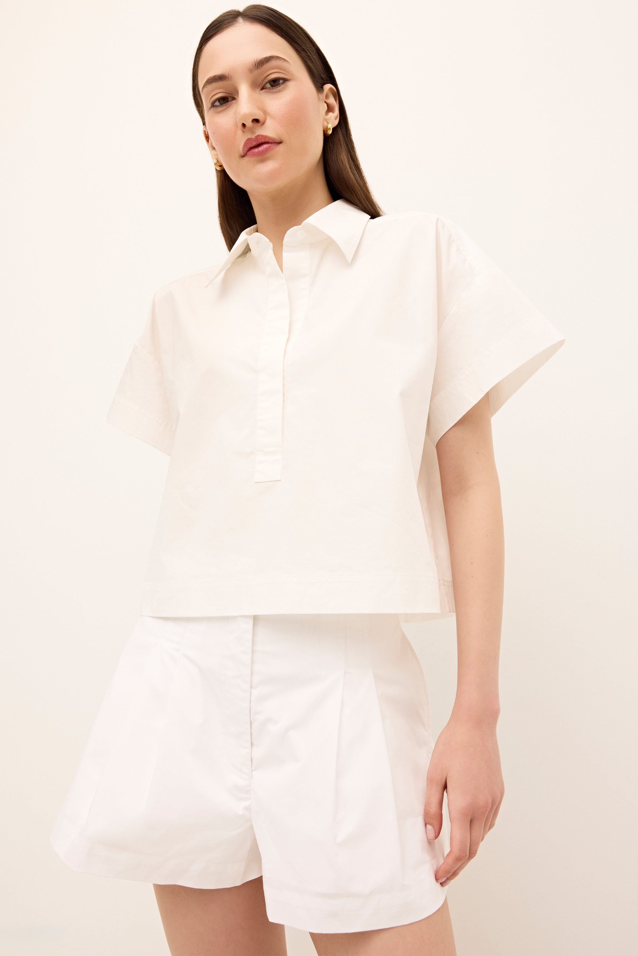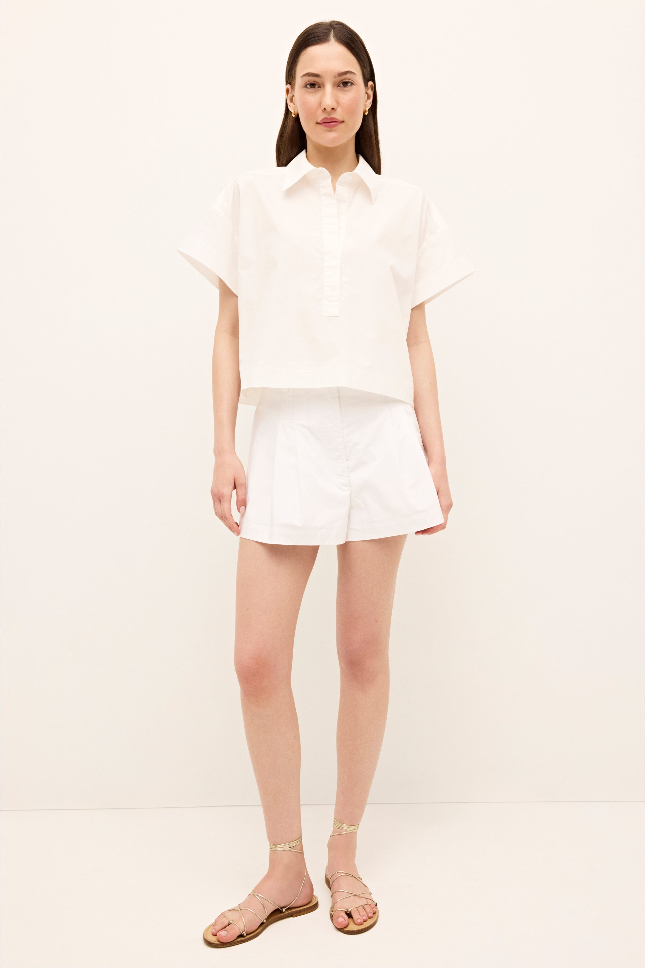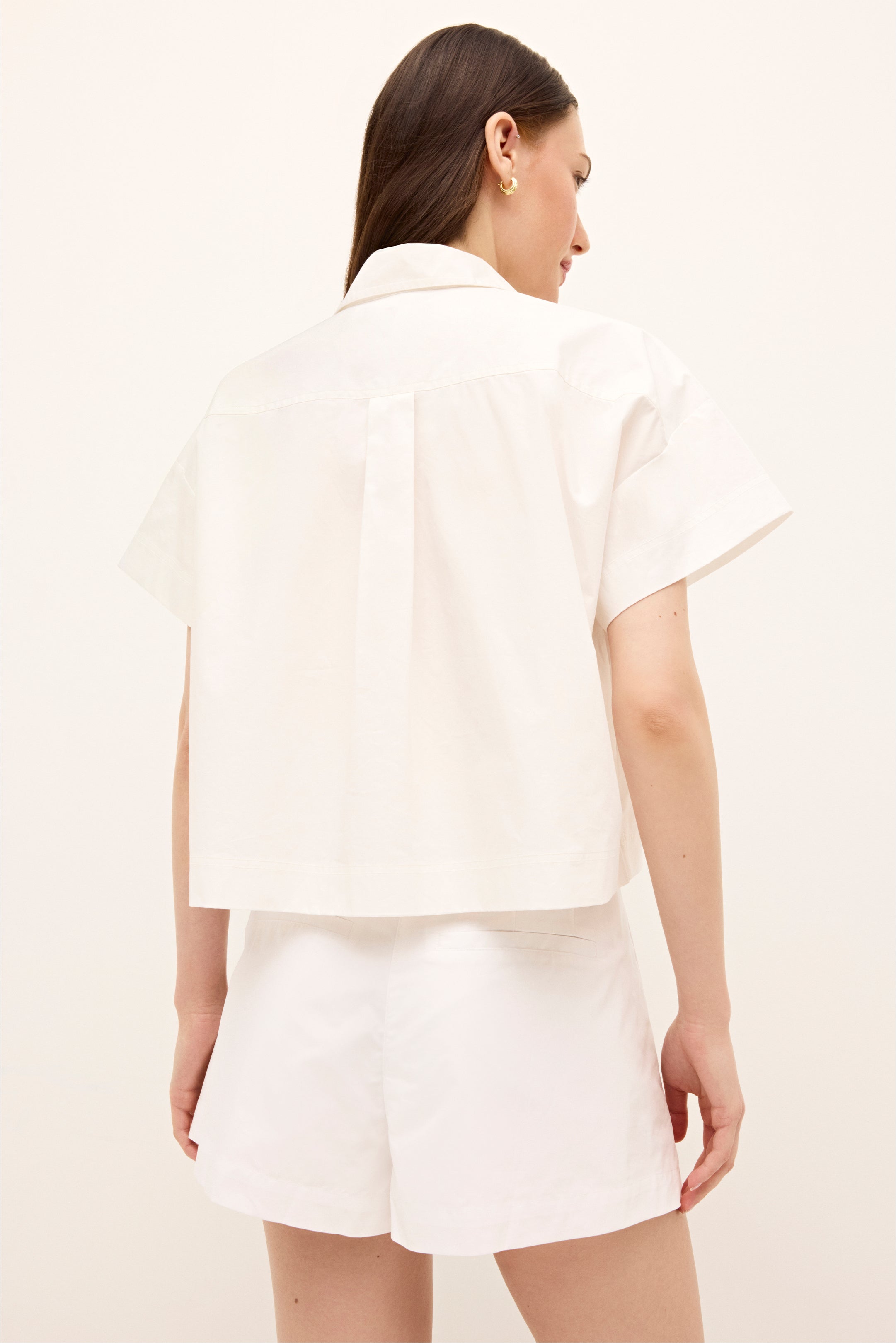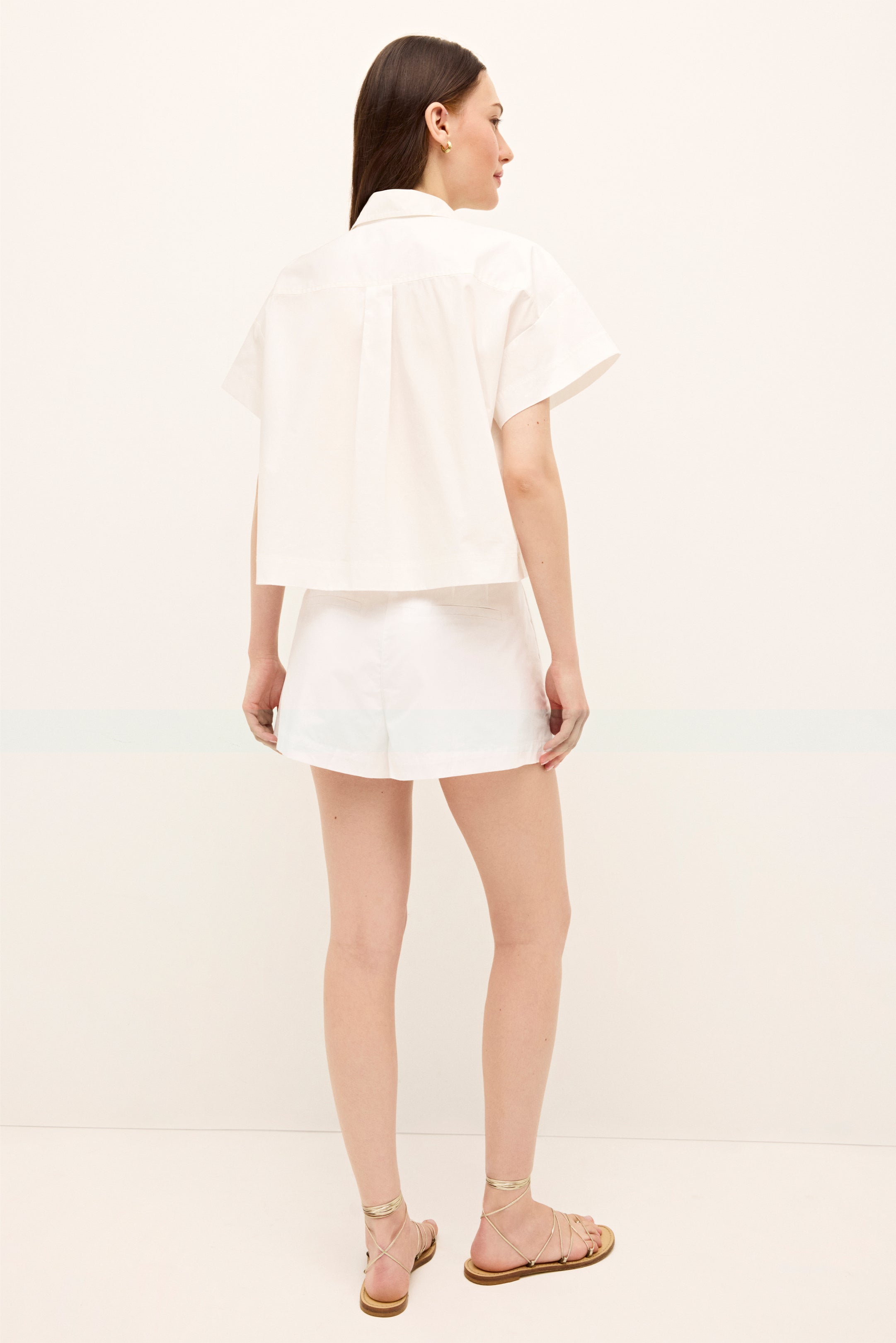 A relaxed crop top, Evelyn puts a fashion-forward spin on the traditional white button-down, lending fresh youthful energy to your look. This season, Marie Oliver HQ is wearing Evelyn with statement shorts like Miles in a leafy green botanical print or Lander in Optic for a fresh-faced all-white look.