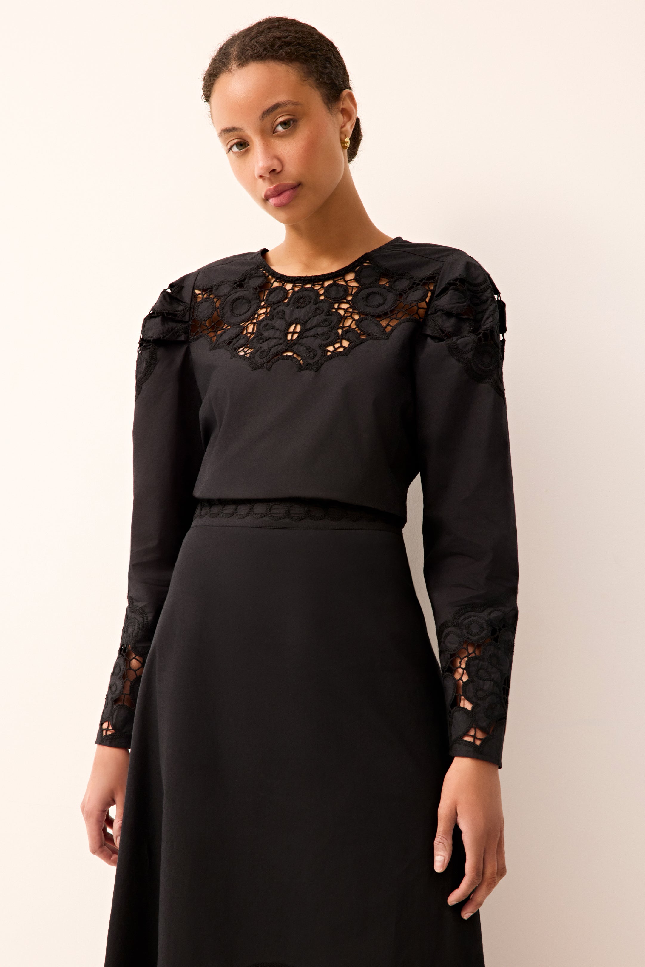 This blouse pairs tailored puff sleeves with delicate lace embroidery along the shoulders, neckline, and cuffs for a quietly elegant effect. Complete the look with the coordinating Eugenia skirt in Noir.