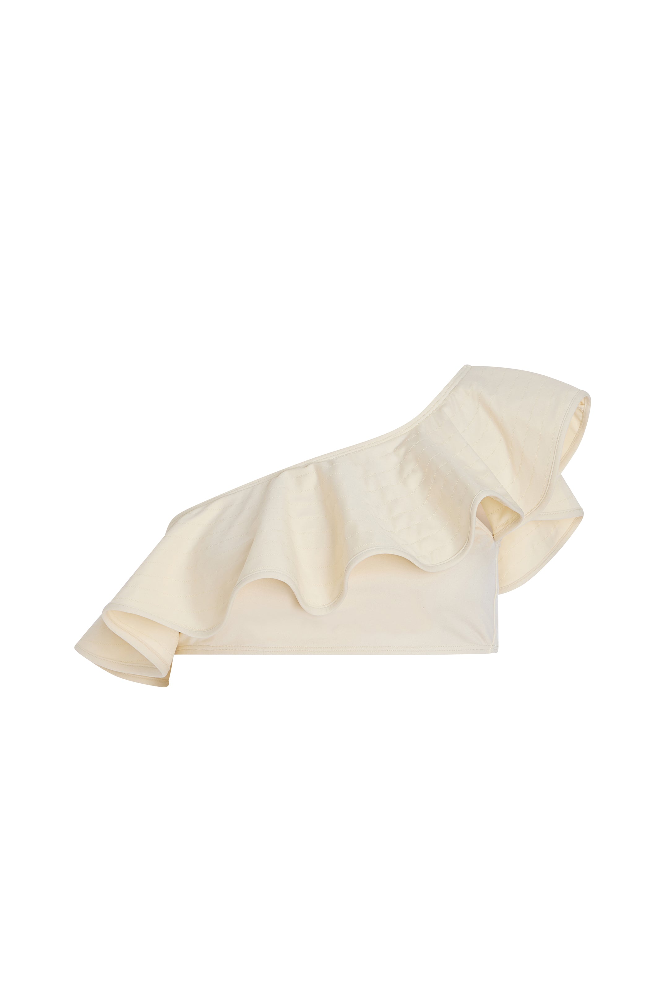 The bikini counterpart to our popular Marissa one piece, our new Doris top arrives in Turtledove with the same classic one-shoulder shape and dramatic trapunto stitched structured ruffle. Pair Doris back to our matching high-waisted Micha bottom to maximize the old-world glamour of the look.
