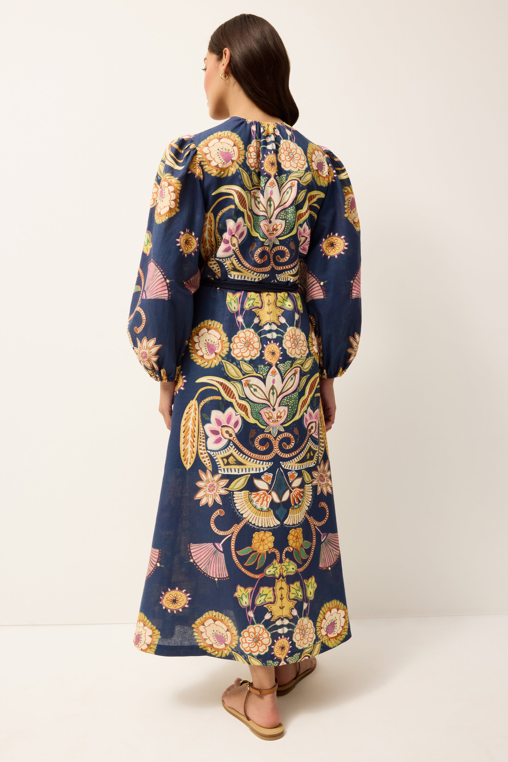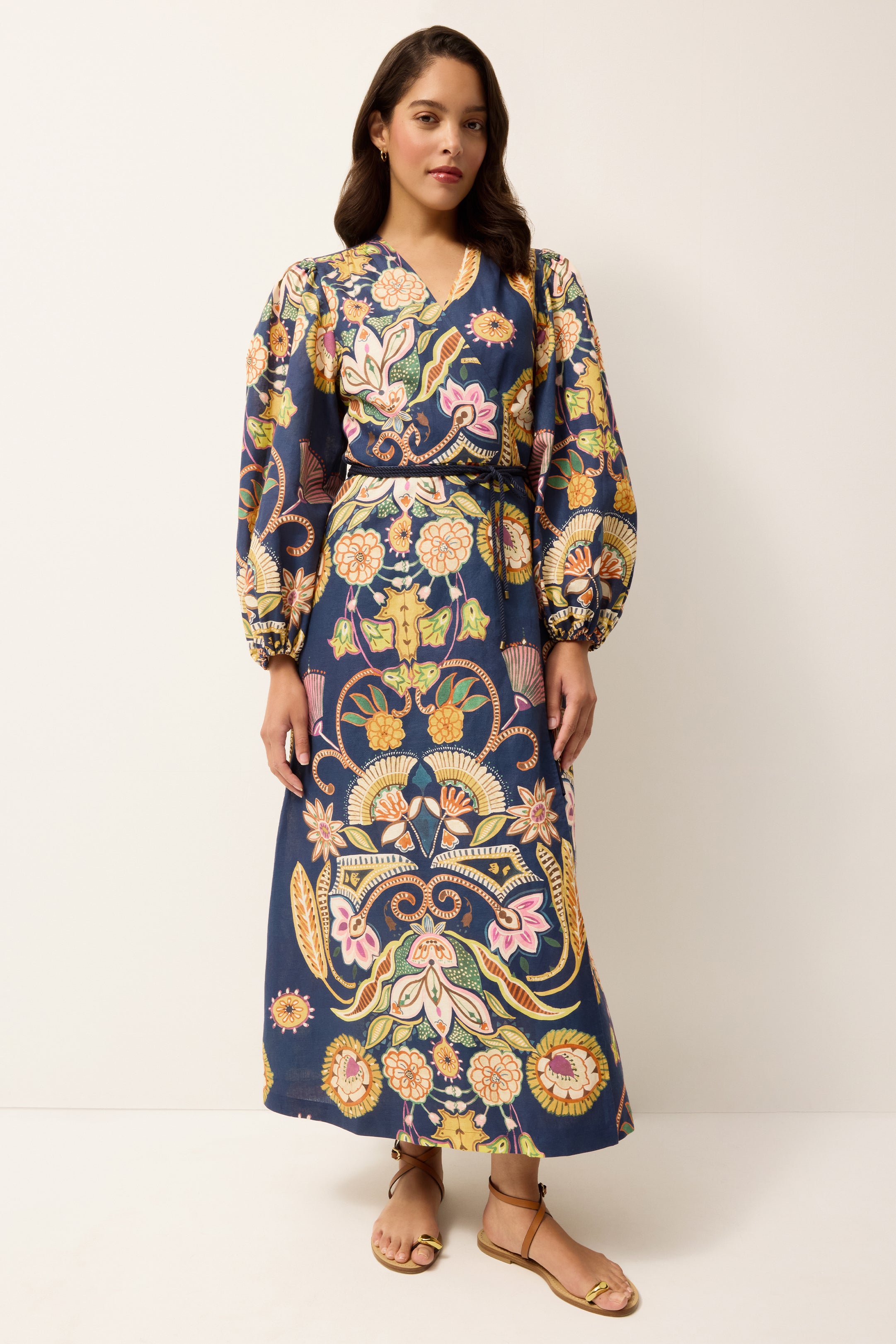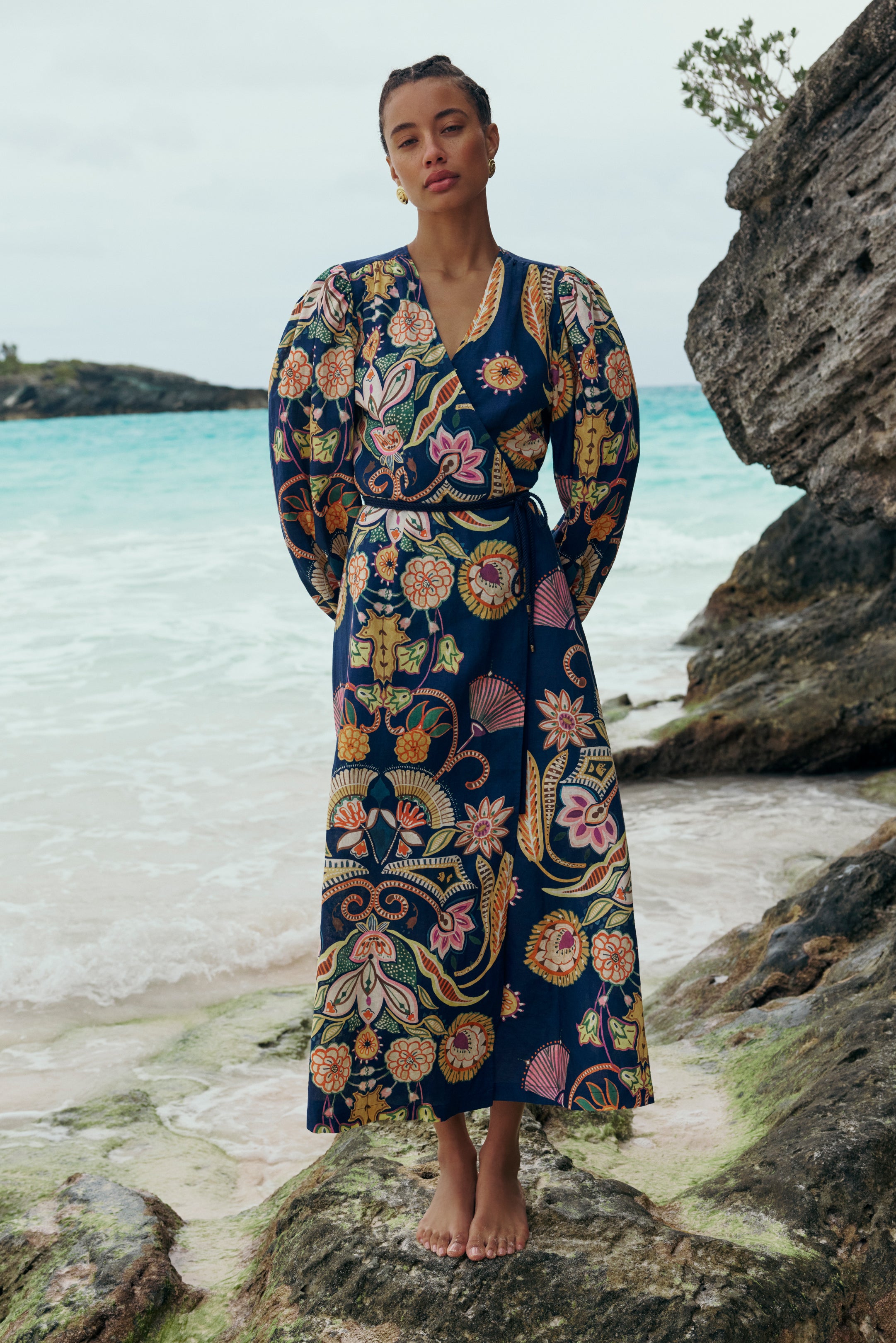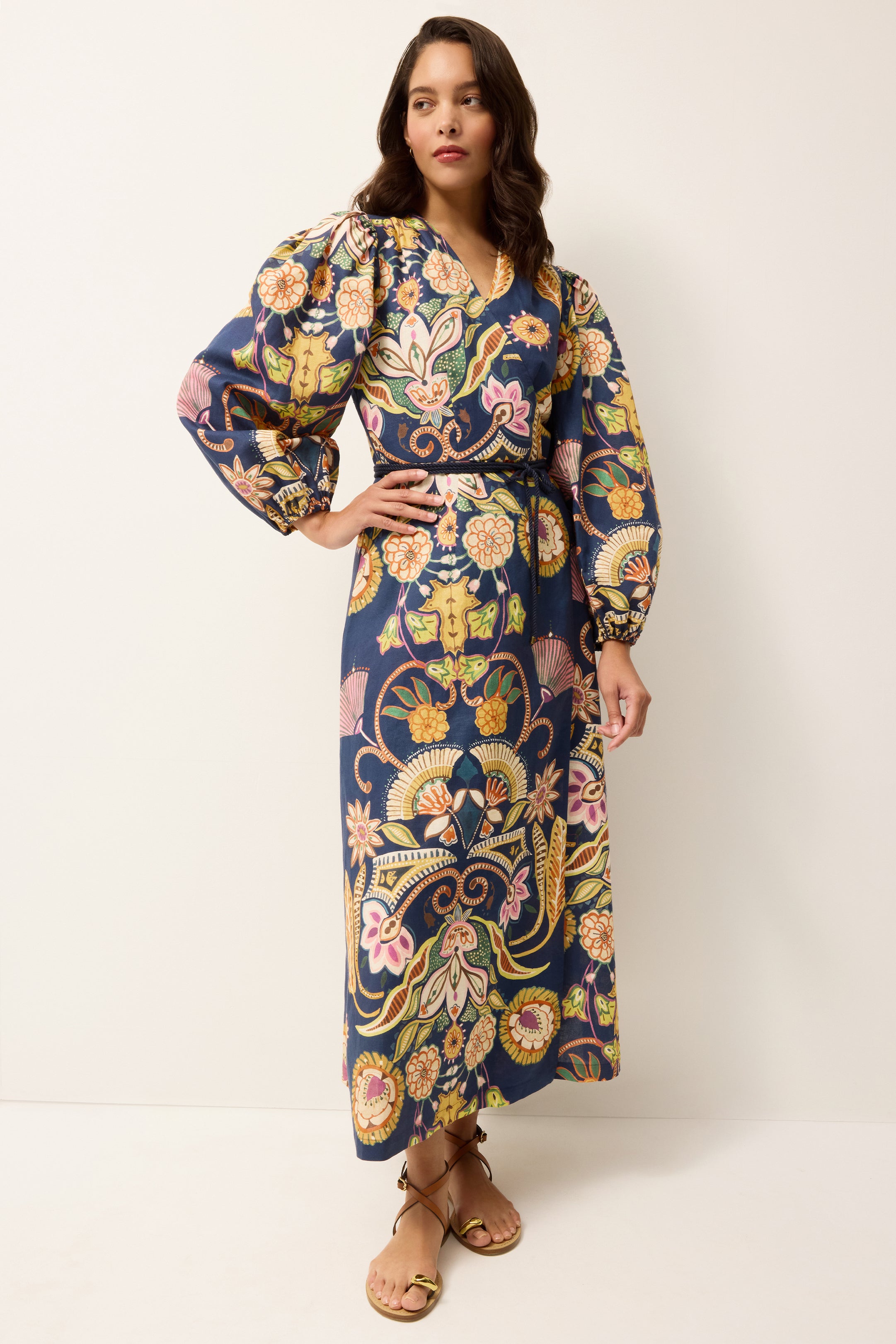 Famously flattering on every figure, the wrap dress hugs in all the right places without revealing too much. A natural choice for dressing up after a day in the sun, this timeless silhouette moves seamlessly from beachside lounging to dinner plans. Everette refreshes the classic with dramatic puffed sleeves and a placement print on a deep navy blue ground.