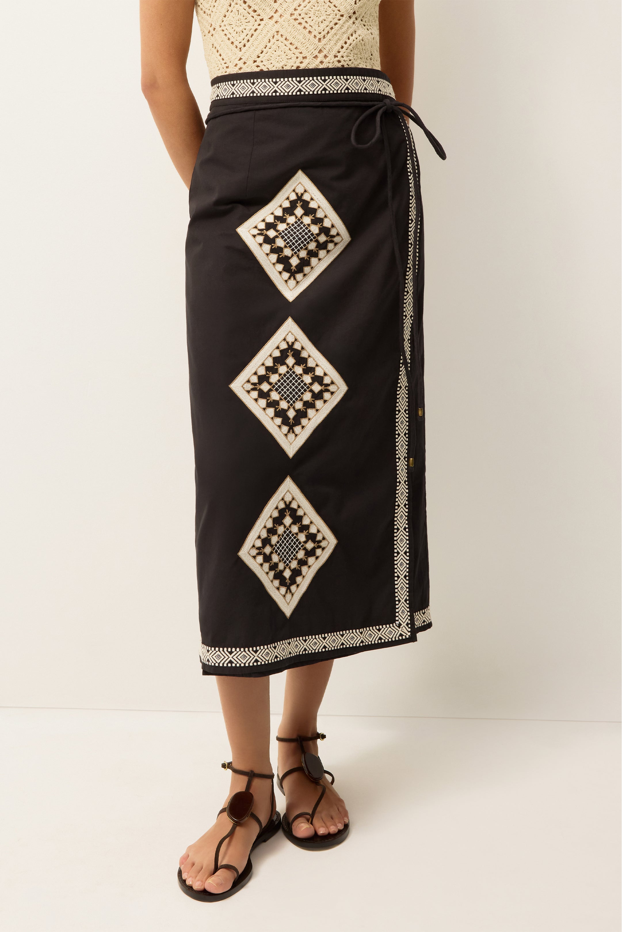 Perfectly placed geometric embroidery enlivens this simple black wrap skirt, which comes with corded tie belts for an adjustable fit. Luca is pictured here with our Rainey top in Turtledove.