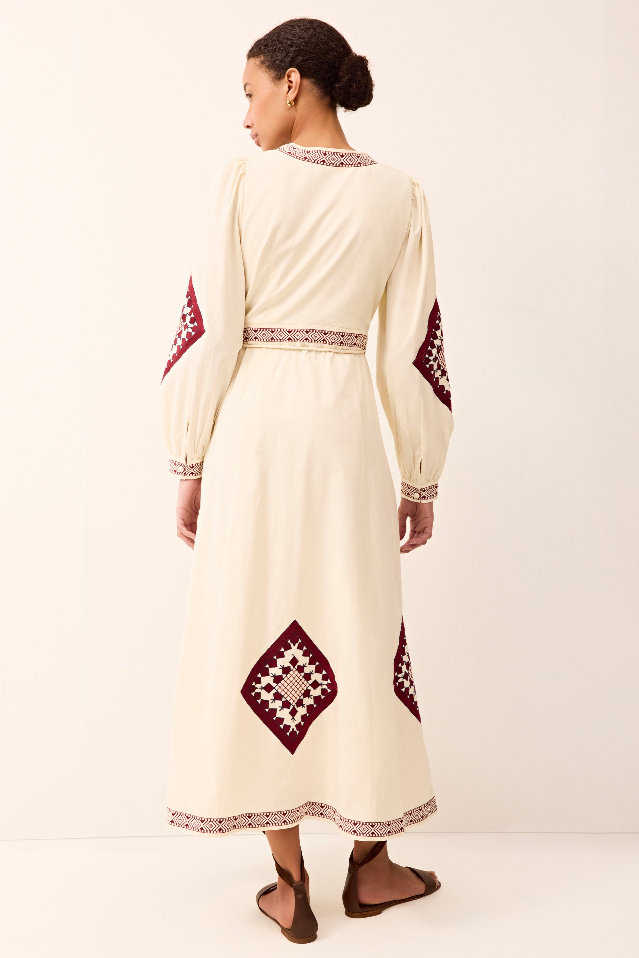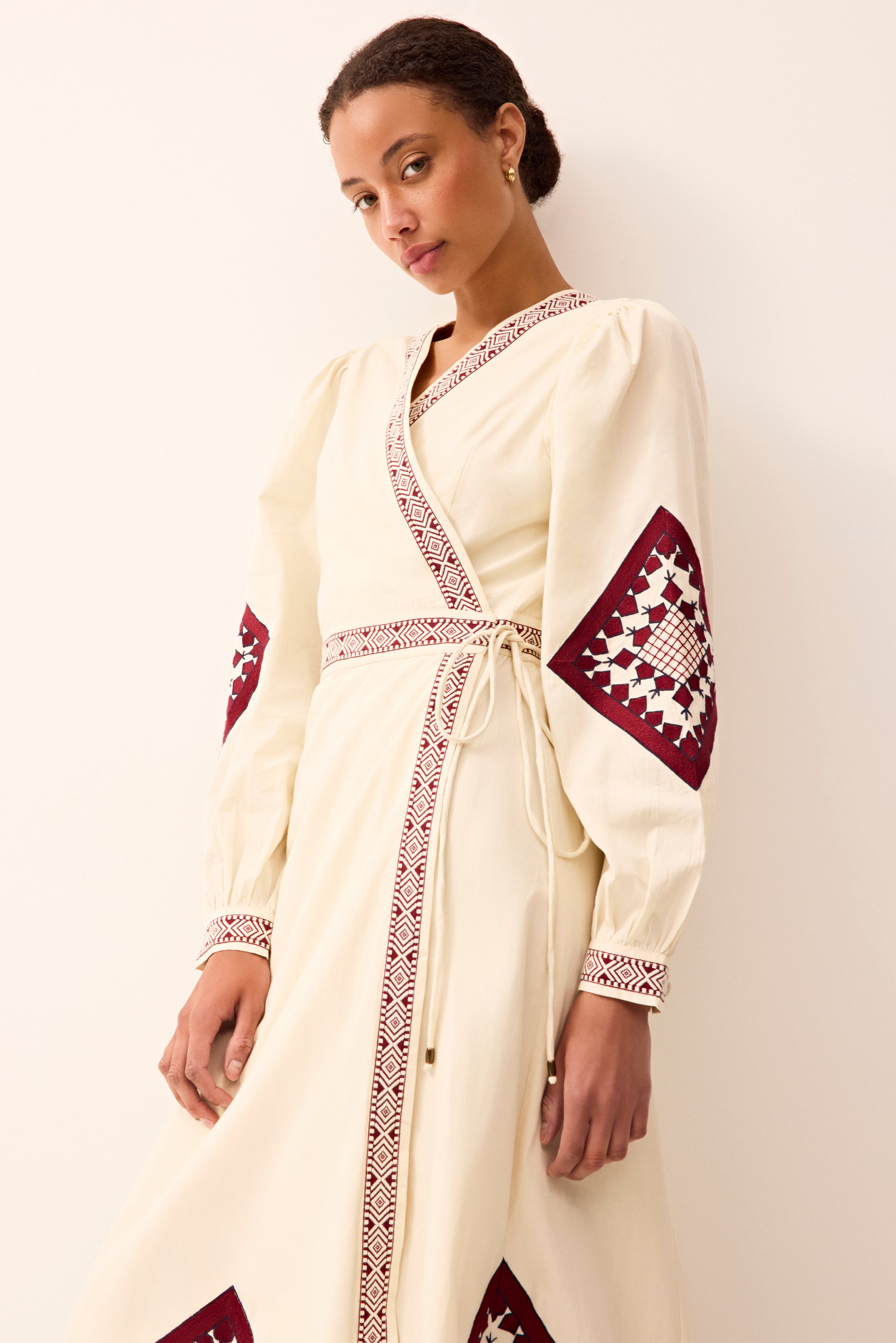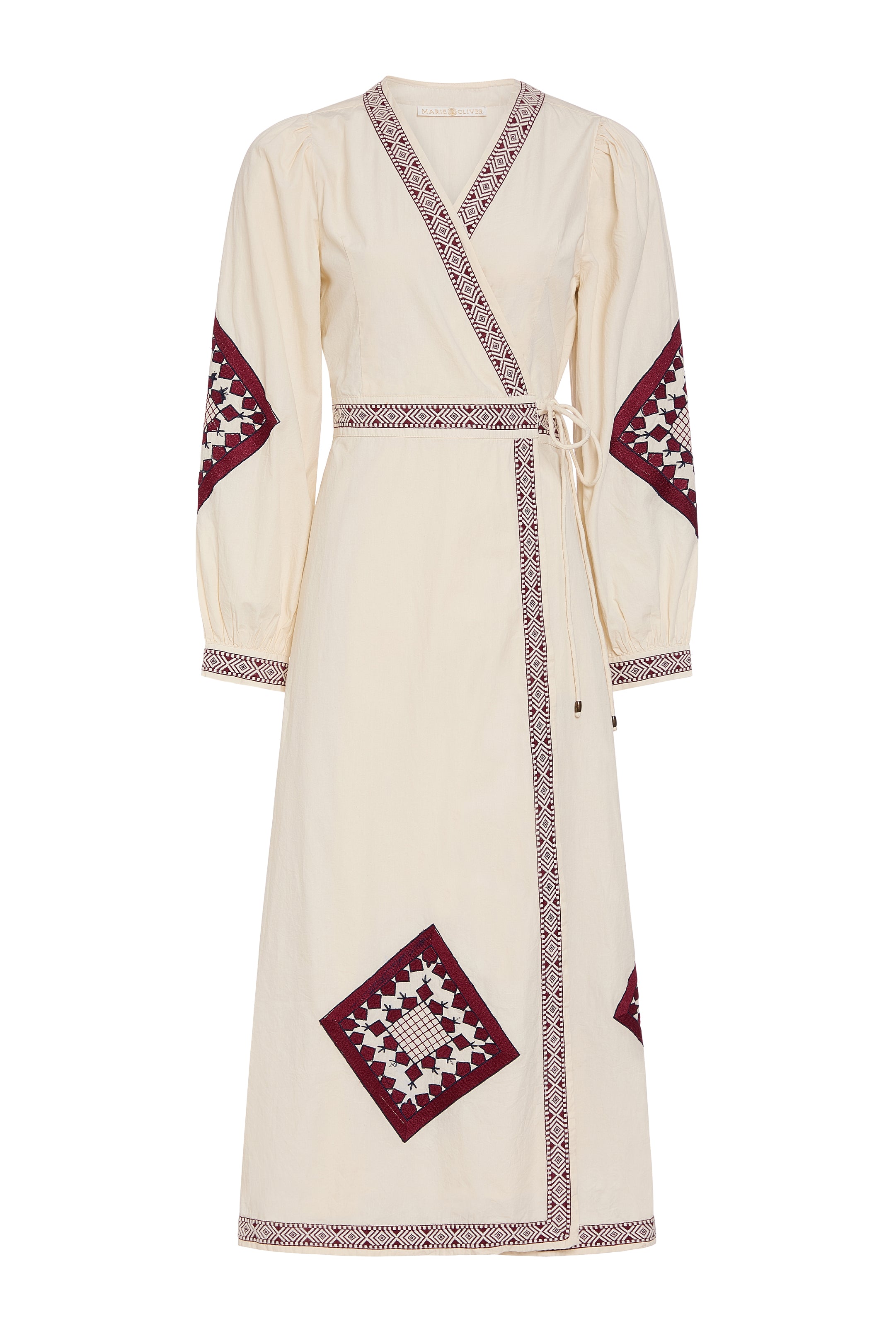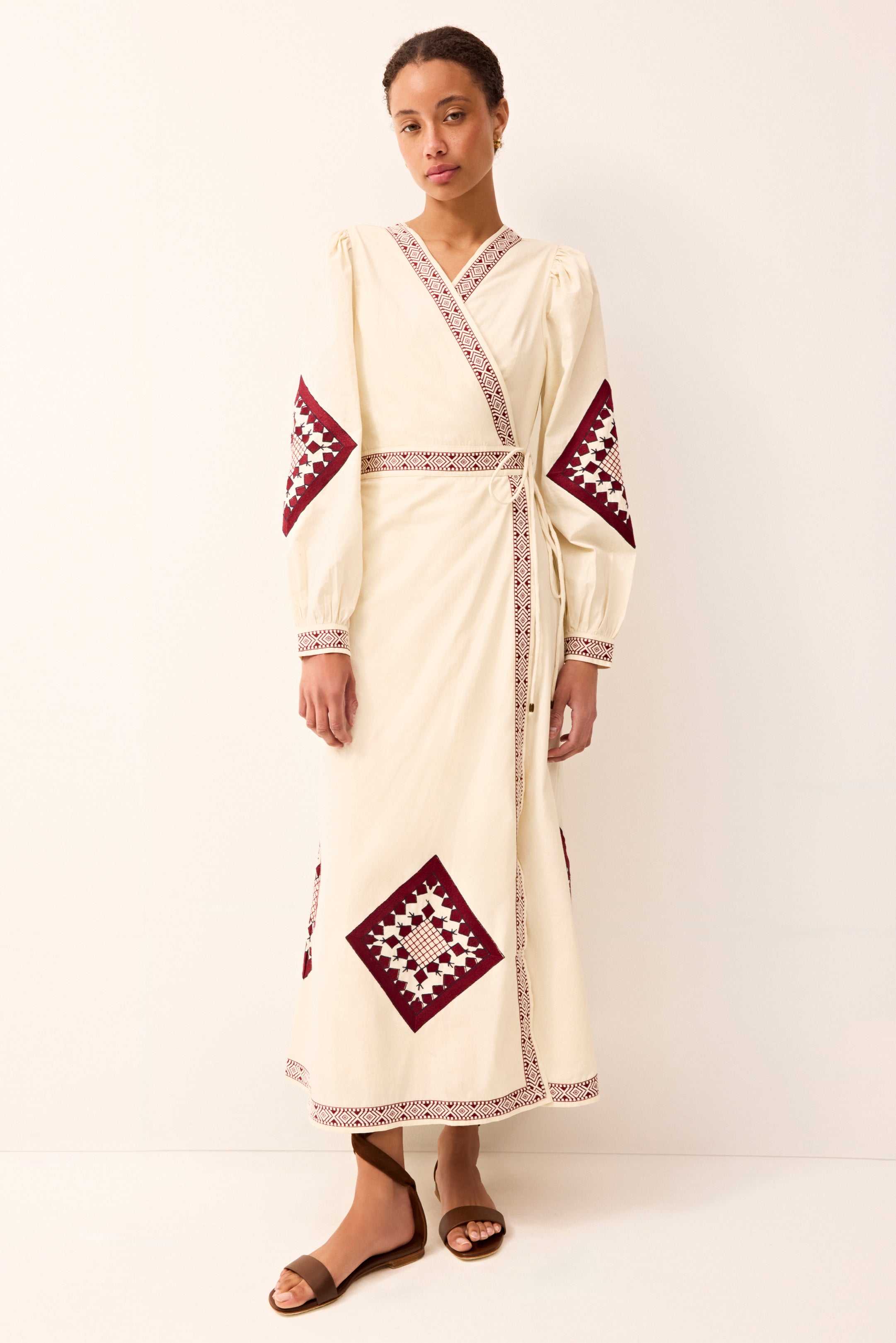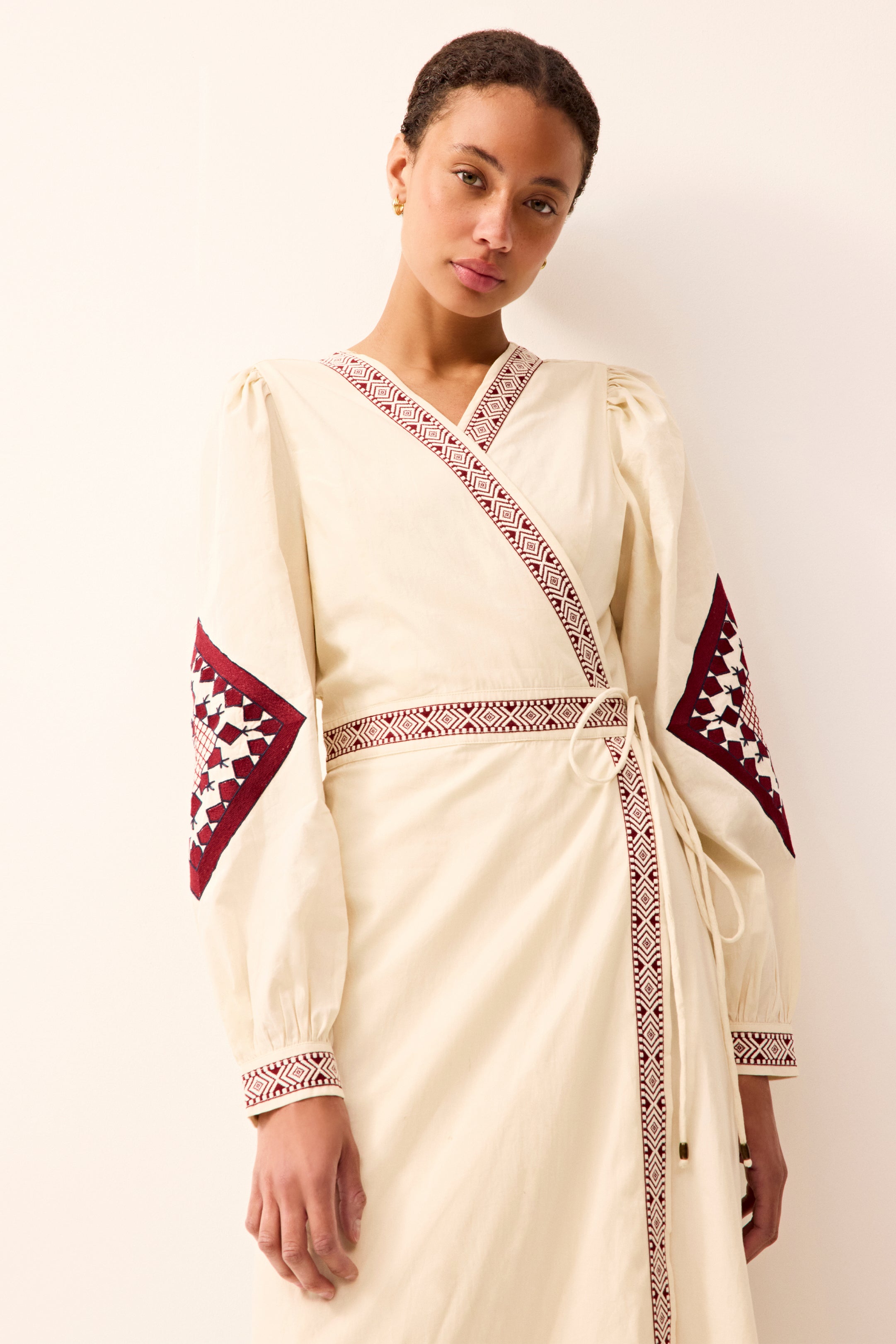 With its ivory-and-ruby palette and carefully placed geometric embroidery, Naomi brings subtle artistry to the classic wrap dress. Corded tie belts offer adjustability and ease, creating a flattering silhouette designed for warm-weather wear.
