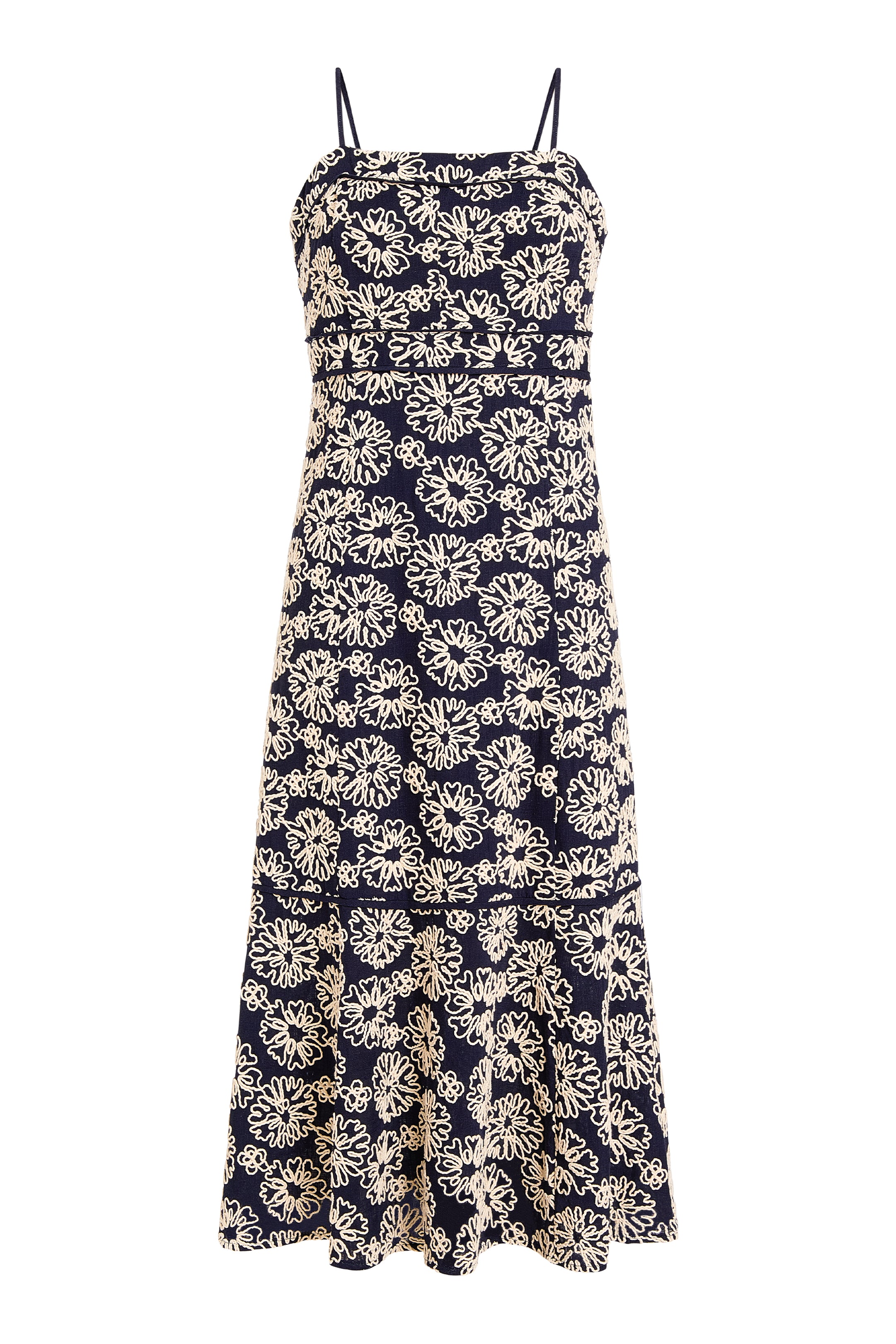 This tailored midi showcases thoughtful detailing at every turn, from adjustable corded straps to precise seaming throughout. Blossom, an all-over floral embroidery in a timeless navy-and-cream motif, brings texture and depth to the sculpted silhouette.