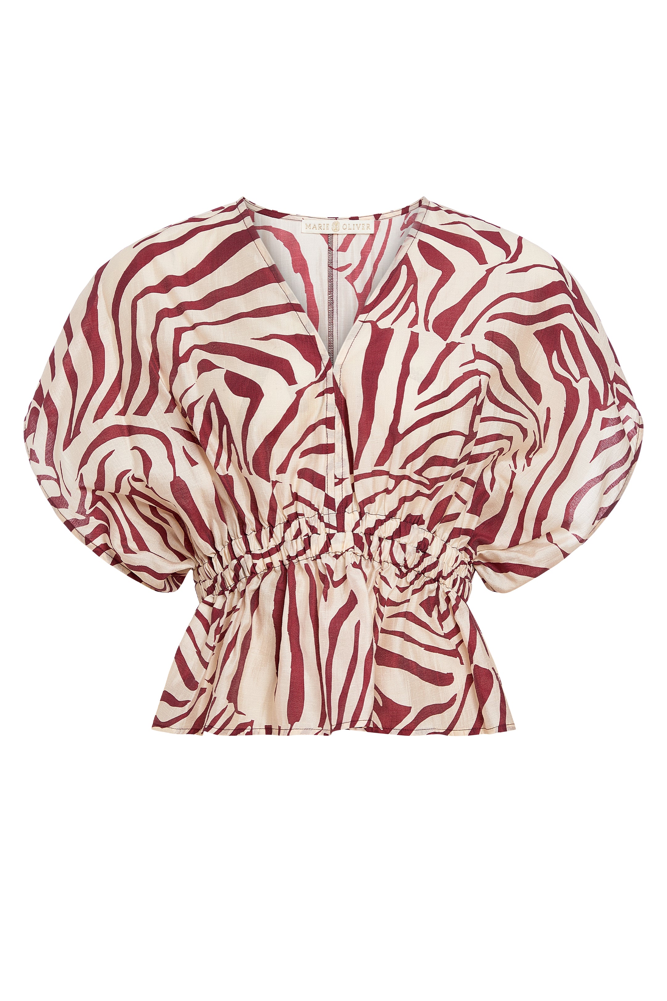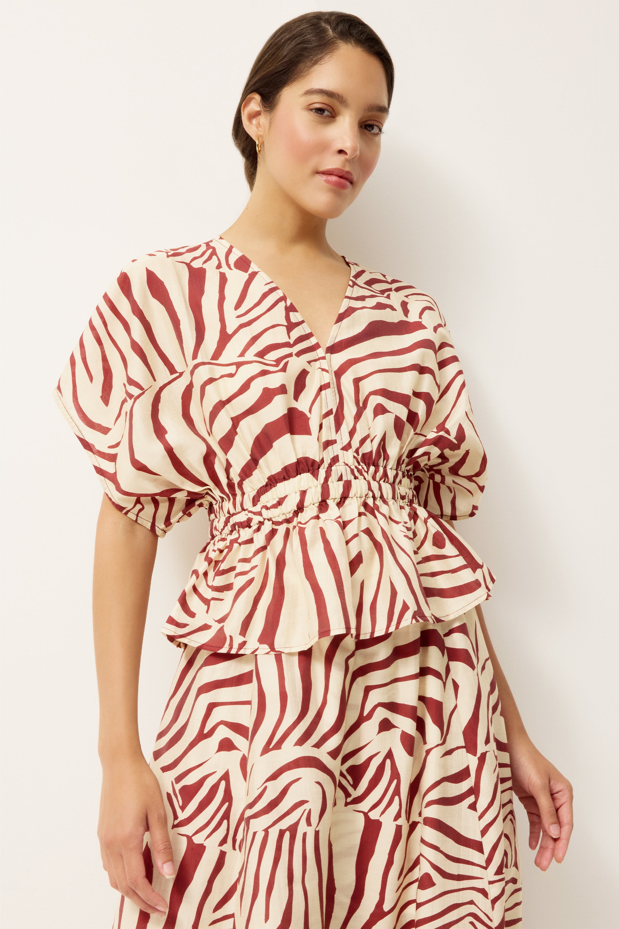 Full sleeves and a deep V-neck balance the Vesta top’s relaxed elegance, while a layered elastic waist creates a softly flounced peplum shape. The Lionfish stripe, with bold strokes of red and cream, brings graphic appeal to a set made for warm-weather escapes when worn with the matching Mirelle skirt.