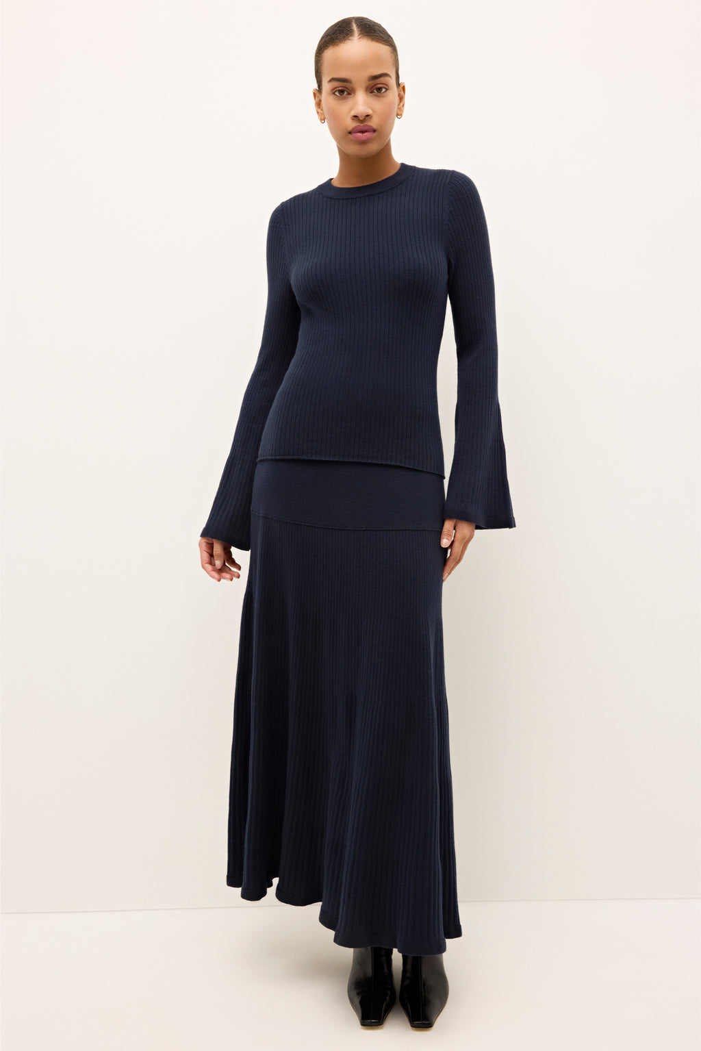 Layered over any of our printed blouses and seasonal dresses, Marie Oliver’s newest vest adds interest and style to any look, extending the wearability of lightweight styles through fall into winter. Made of quilted vegan leather with curly Sherpa trim, the Beatrice is a design team favorite for its balance of Bond-girl sophistication and cozy Alpine aesthetic. Beatrice is styled here with our Kaylan skirt and Carrey top in matching Navy for a luxe tonal ensemble.