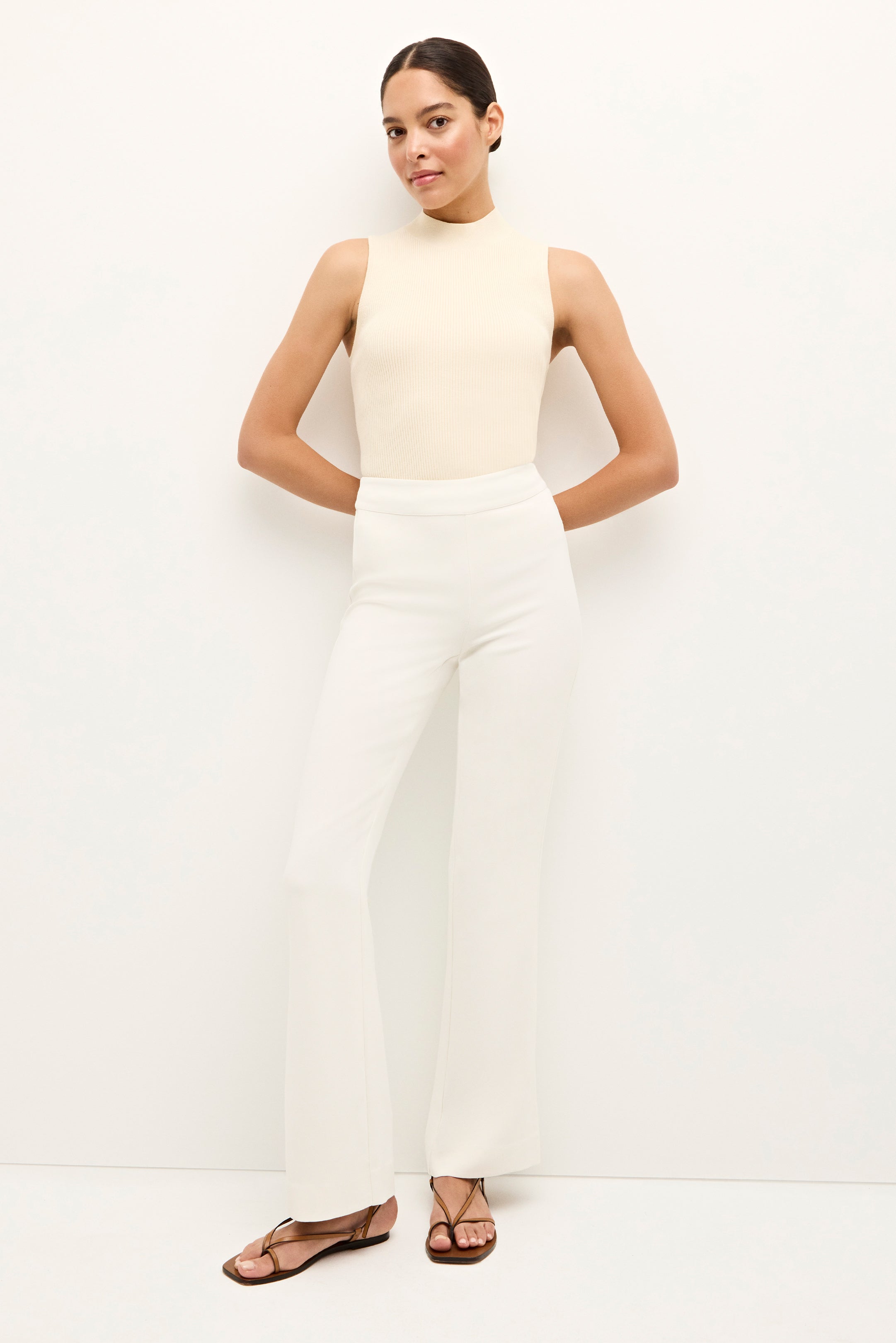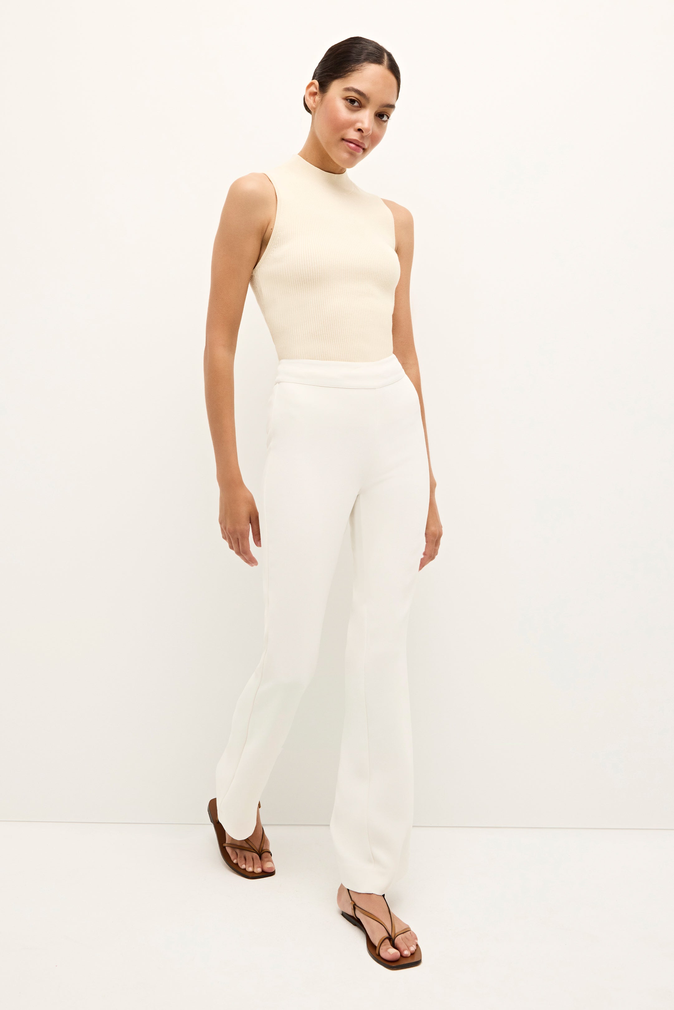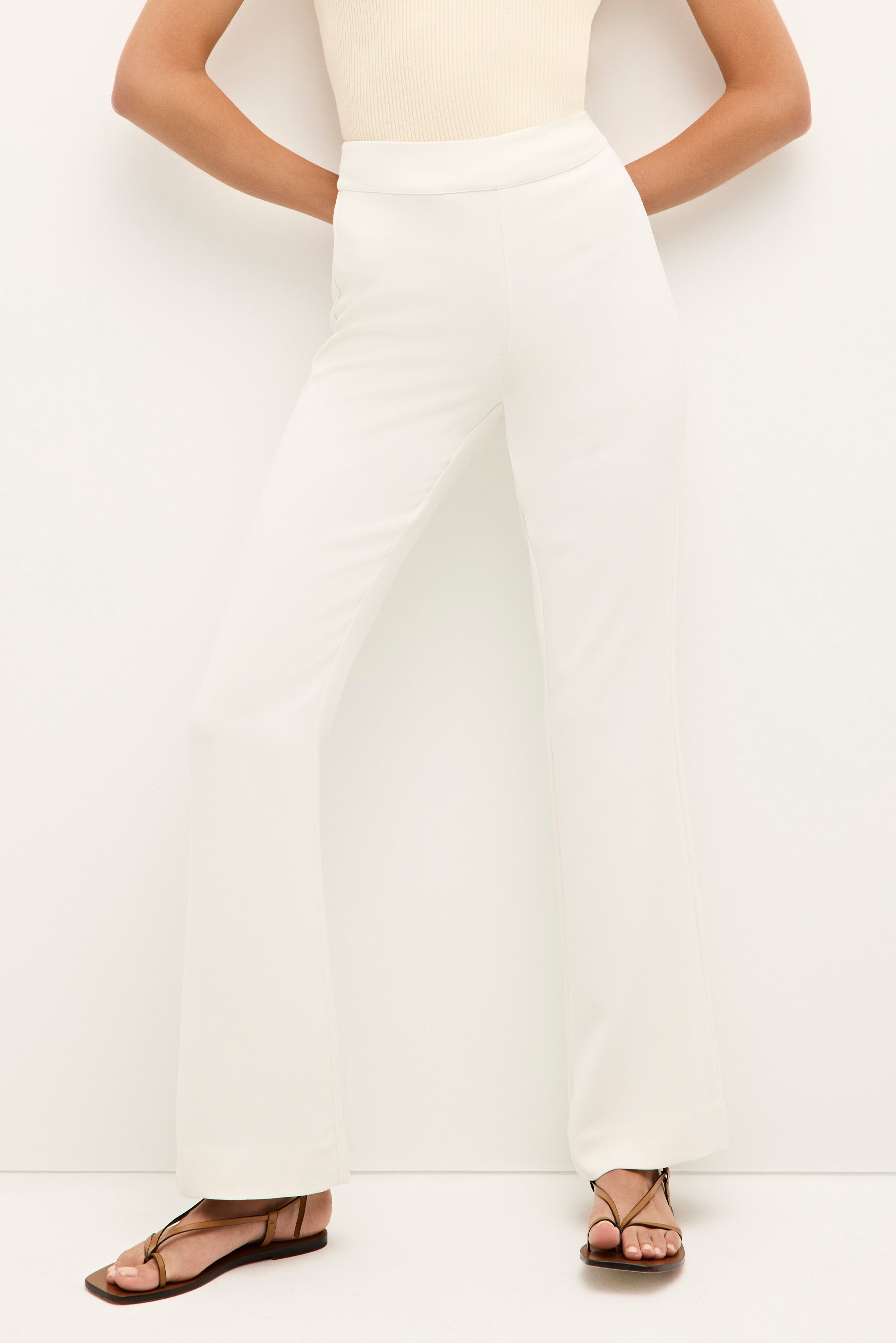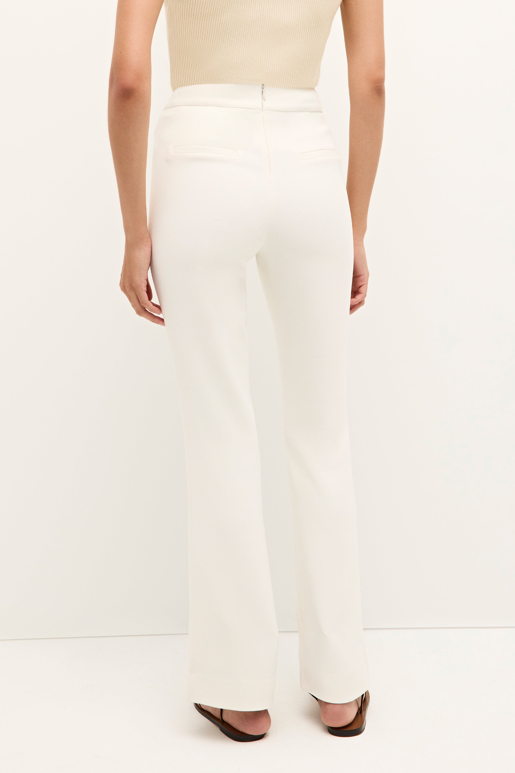 Finally! Our favorite shorts are getting a sister collection of pants. The Mia Slim Pant is pictured here in our off-white Bone-colored hue and features a slimmer tailored fit that hugs the body before flaring slightly at the ankles. Eschewing pockets while adding an invisible back zipper creates a sleek office-ready look.