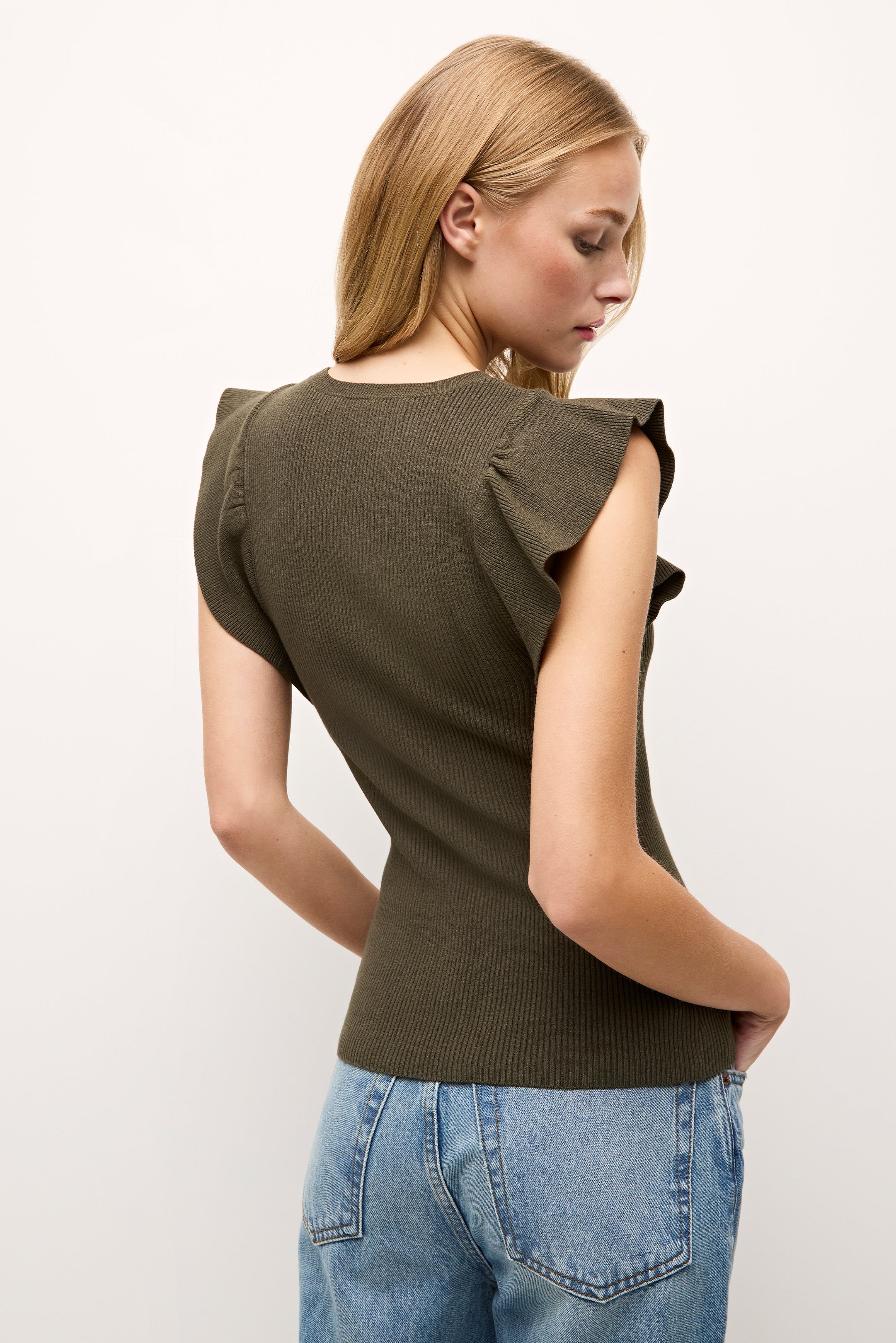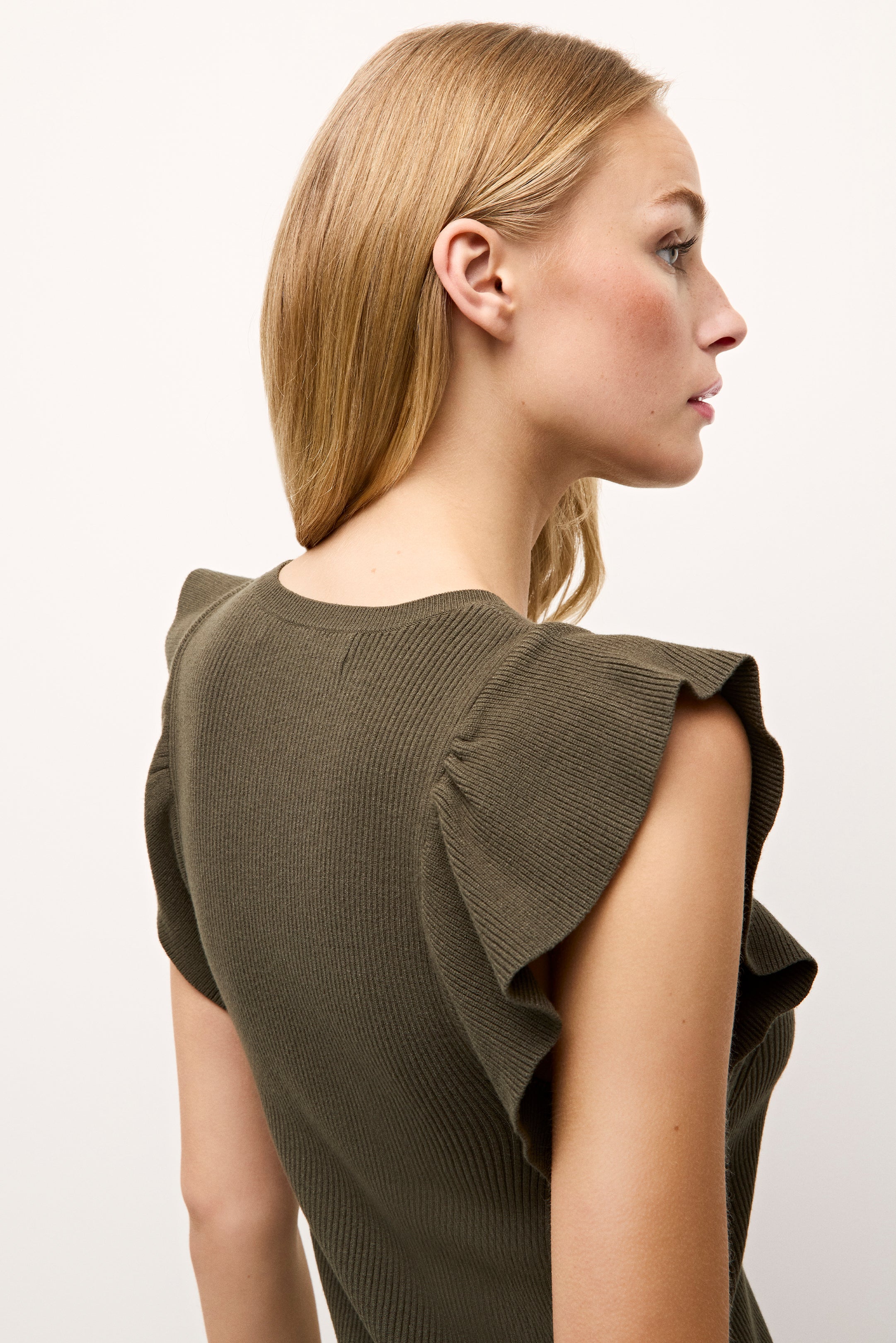 • Ribbed bodice with ruffle sleeve