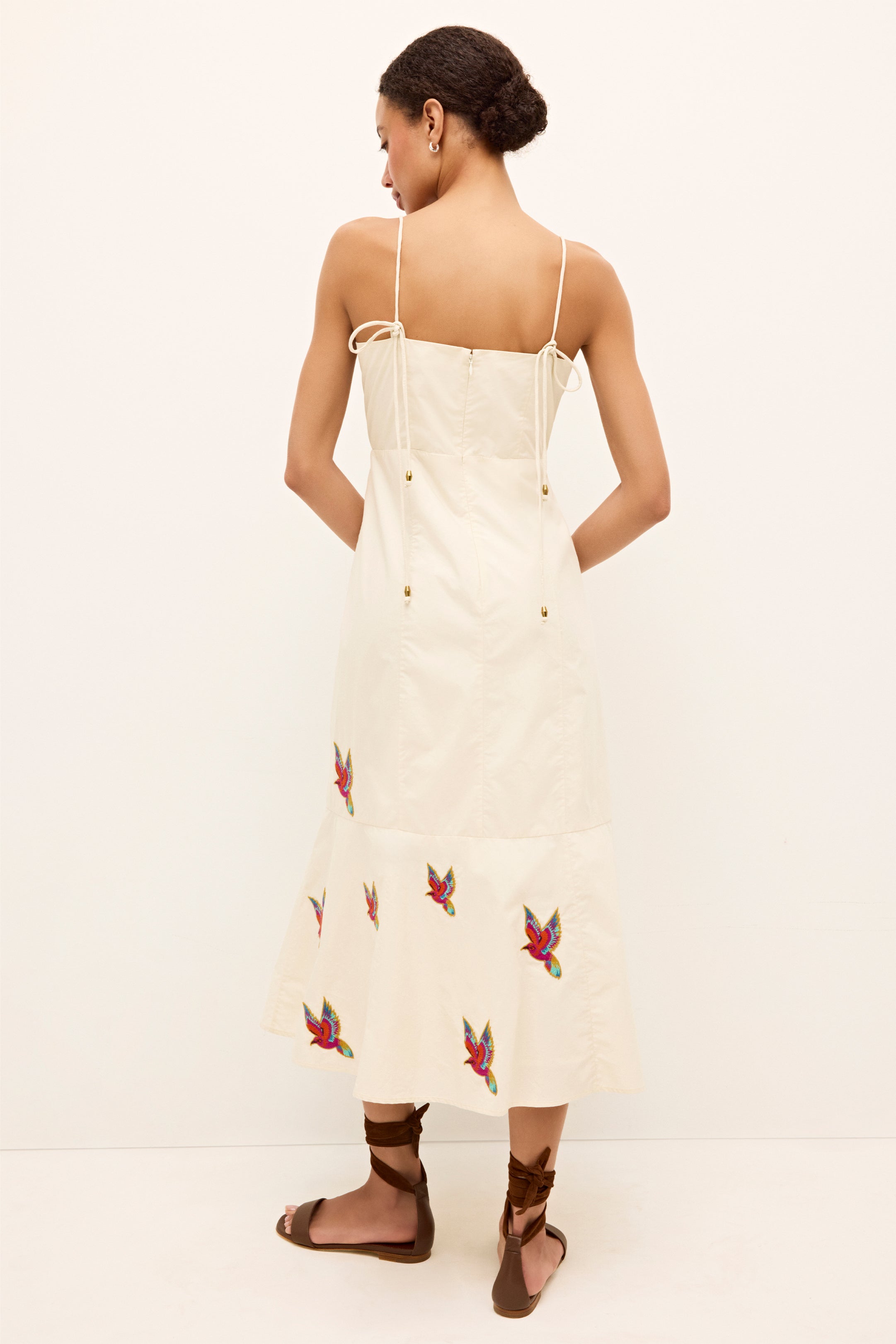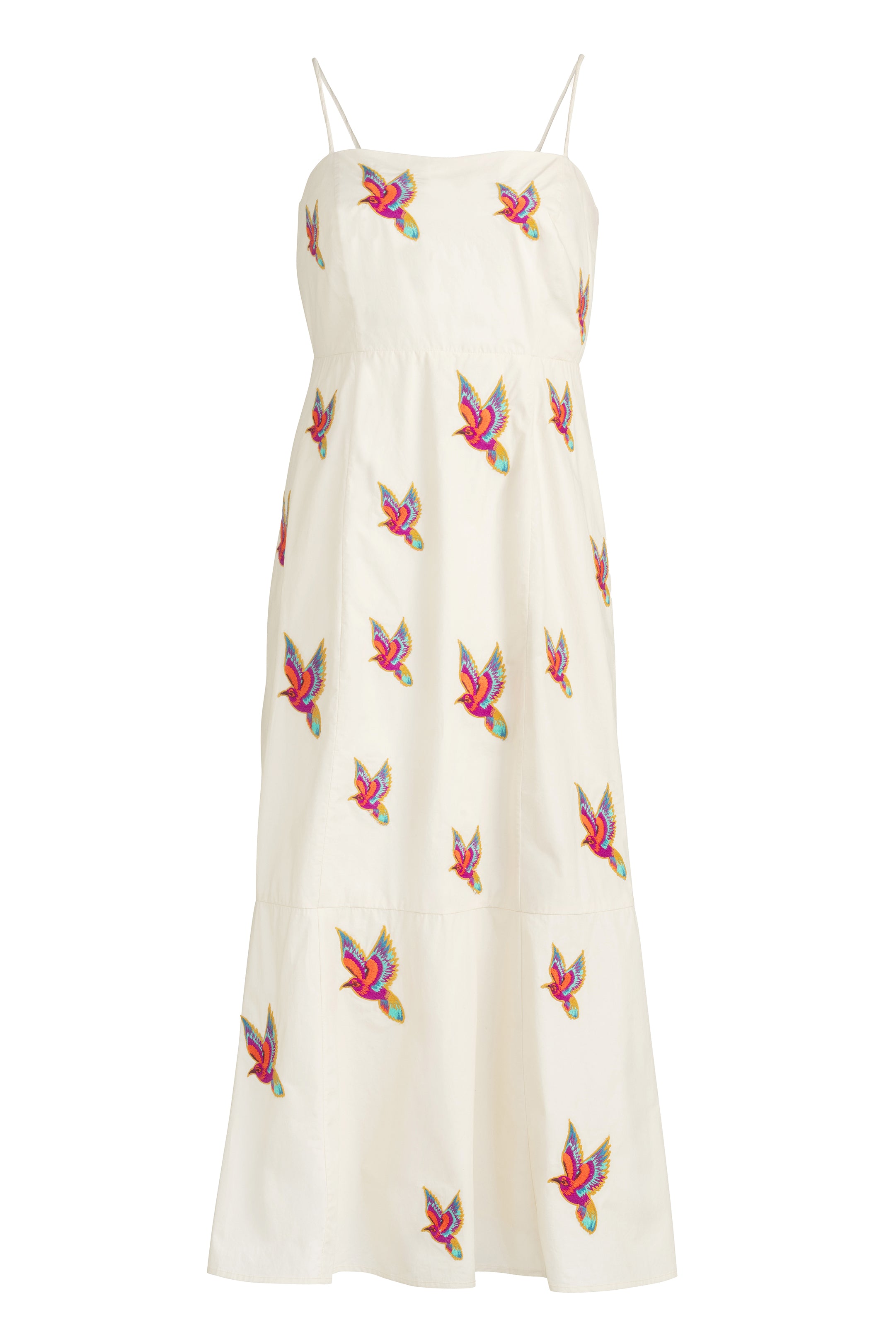 A classic sundress with thin, adjustable tie straps, Birdie is made from a lightweight, cream-colored cotton, and animated by a rainbow flock of embroidered appliqué parrots.