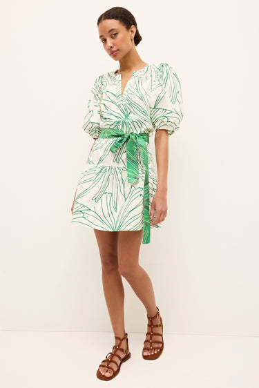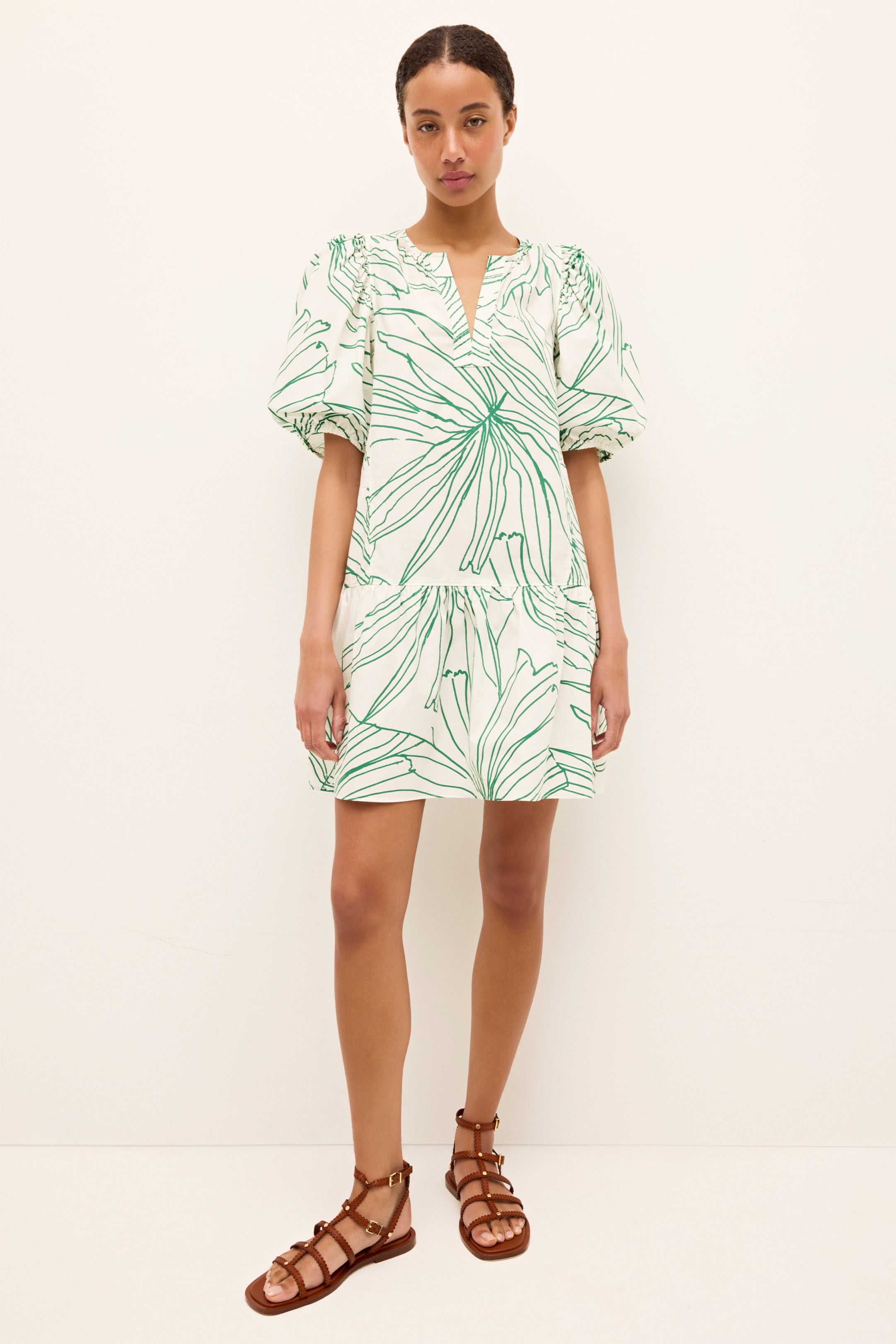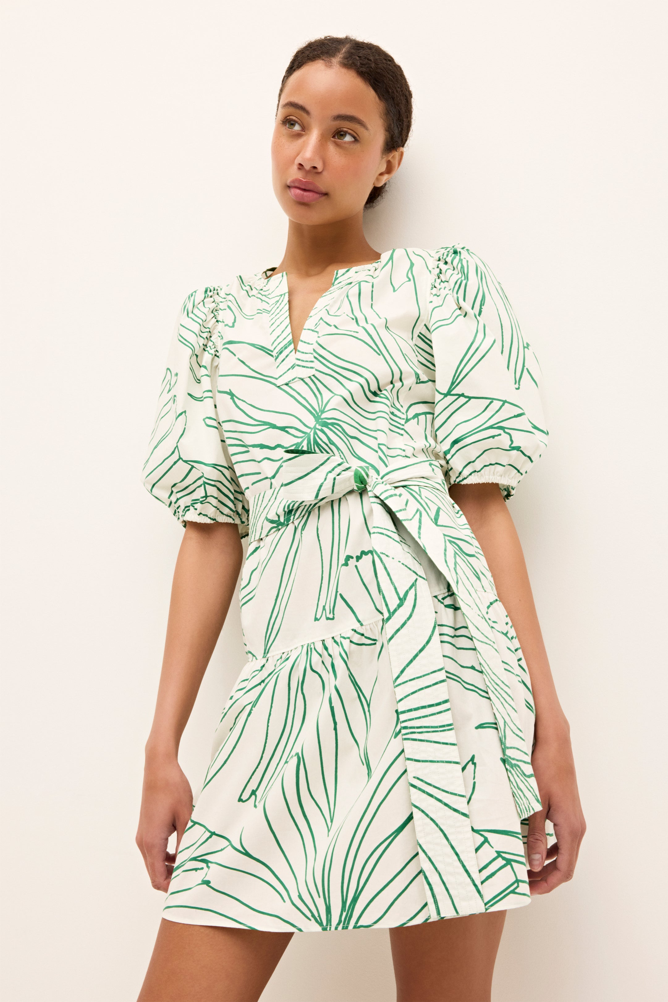 Modern design details—puffed sleeves, a stand-up ruffle along the neckline, and an optional (and reversible) tie belt—elevate this chic silhouette while a line-drawn botanical print in a fresh green-and-white color palette underscores the breeziness of this effortless style.
