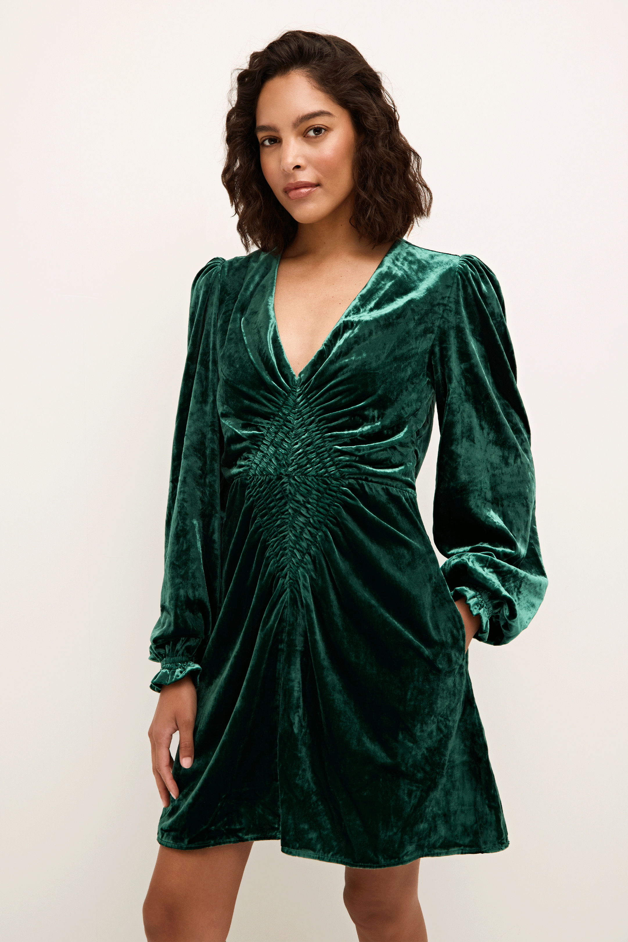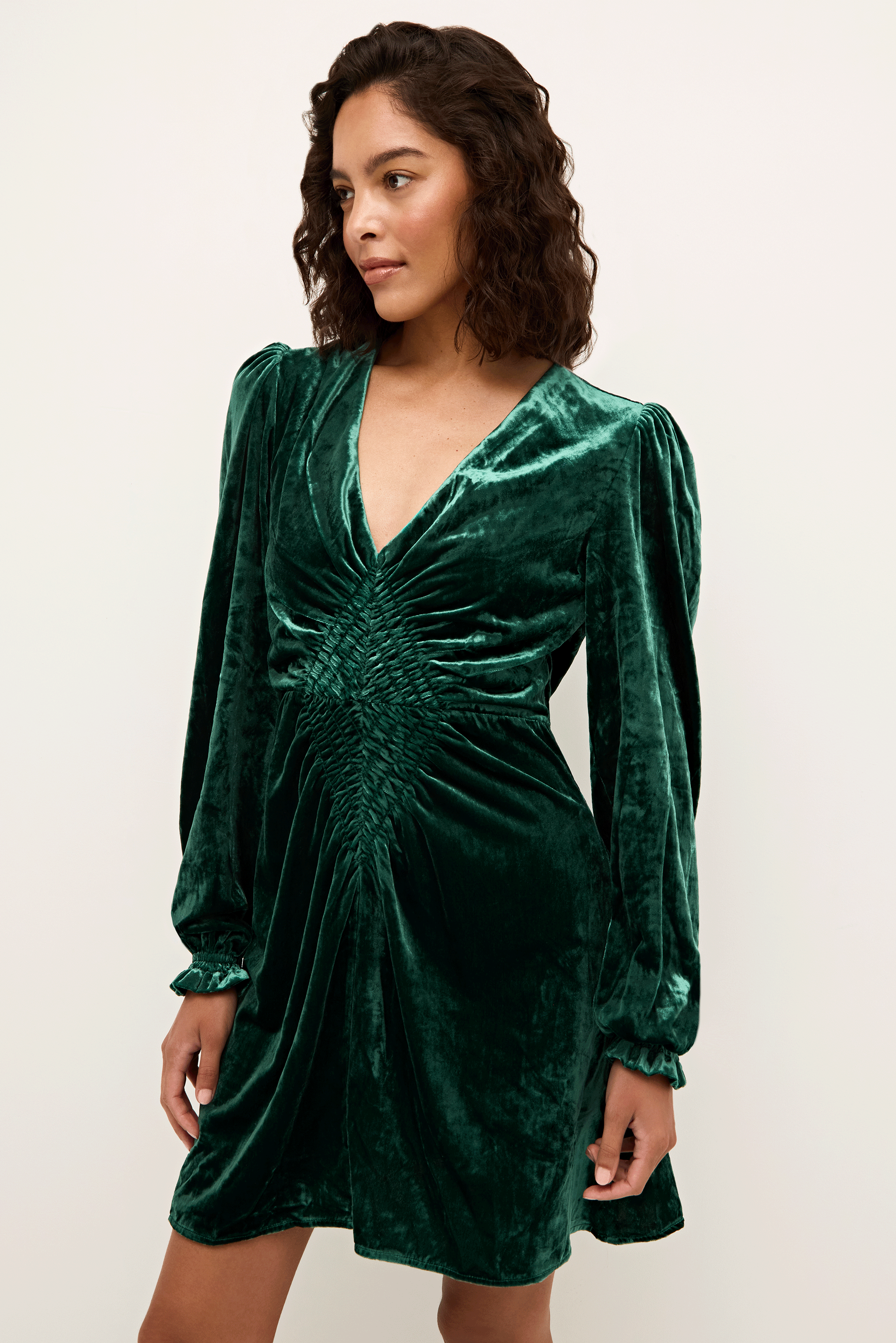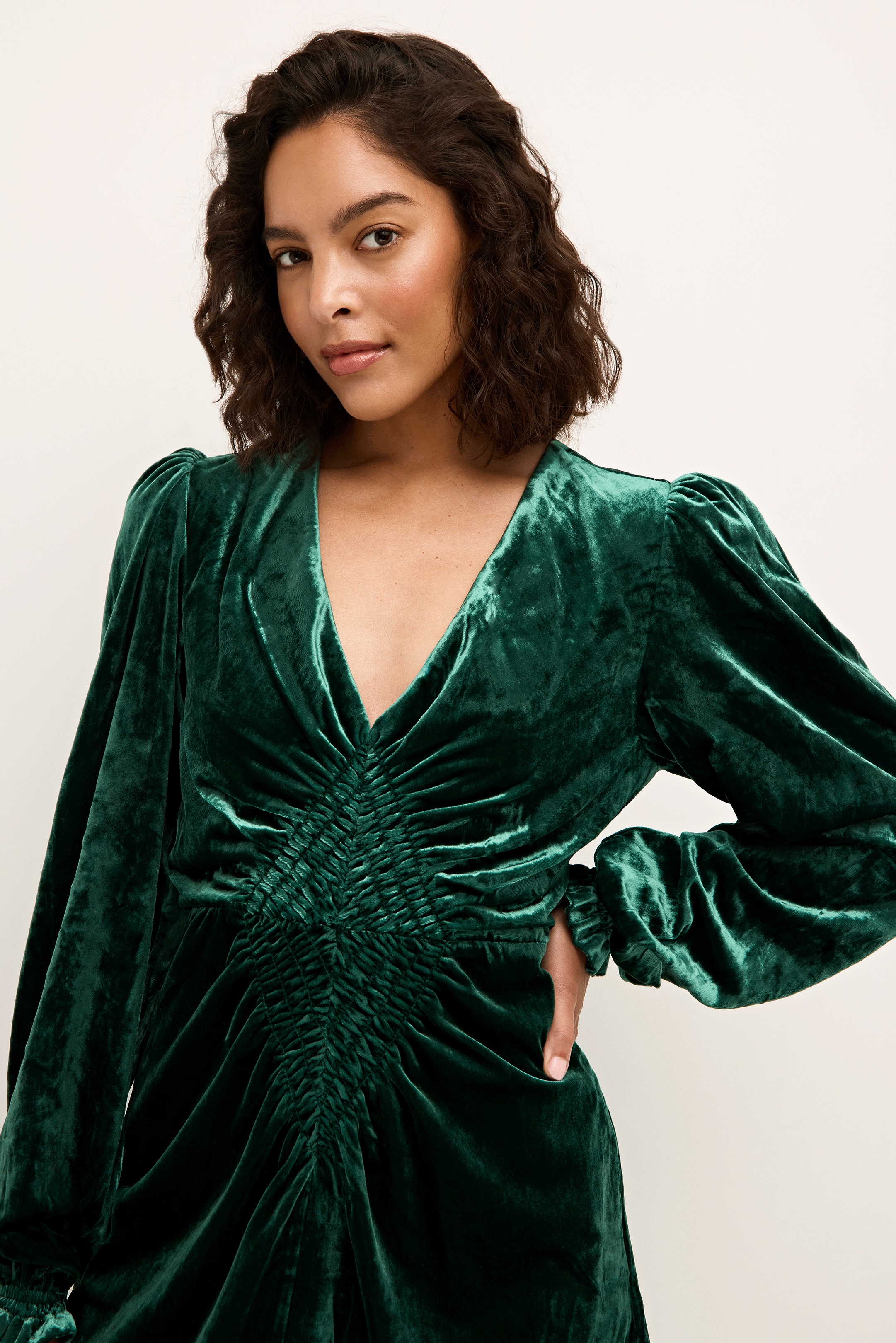 By raising the hemline to hit above the knee, we transformed our floor-length Elsabeth gown into a stunning holiday cocktail party silhouette. Regardless of length, the real appeal of this romantic style lies in the dreamy drape of the sumptuous jewel-toned velvet.