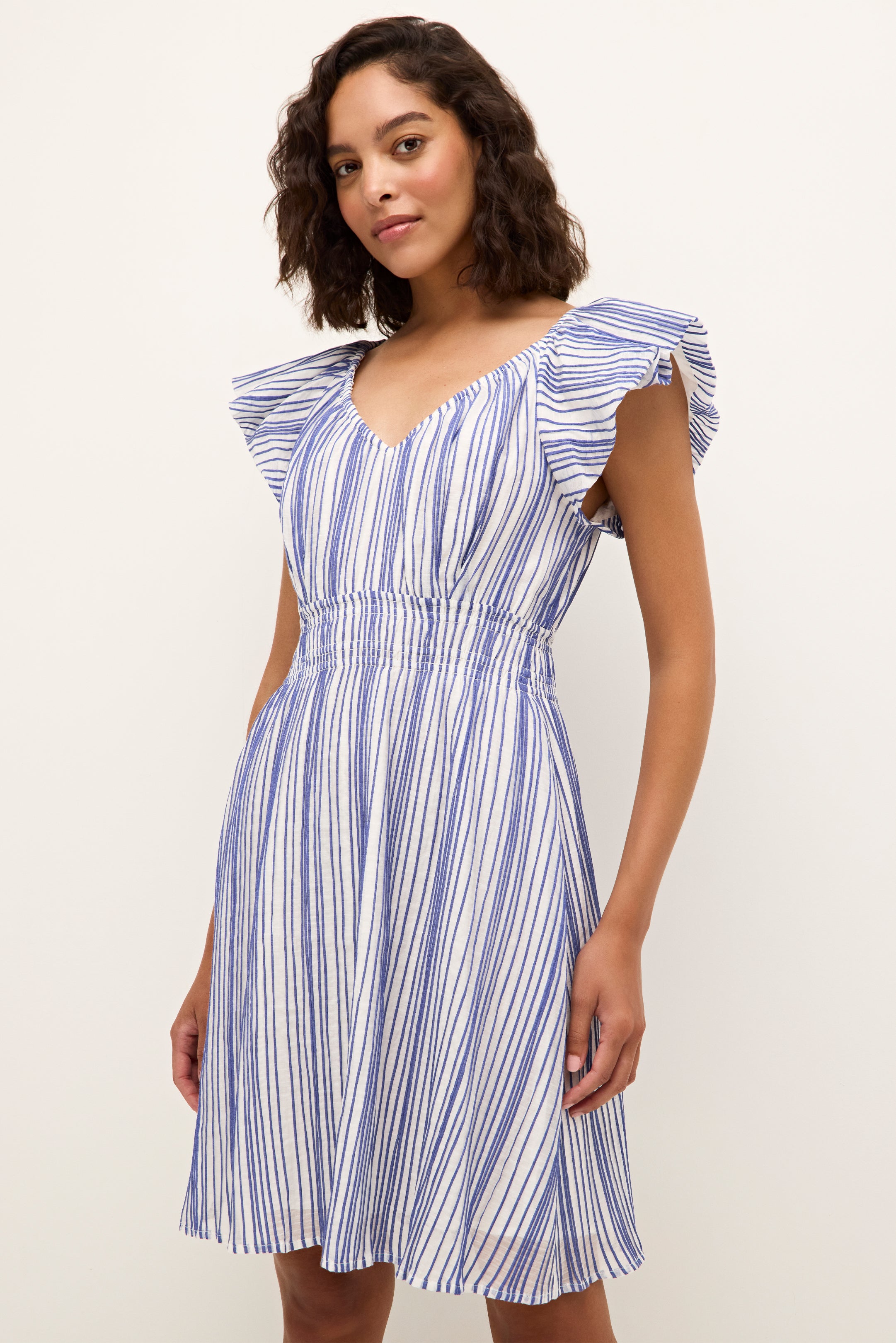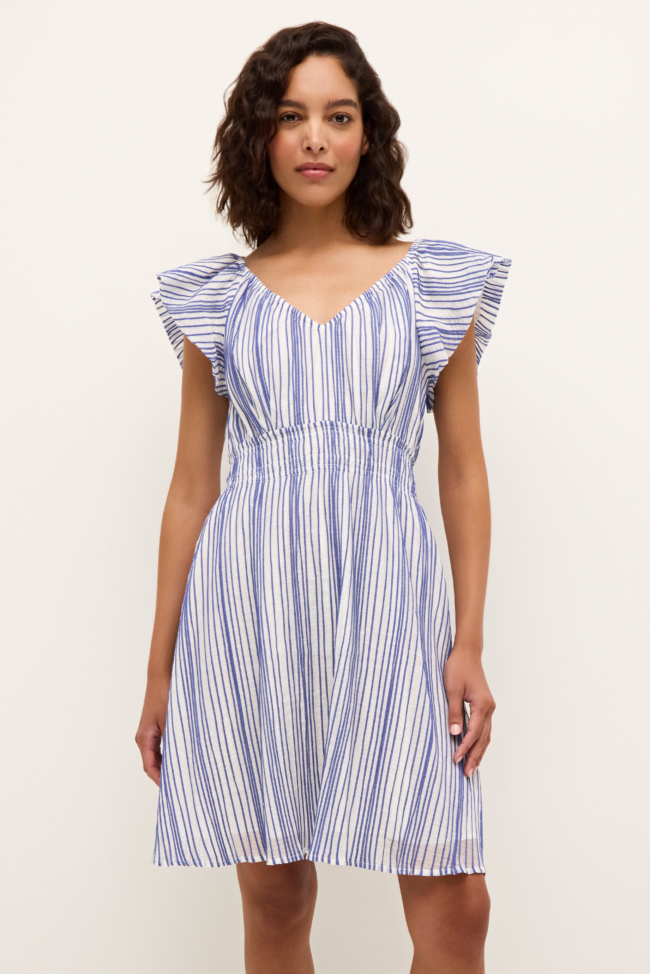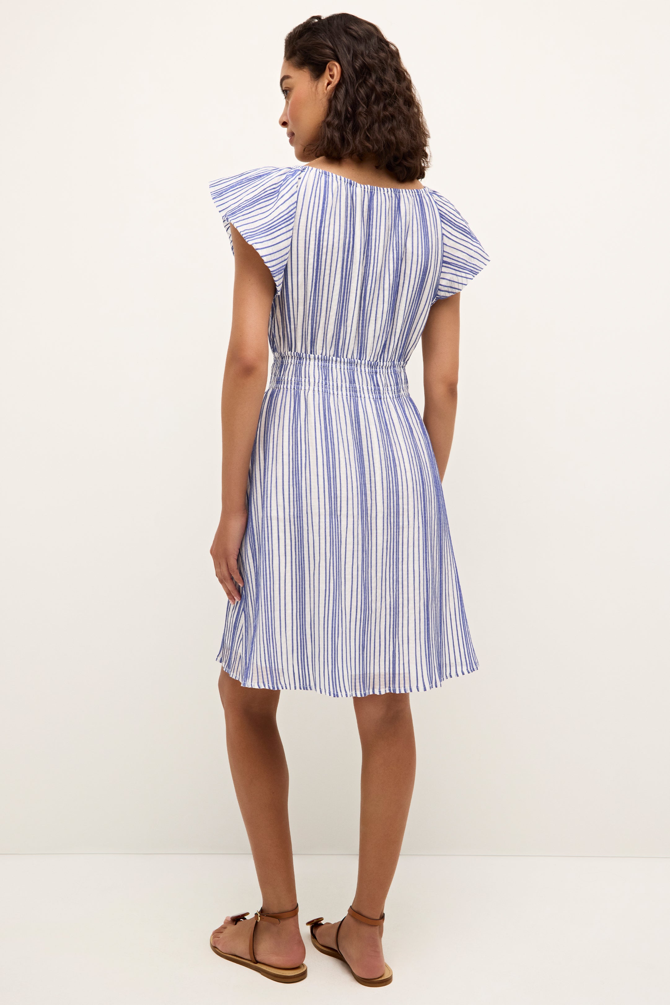 Just in time for summer, our classic blue-and-white Dazzling Stripe lends a textural element to this easy slip-on-silhouette. Our feminine Emilia Dress features an elastic waist and neckline as well as wide flutter sleeves, and the cotton and silk blend fabric has a pretty sheen that feels instantly elevated.