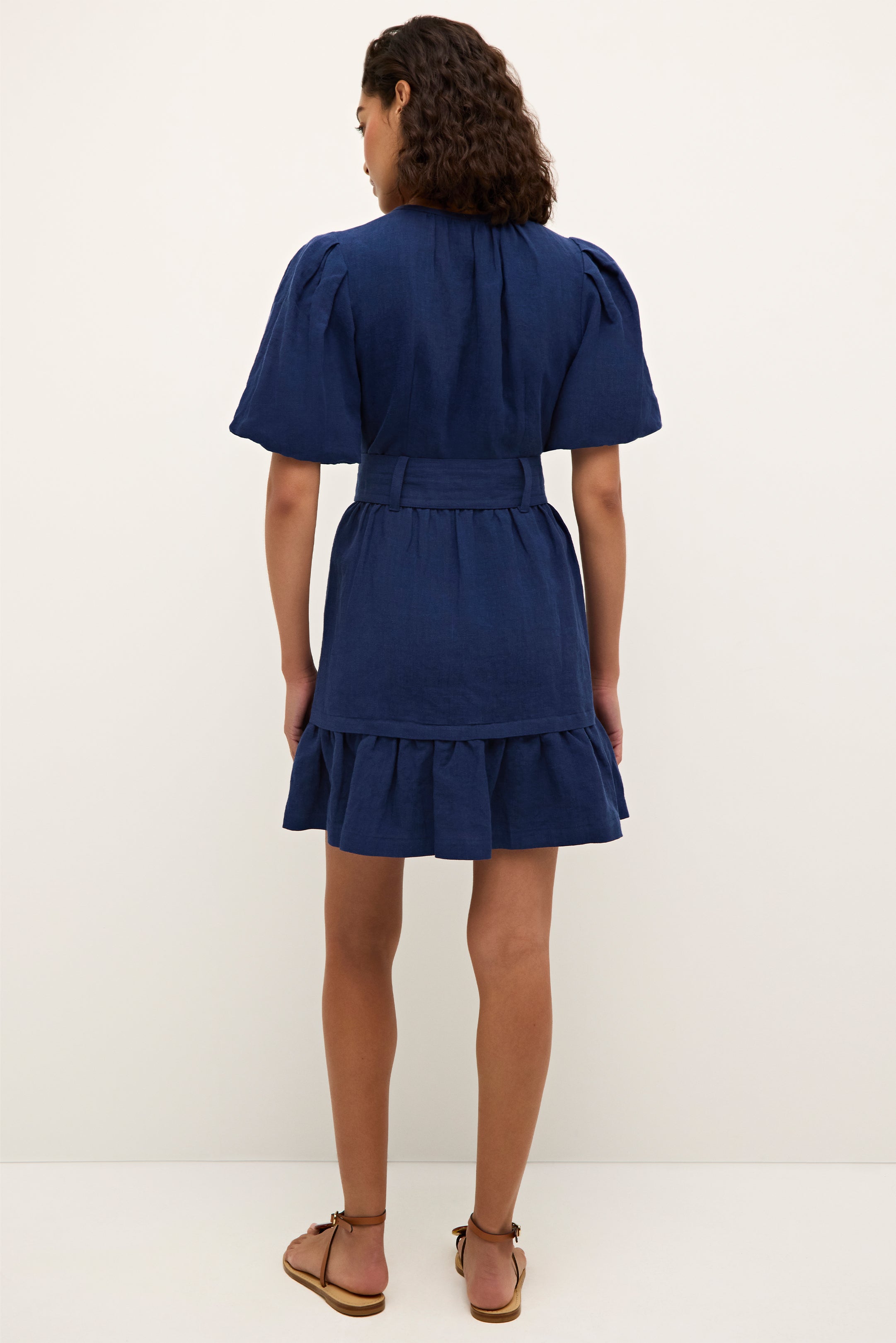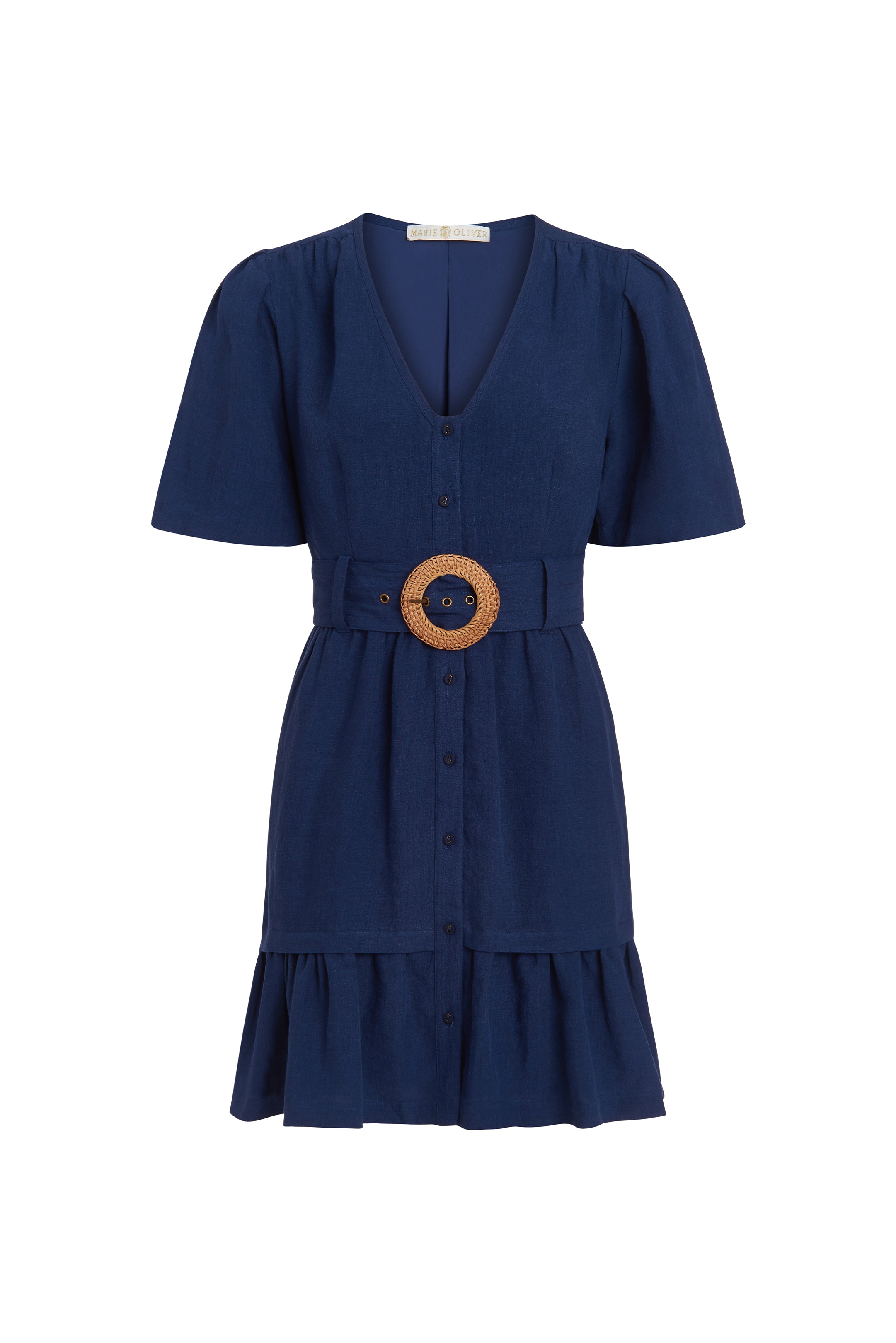 Toss on our signature button-front Gwenyth dress with flats, sneakers, or casual sandals and this linen blend silhouette will take you everywhere from brunch to a backyard barbecue to date night. Design details like Gwenyth’s bagged sleeves and statement rattan wrapped belt buckle elevate this little navy dress.