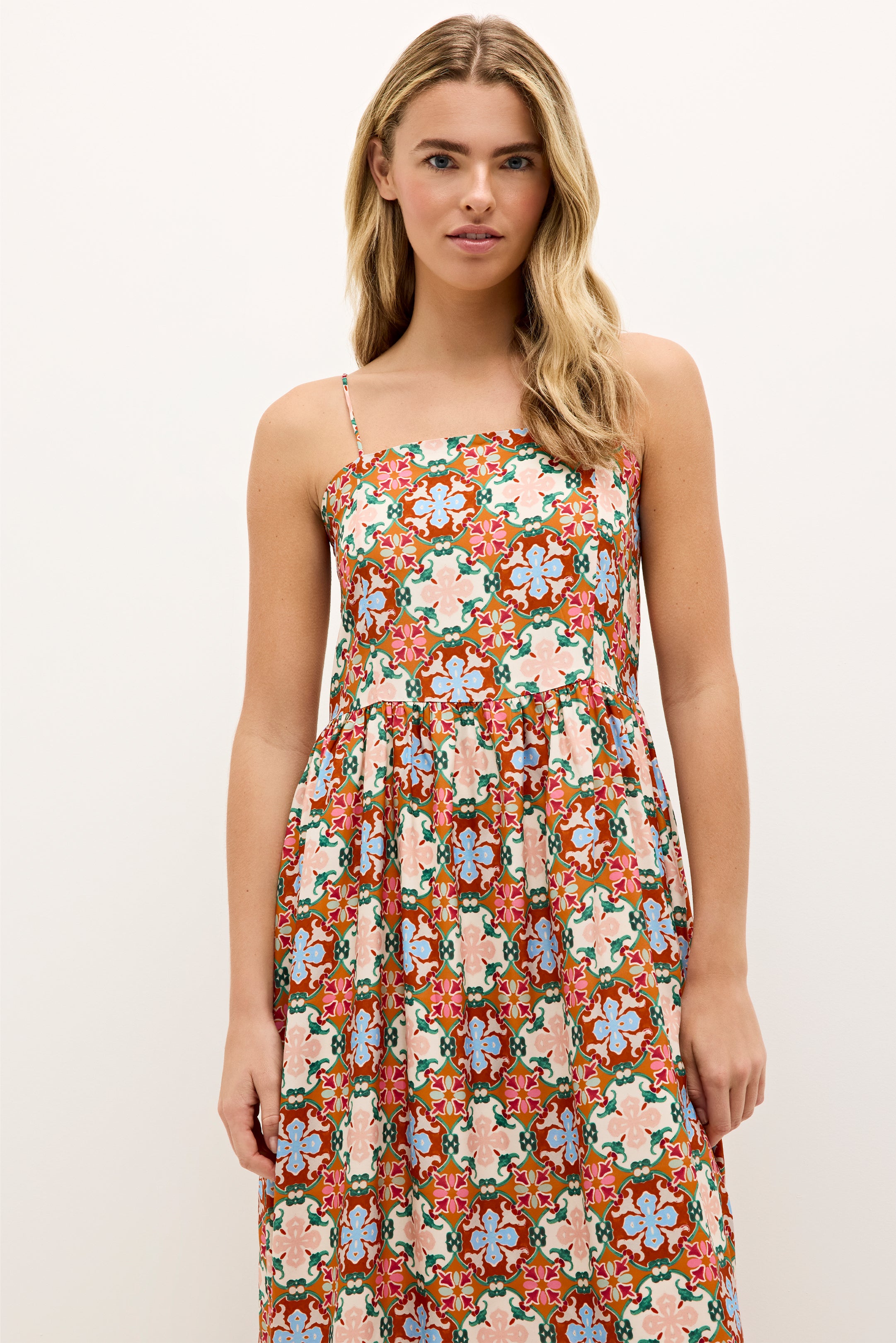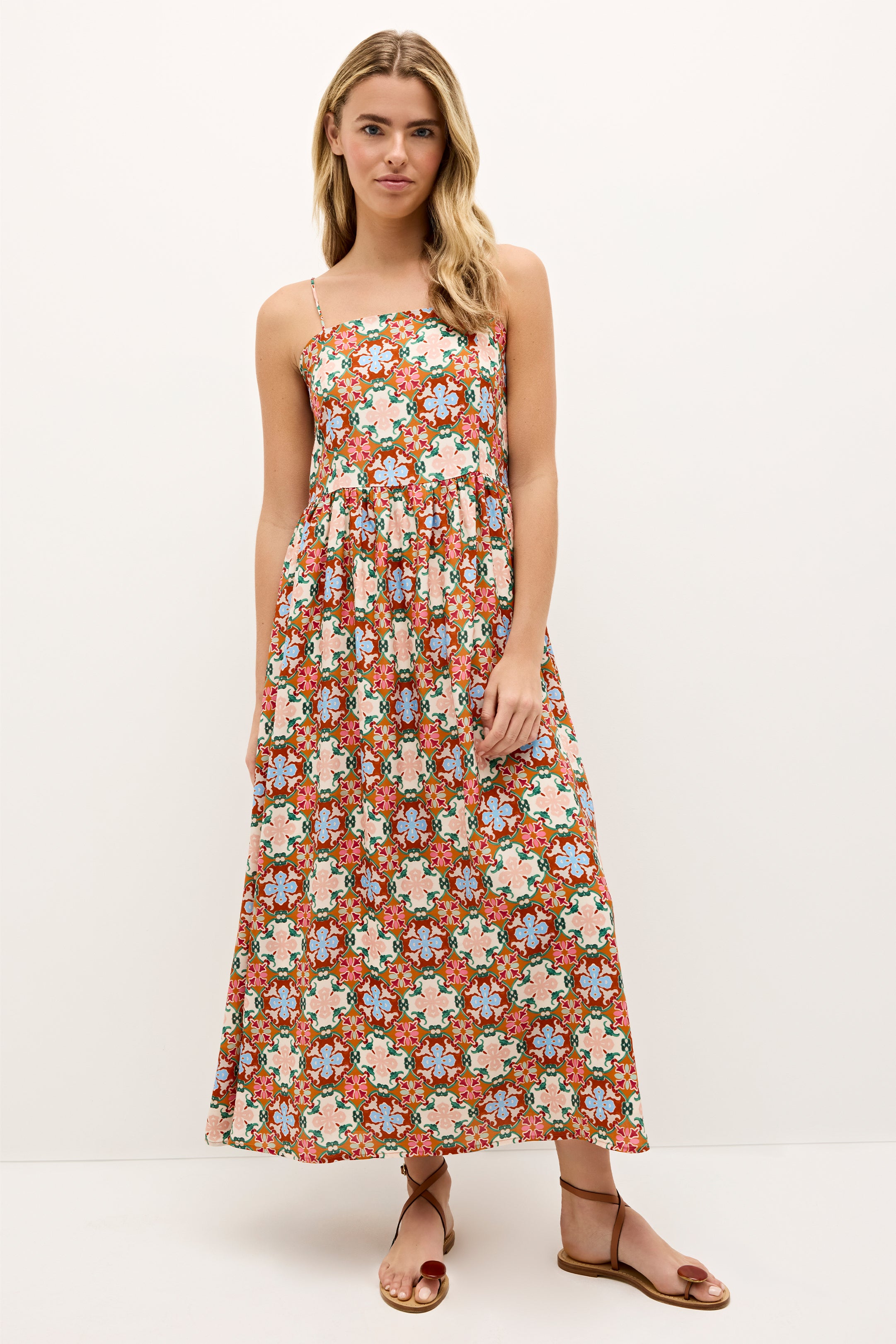 Josie is fitted at the bodice with a softer, silky drape through the midi-length skirt. Adjustable corded ties at the shoulders give it a customizable fit, but it’s the Mallorca-inspired Mosaic print with its architectural lines and Mediterranean color palette that make Josie this season’s party dress of choice.