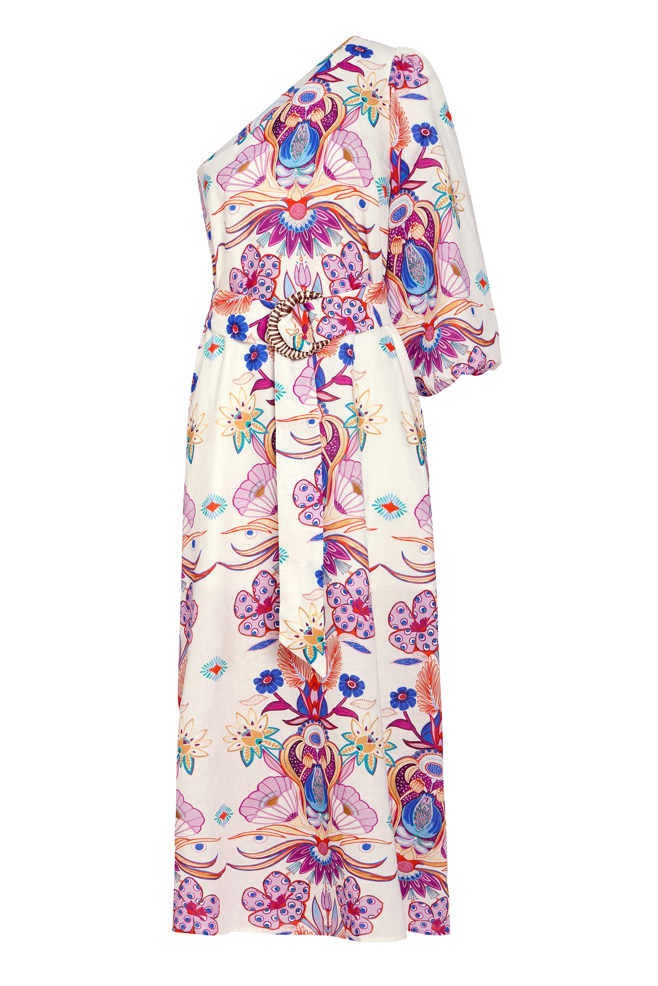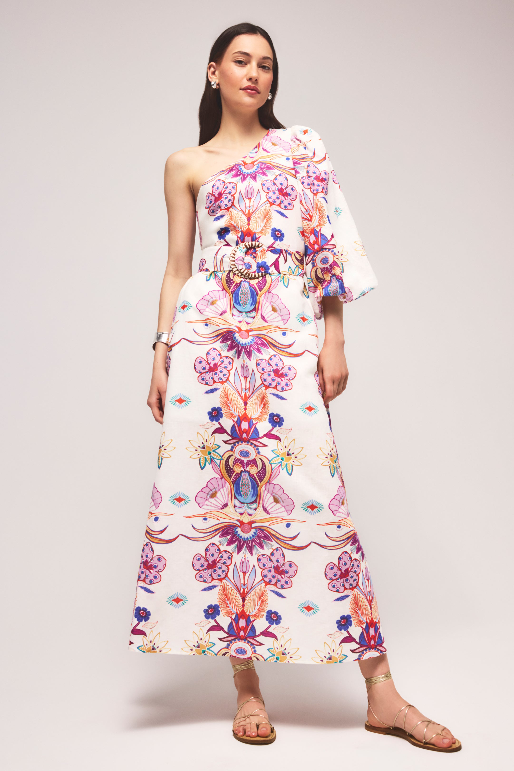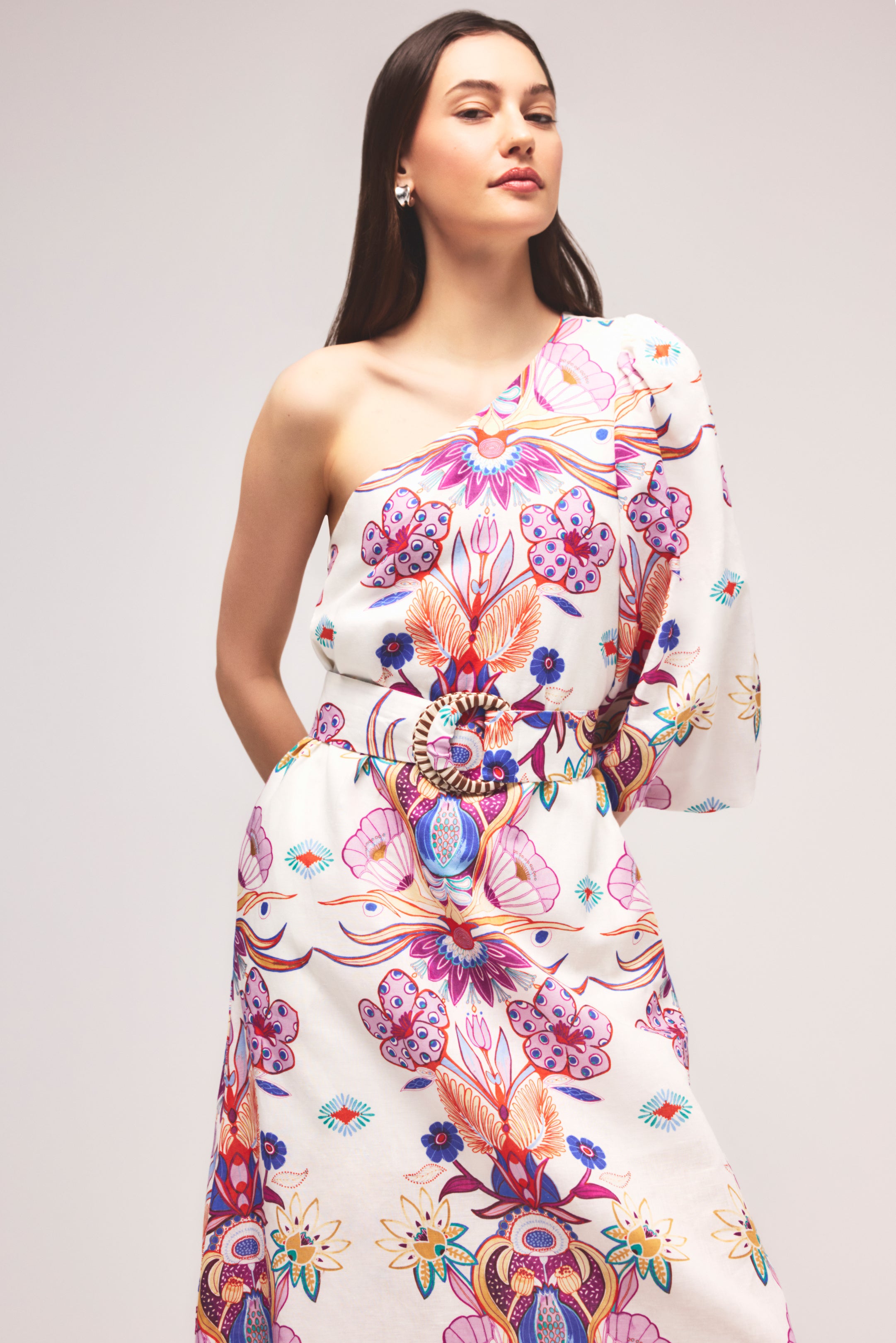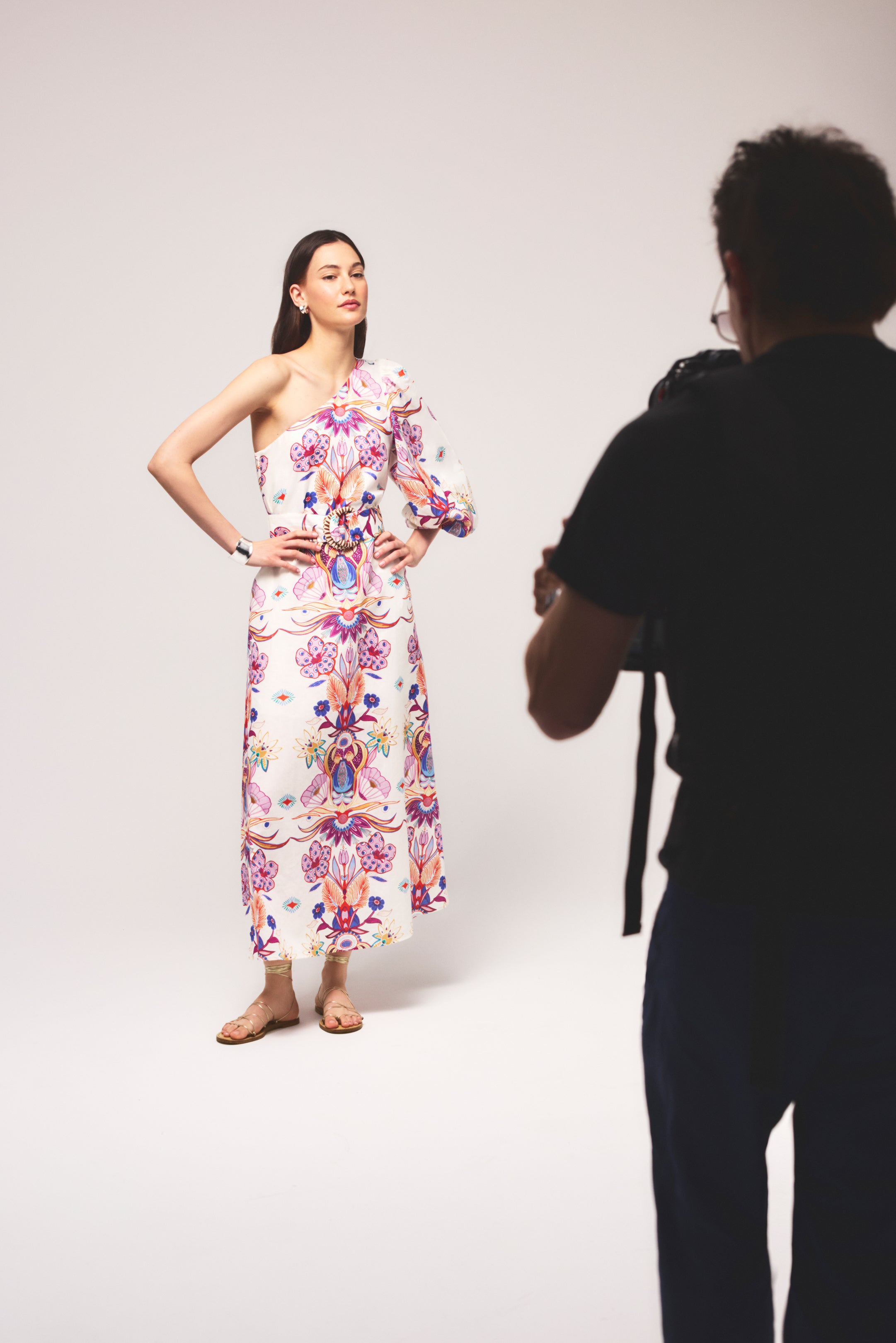 If there's one thing the Marie Oliver woman loves, it's a good party, and our dramatic, one-shoulder Kenna dress is made for celebrating. The customer-favorite special occasion style returns in our Lotus placement print as part of our limited edition 10th Anniversary Capsule Collection. Designed as a collector’s celebration, each piece in the capsule embodies the spirit of the Marie Oliver woman: artful, inspired, and always evolving. Quantities are limited.