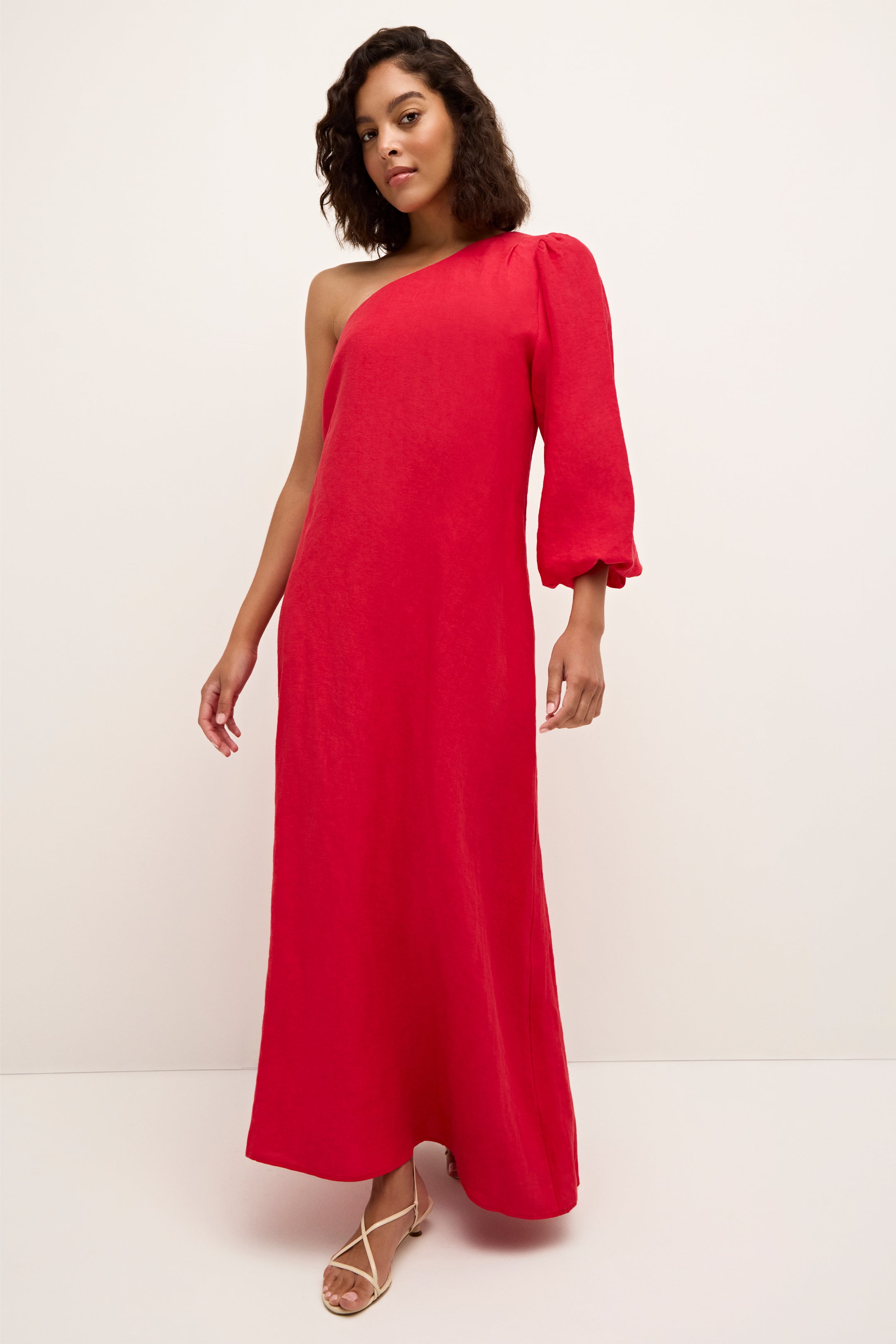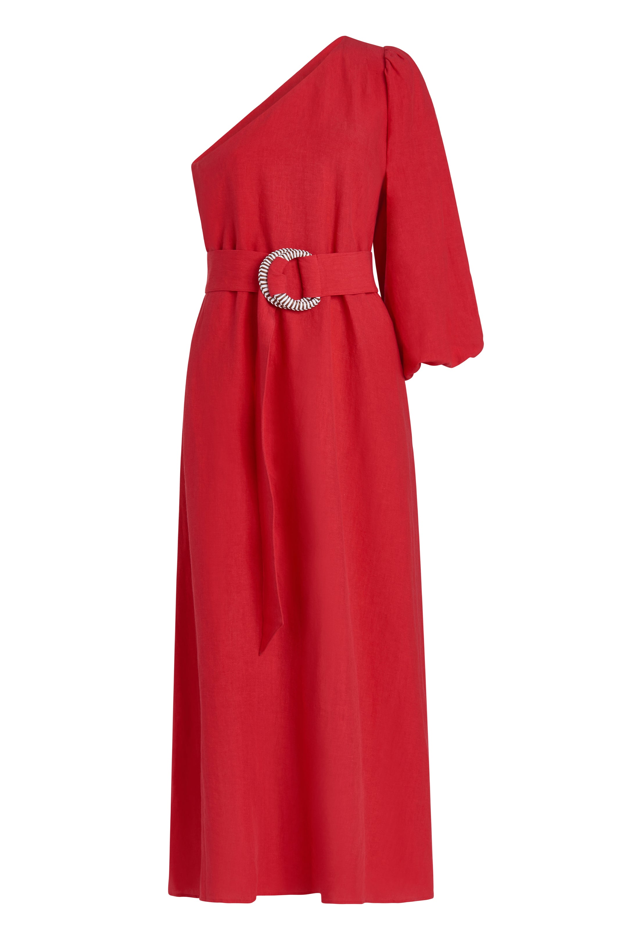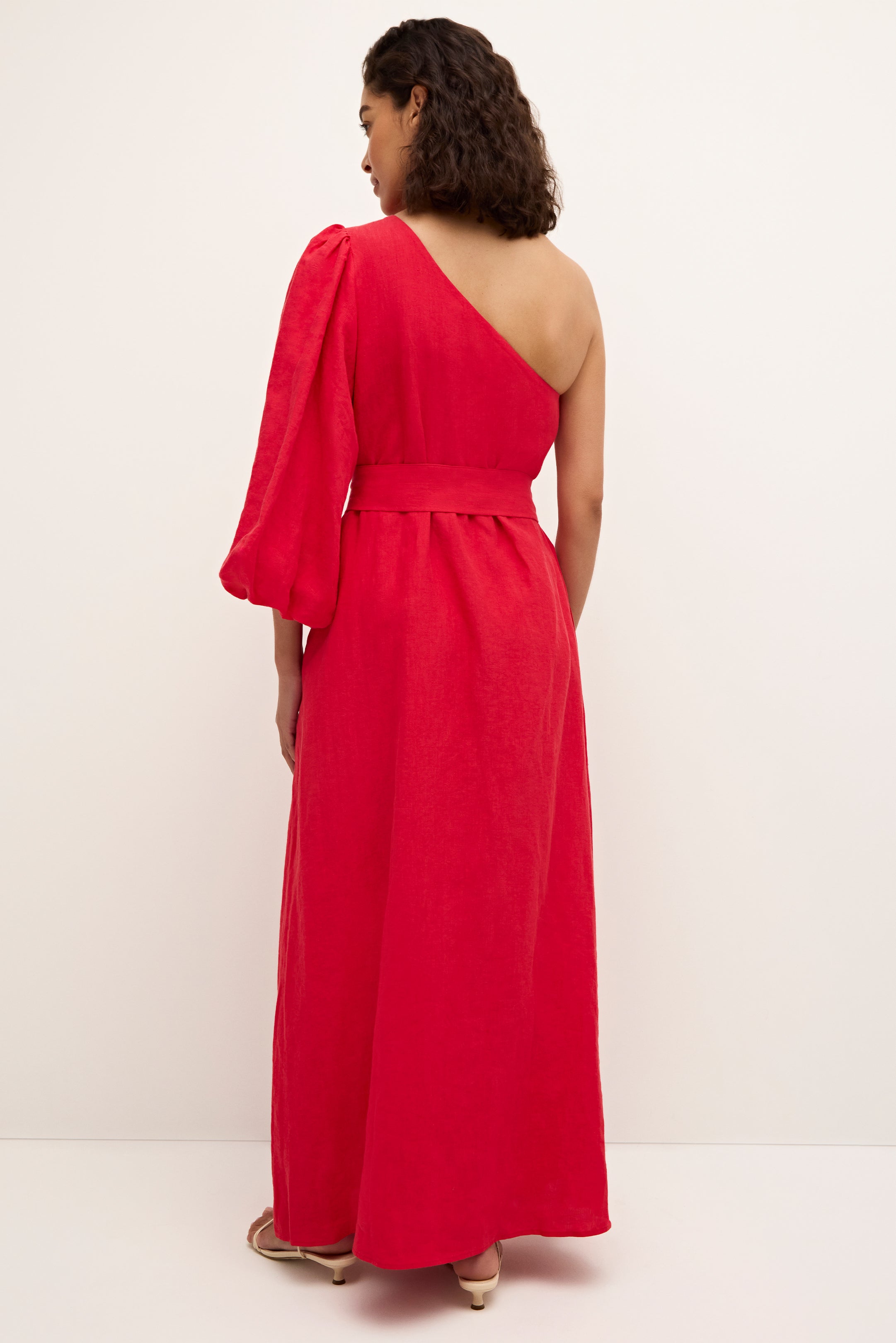 Our customer-favorite special occasion dress returns for summer in saturated Pepper red. Kenna features a dramatic one-shoulder bag sleeve and pretty brown and white raffia d-ring belt, which can be left on or off. Either way, this swingy 60s-inspired silhouette is ready for every RSVP, and guaranteed to illicit a few comments like, "where did you get that dress?!"