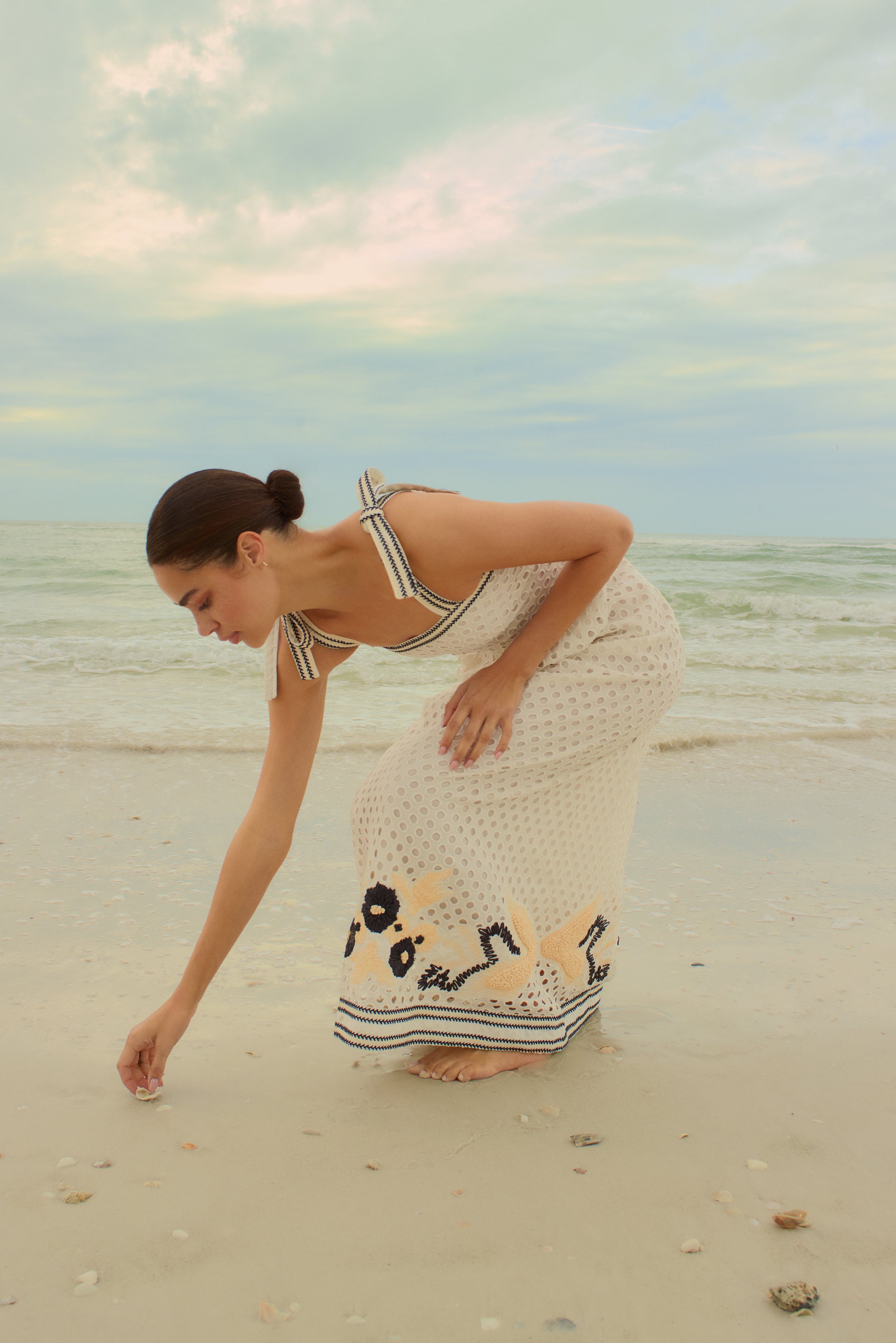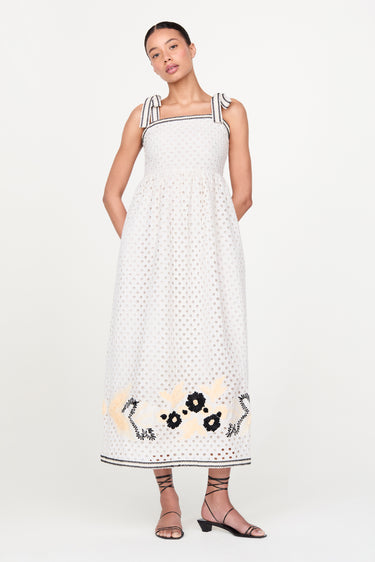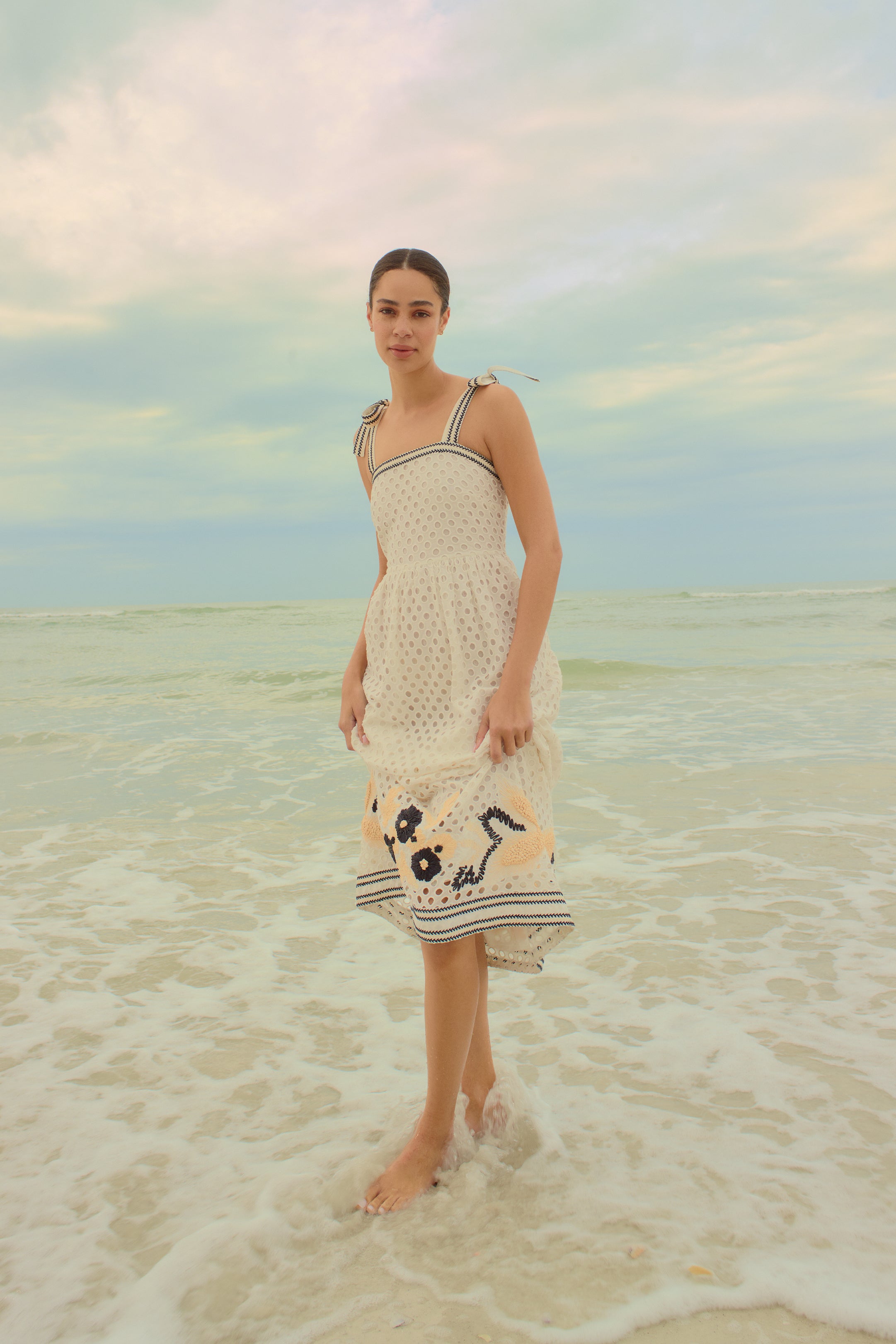 A great white dress is a summer wardrobe staple, and thanks to design details like the 100% cotton eyelet fabric and delicate embroidered elements along the adjustable straps and hemline, this simple silhouette goes from everyday staple to standout.