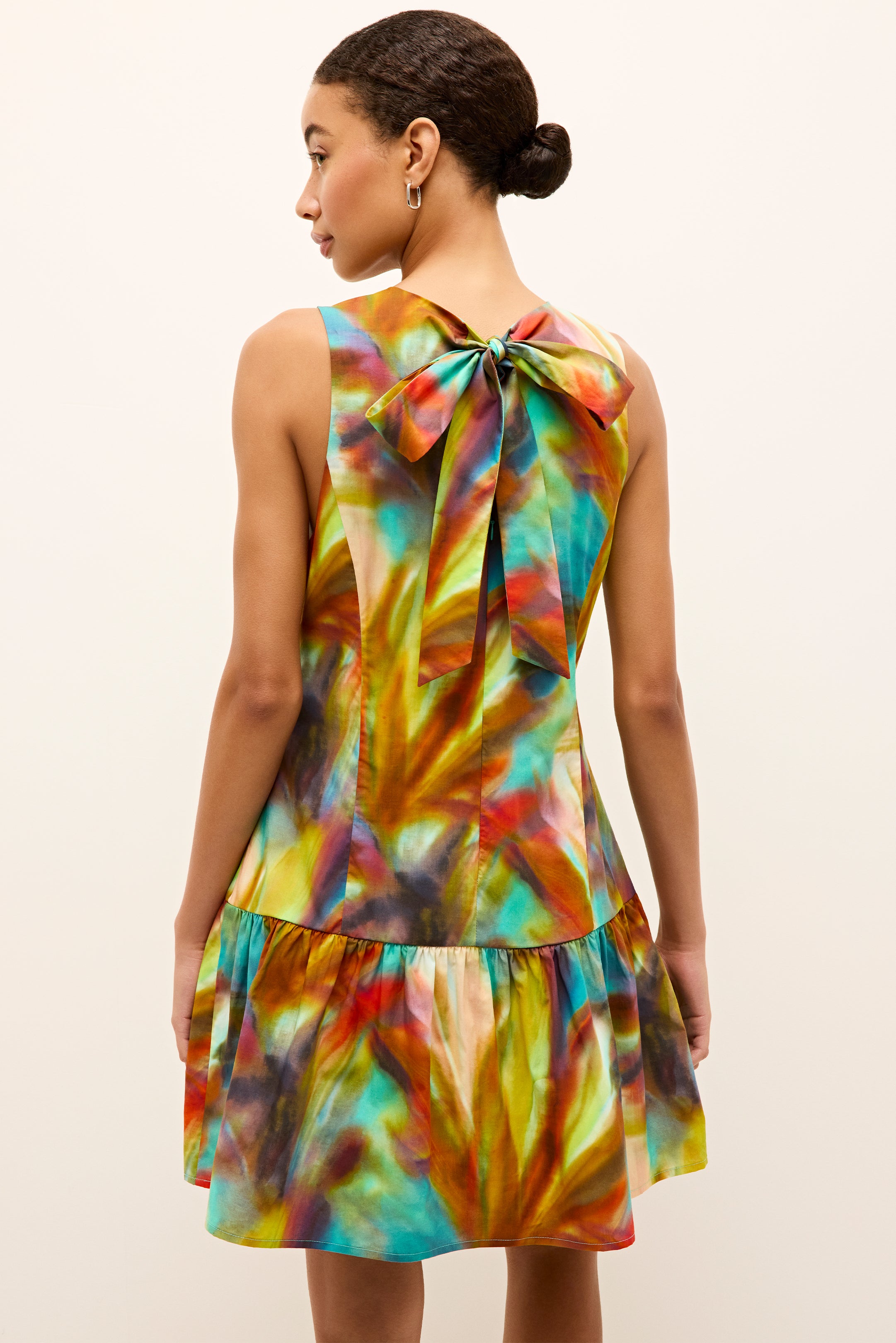 Made with celebrations in mind, this chic, rainbow-hued mini is a design team favorite for its stylish bow-back and a kicked-out hem. The A-line stunner is pictured here in Fauna, an abstract blur of colorful palm fronds.