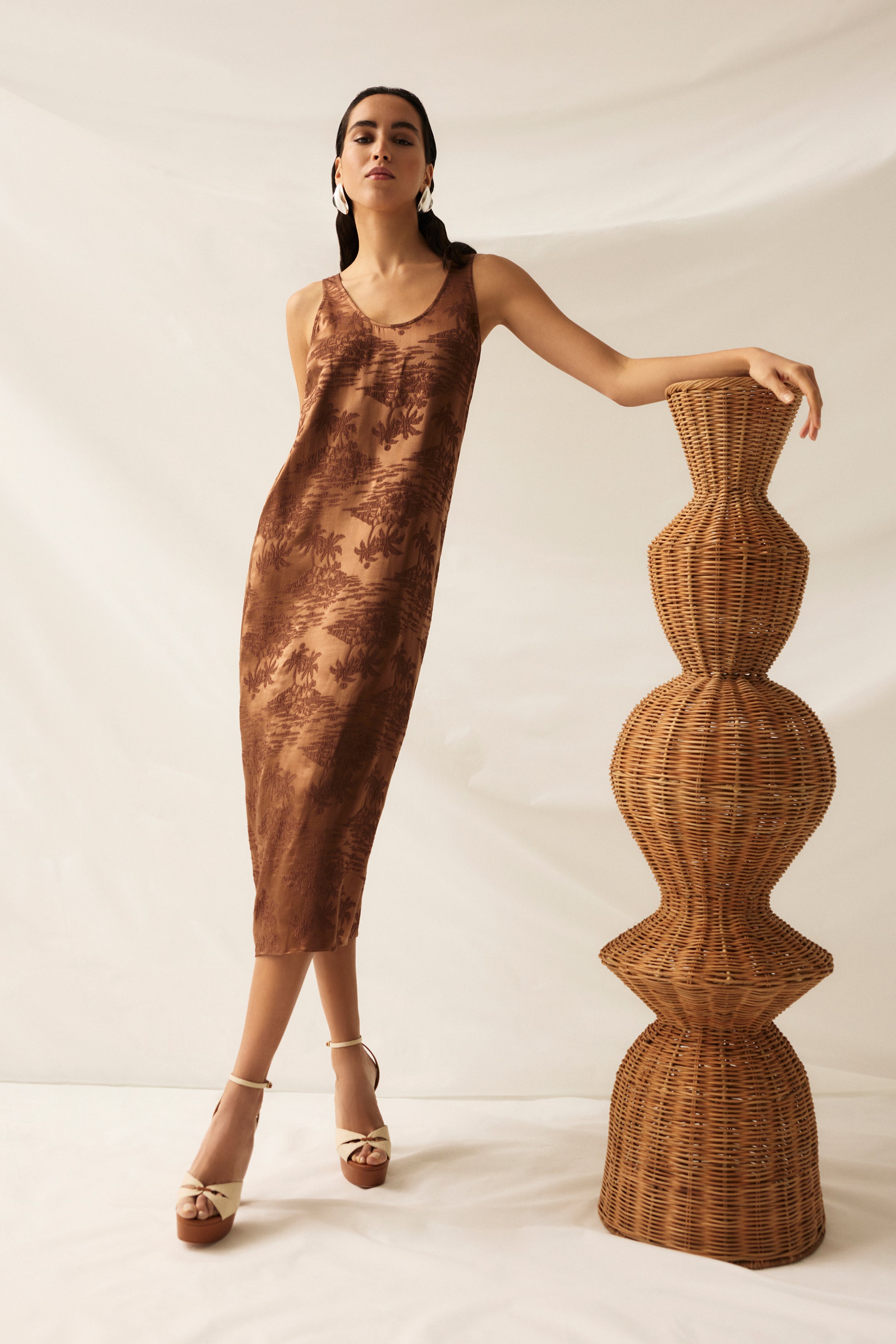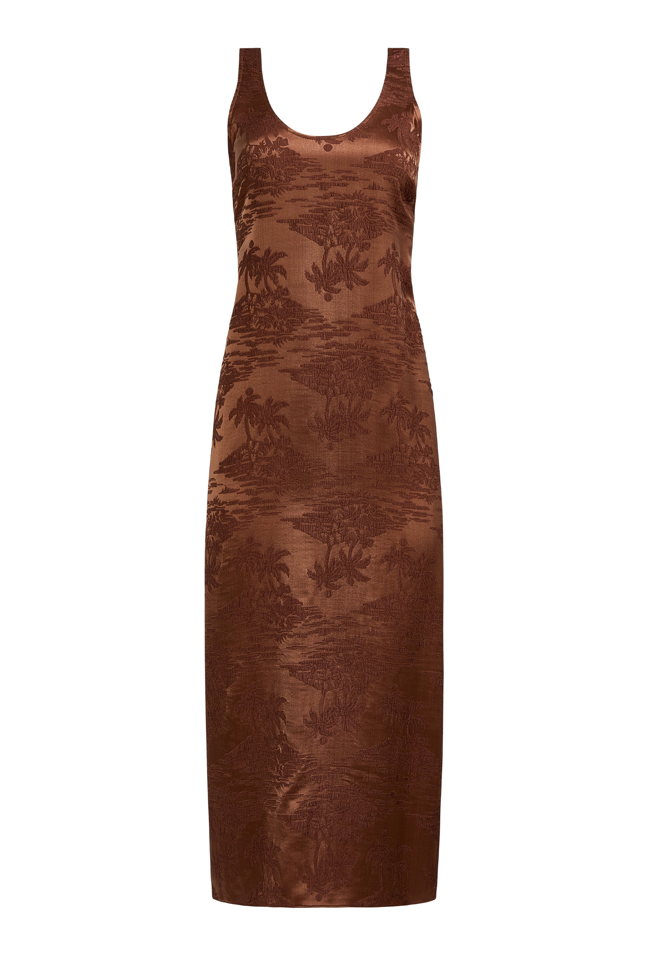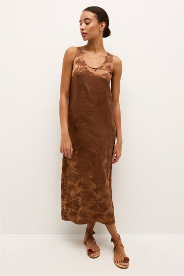 Our relaxed midi-style Olympia dress is the embodiment of easy elegance. Made from a palm-printed jacquard silk in a warm Cappuccino brown, the relaxed silhouette features a deep scoop neck at the front and back.