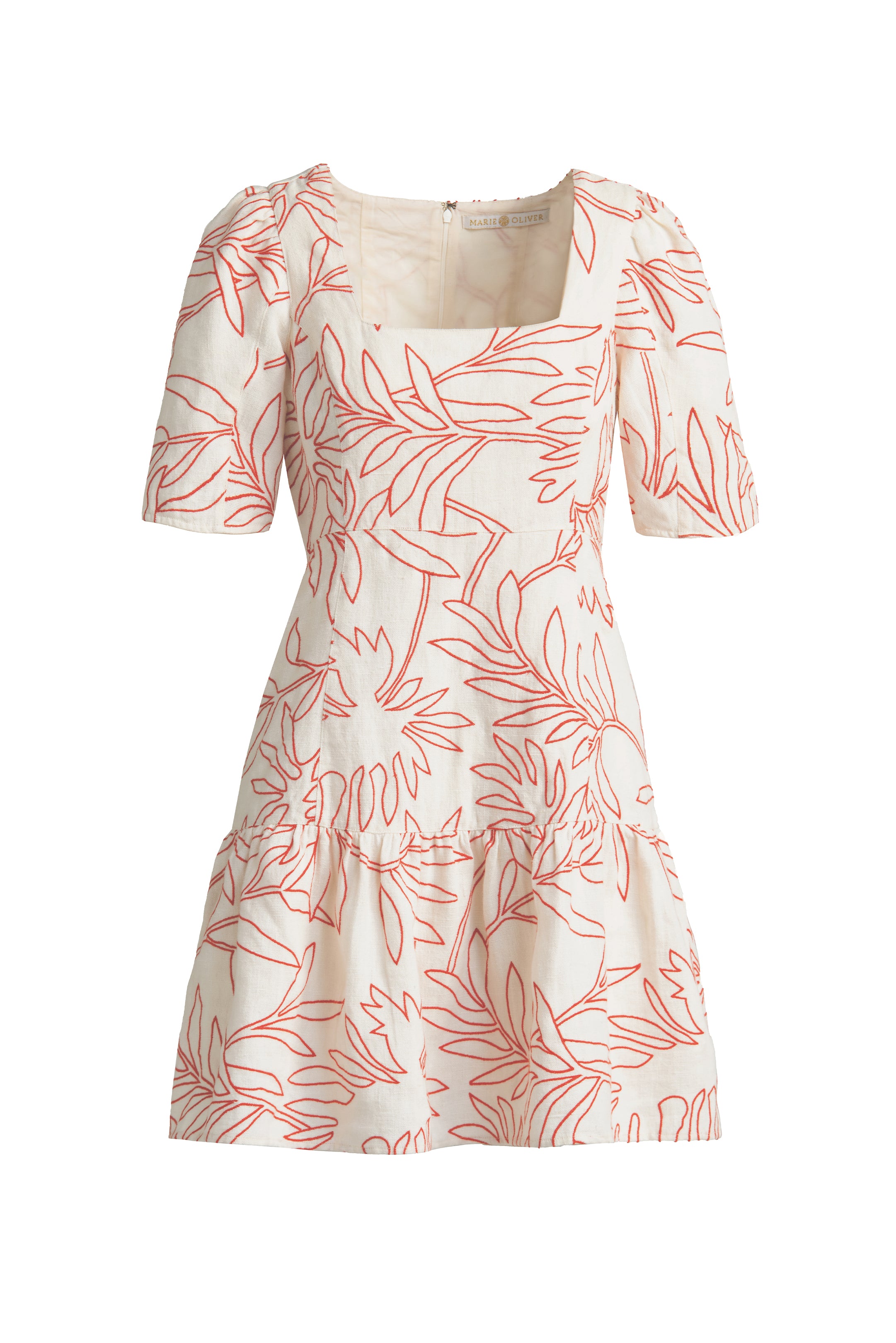The new Temma dress blends signature Marie Oliver elements with tailored sophistication. A modern square neckline and princess seams flatter the form, while the standout Tigerlily print features embroidered allover florals in a bold red-and-cream palette that brings the feel-good factor.