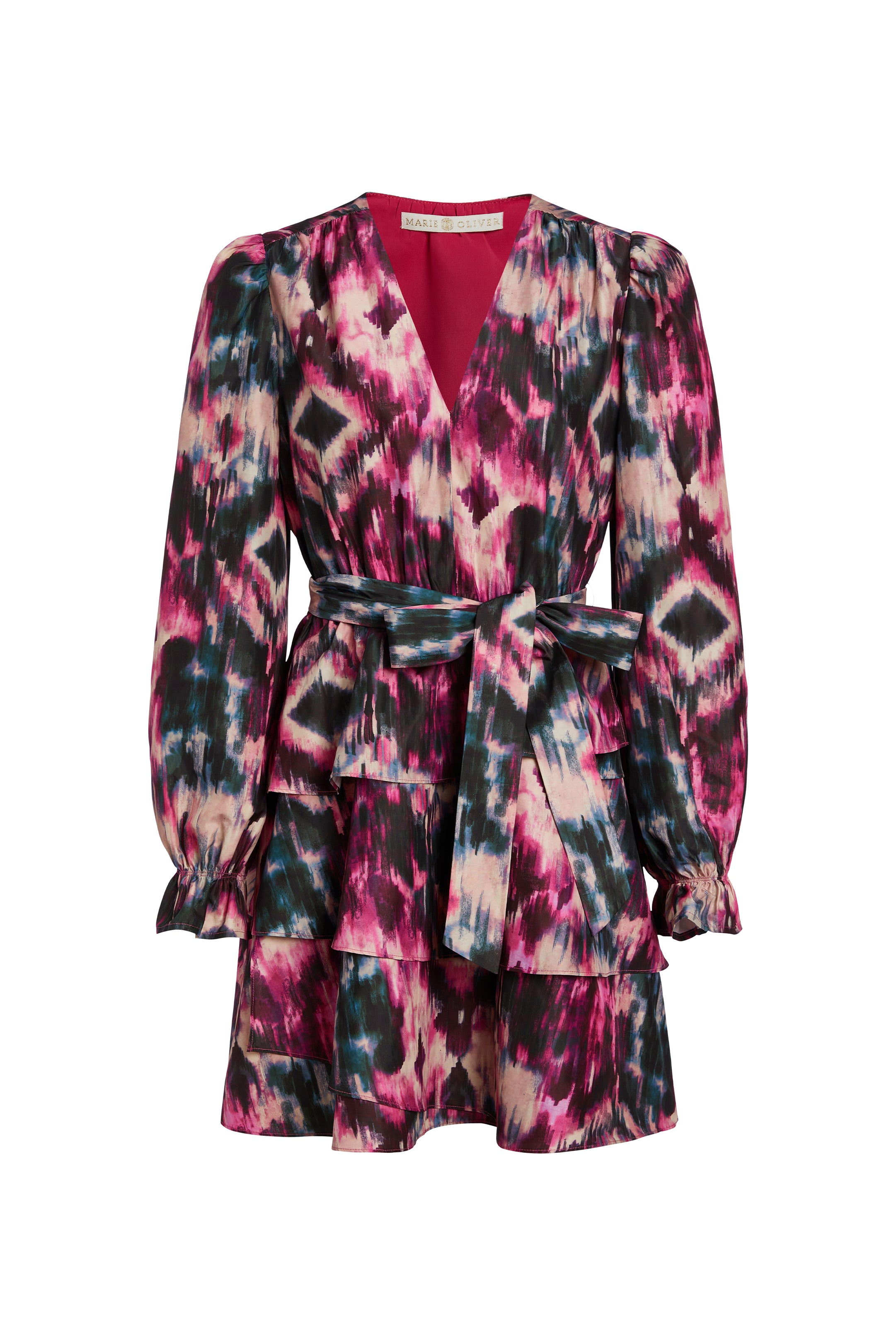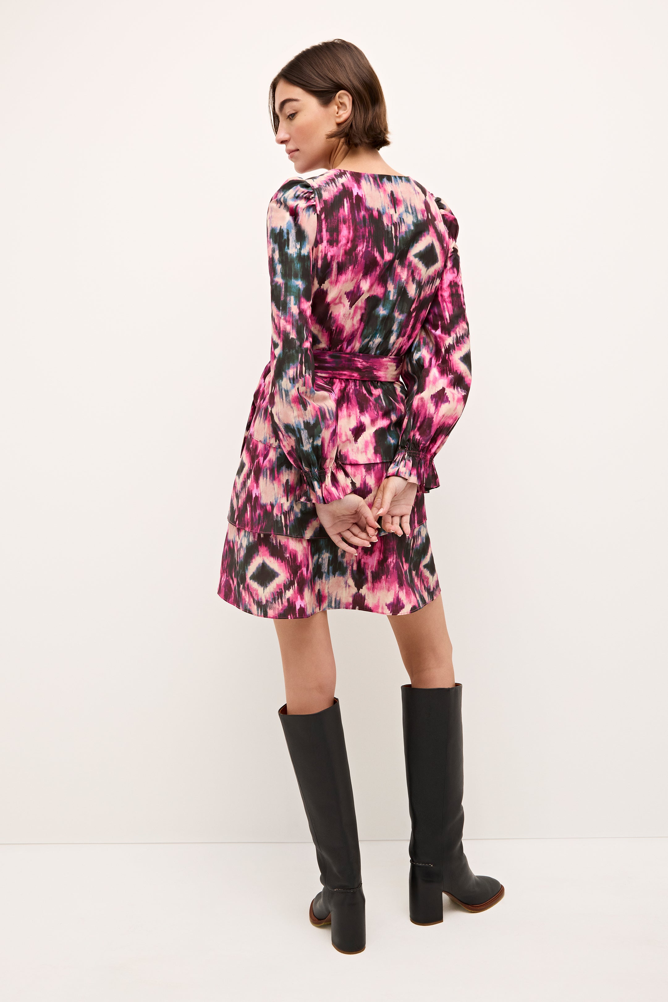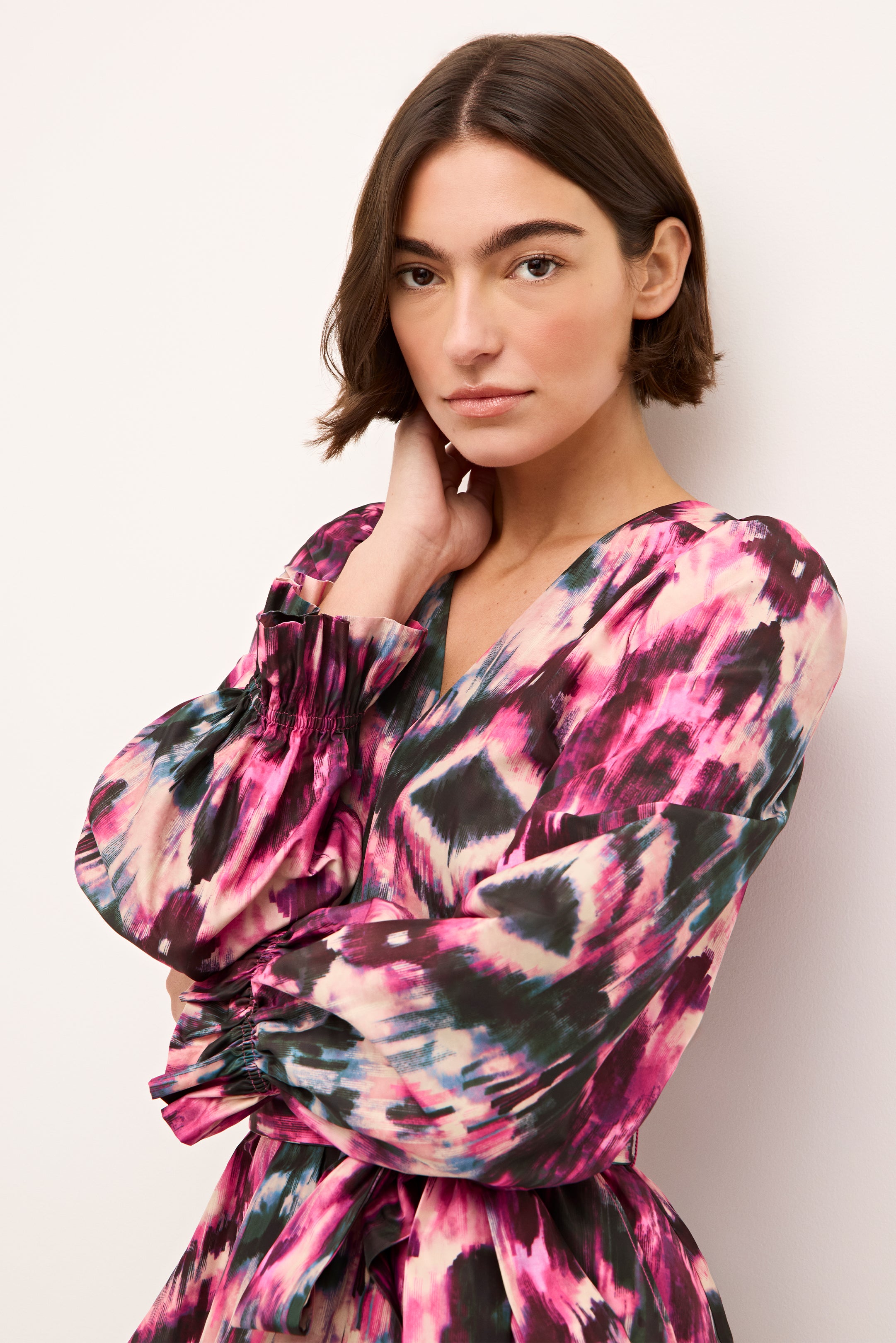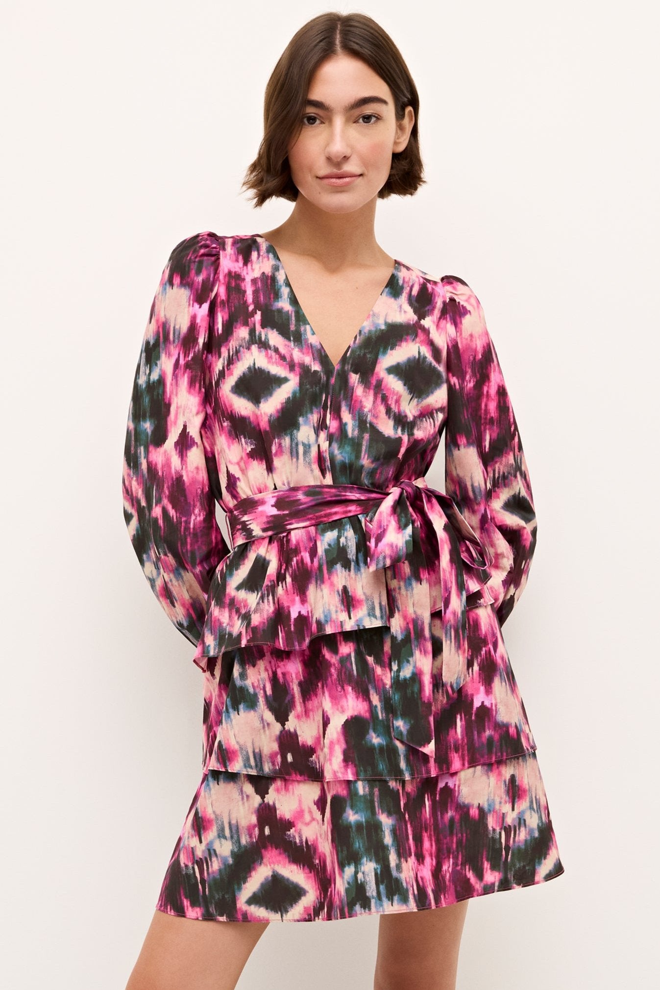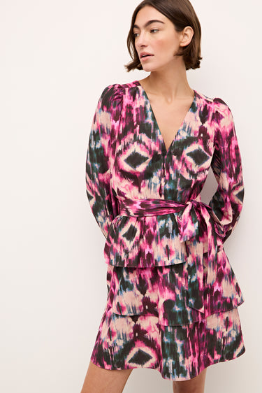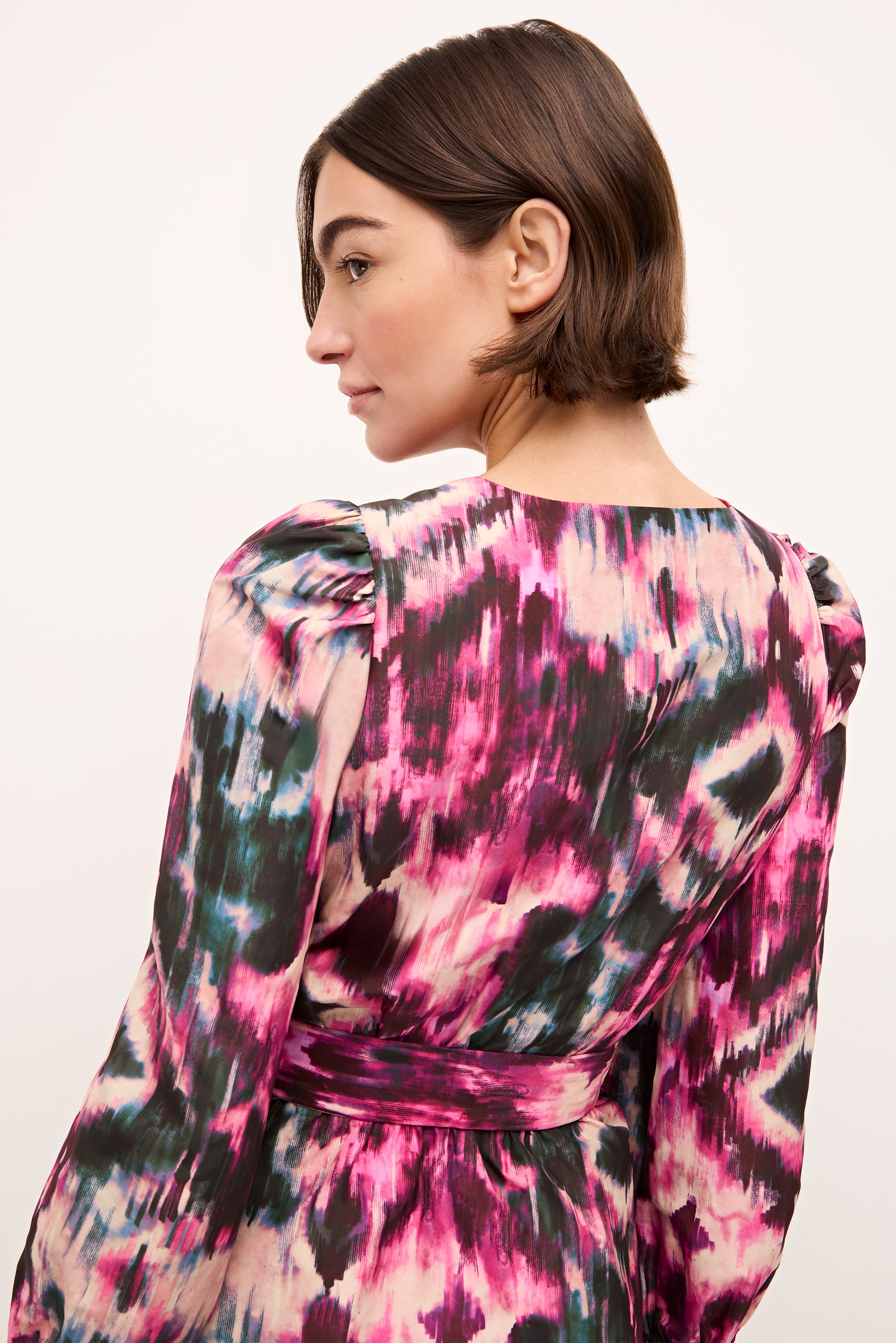 A true cocktail party style, Umbra is cut from a luxe printed taffeta—pictured here in an inky ikat grounded in bright fuchsia—and features a flattering v-neck, fitted elastic waist, asymmetrical ruffles, and an optional tie belt.