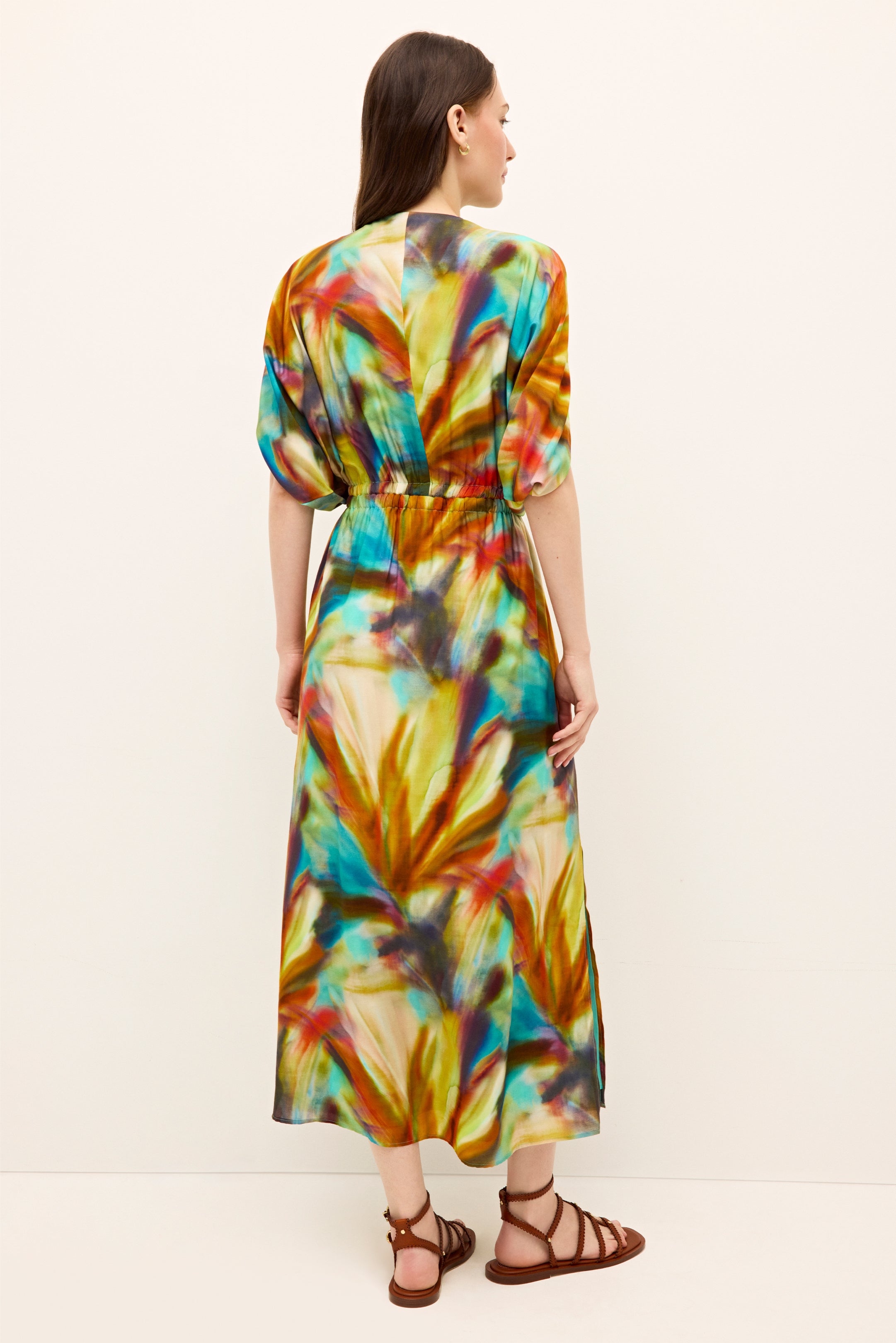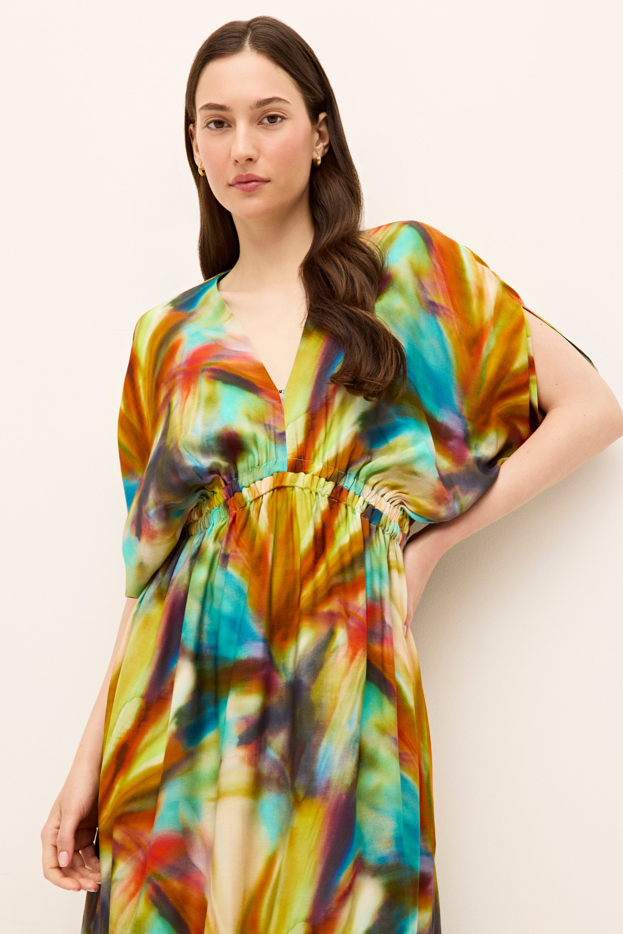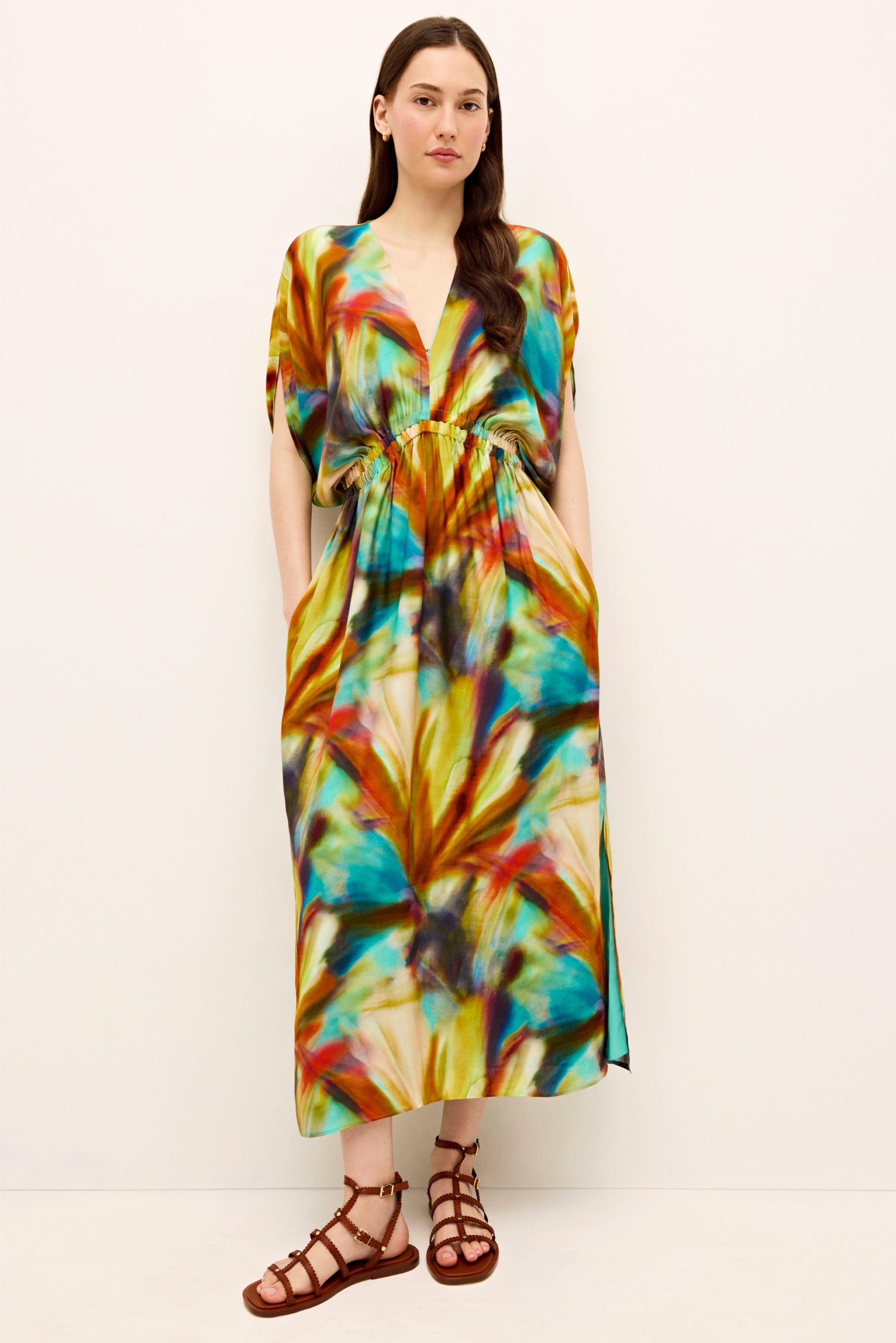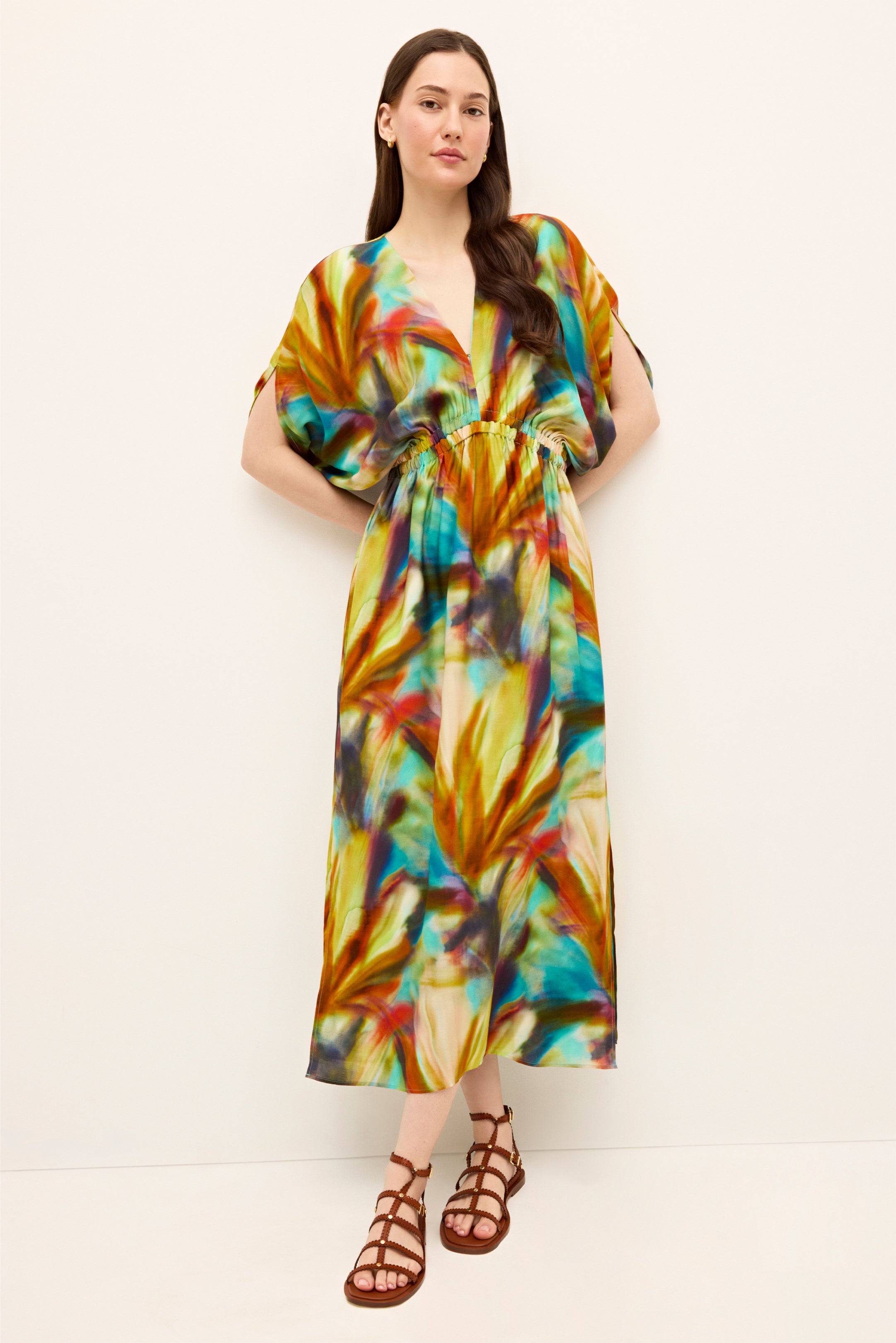 Our Venus Caftan is back and we’re dreaming of sandy beaches, salt air, and sunshine, especially in our new Fauna print, an abstract blur of colorful palm fronds that feels ripped straight out of paradise. The core Marie Oliver silhouette is as easy to wear as ever, featuring a cinched elastic waist, wide dolman sleeves, and pockets.