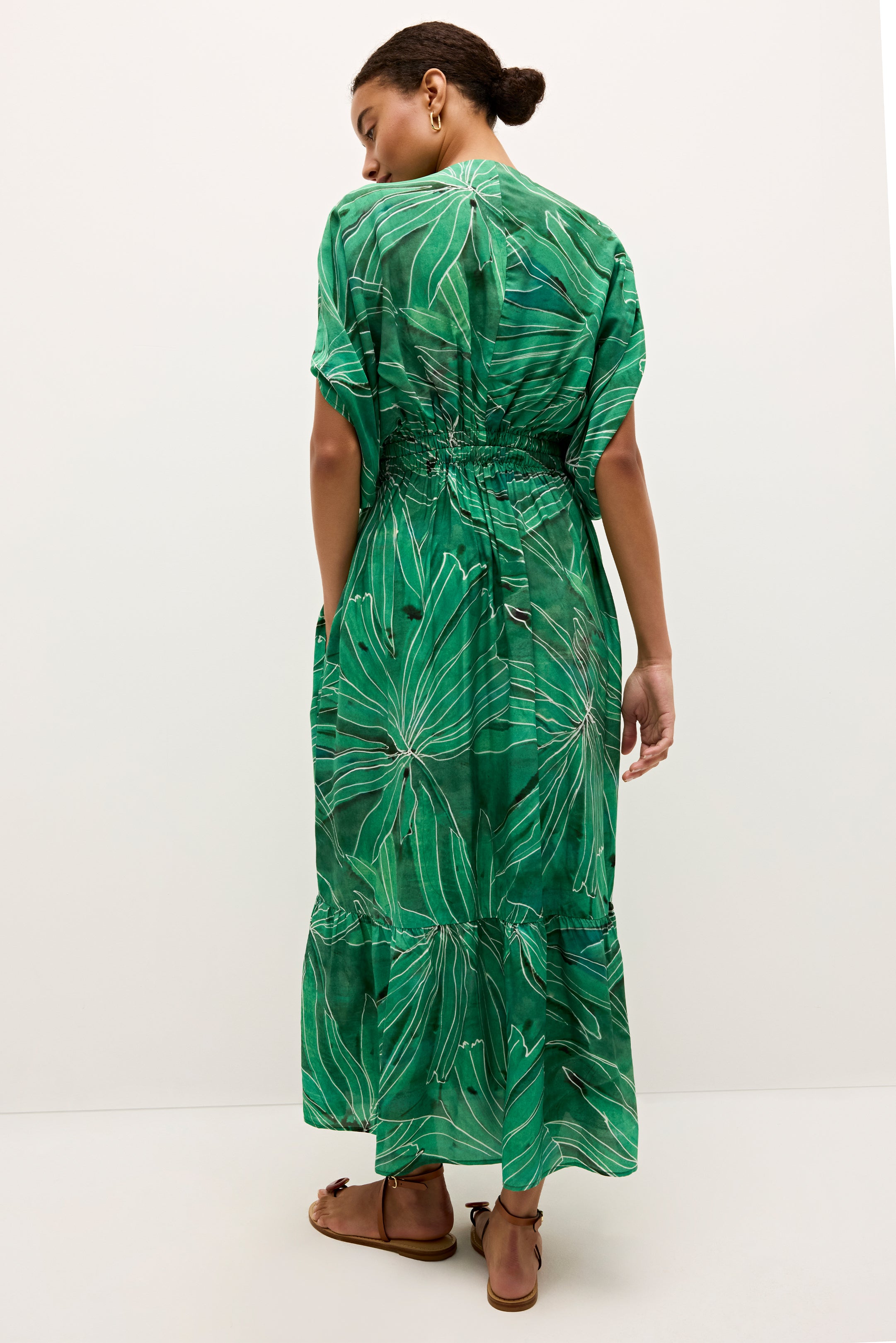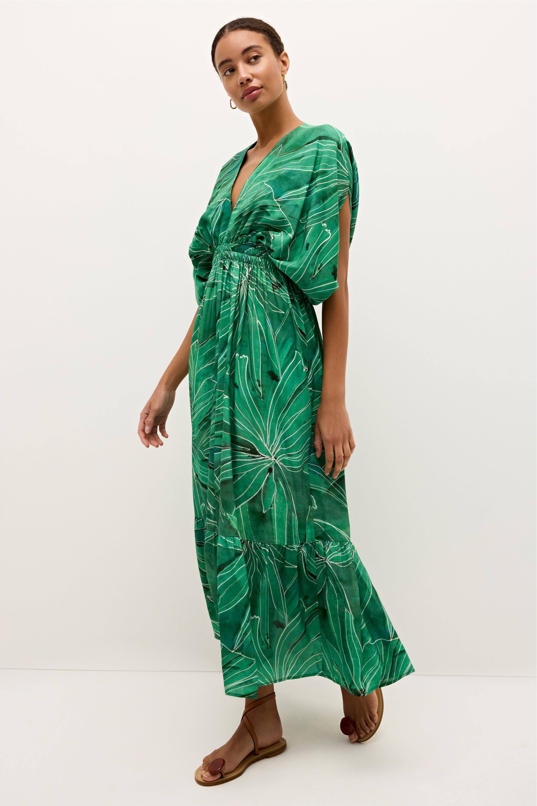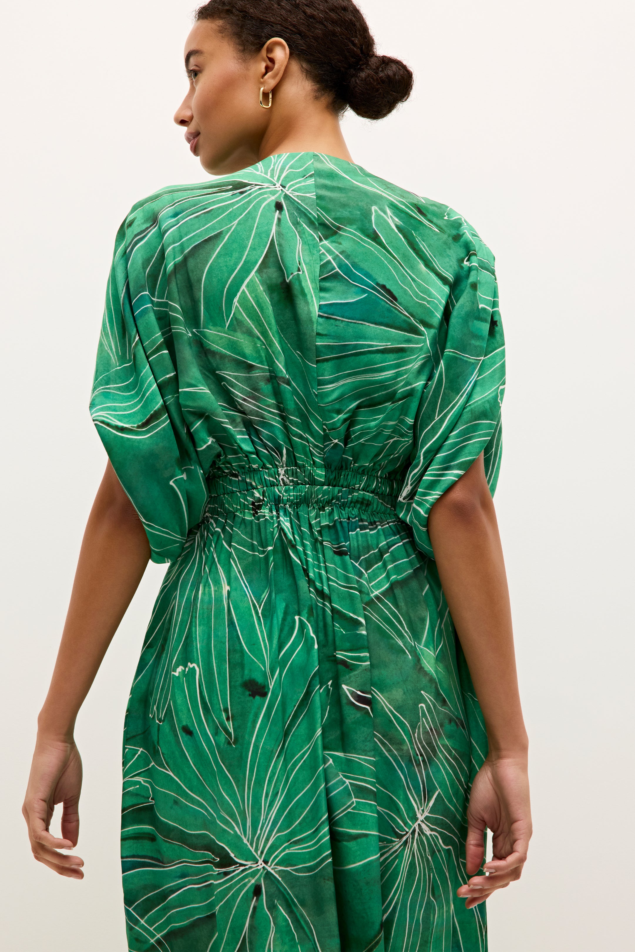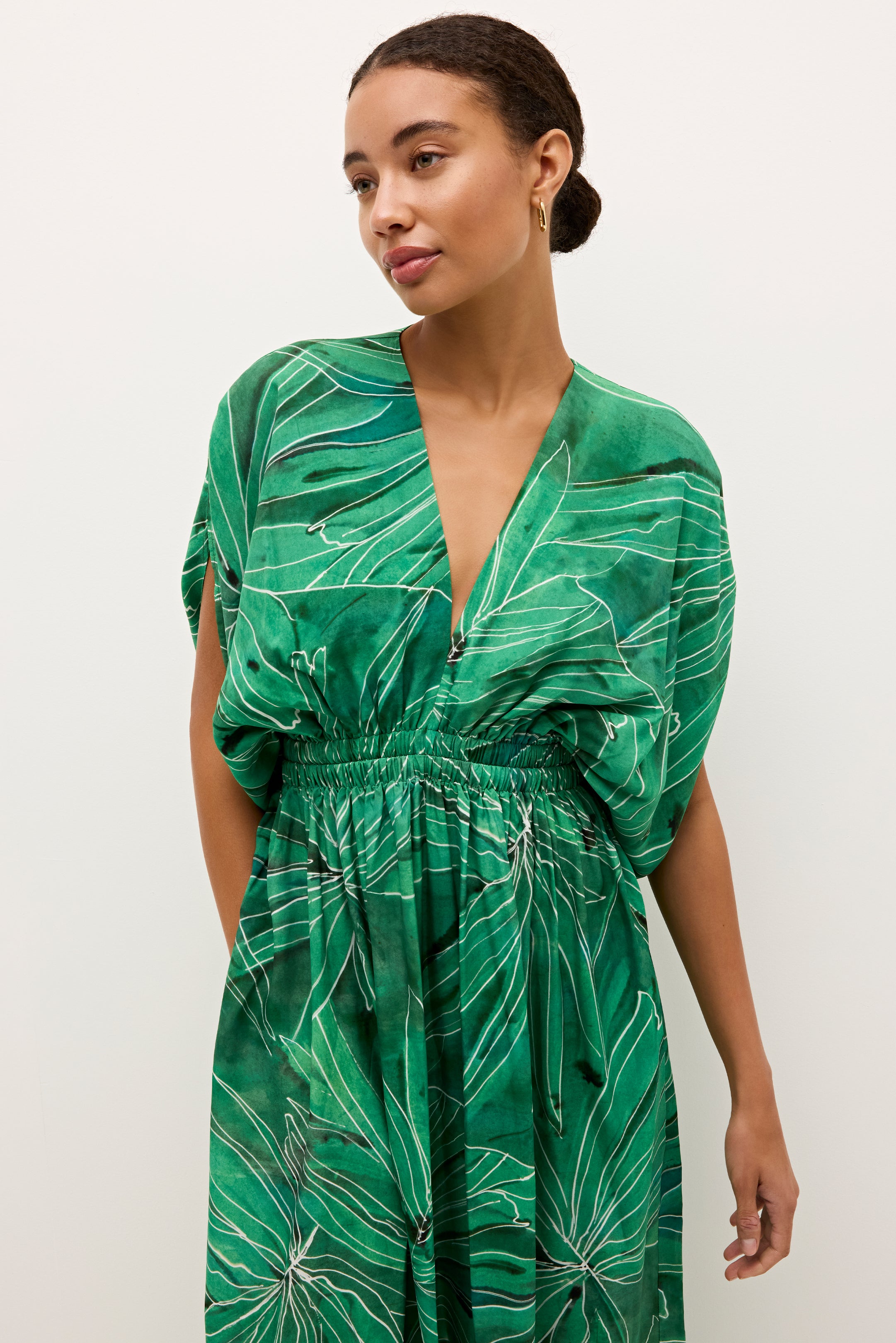 Our Venus Caftan is back, and she already has us dreaming of sandy beaches, salt air, and sunshine, especially in this emerald green botanical. The core Marie Oliver silhouette is as easy to wear as ever with a cinched elastic waist, wide dolman sleeves, and pockets.