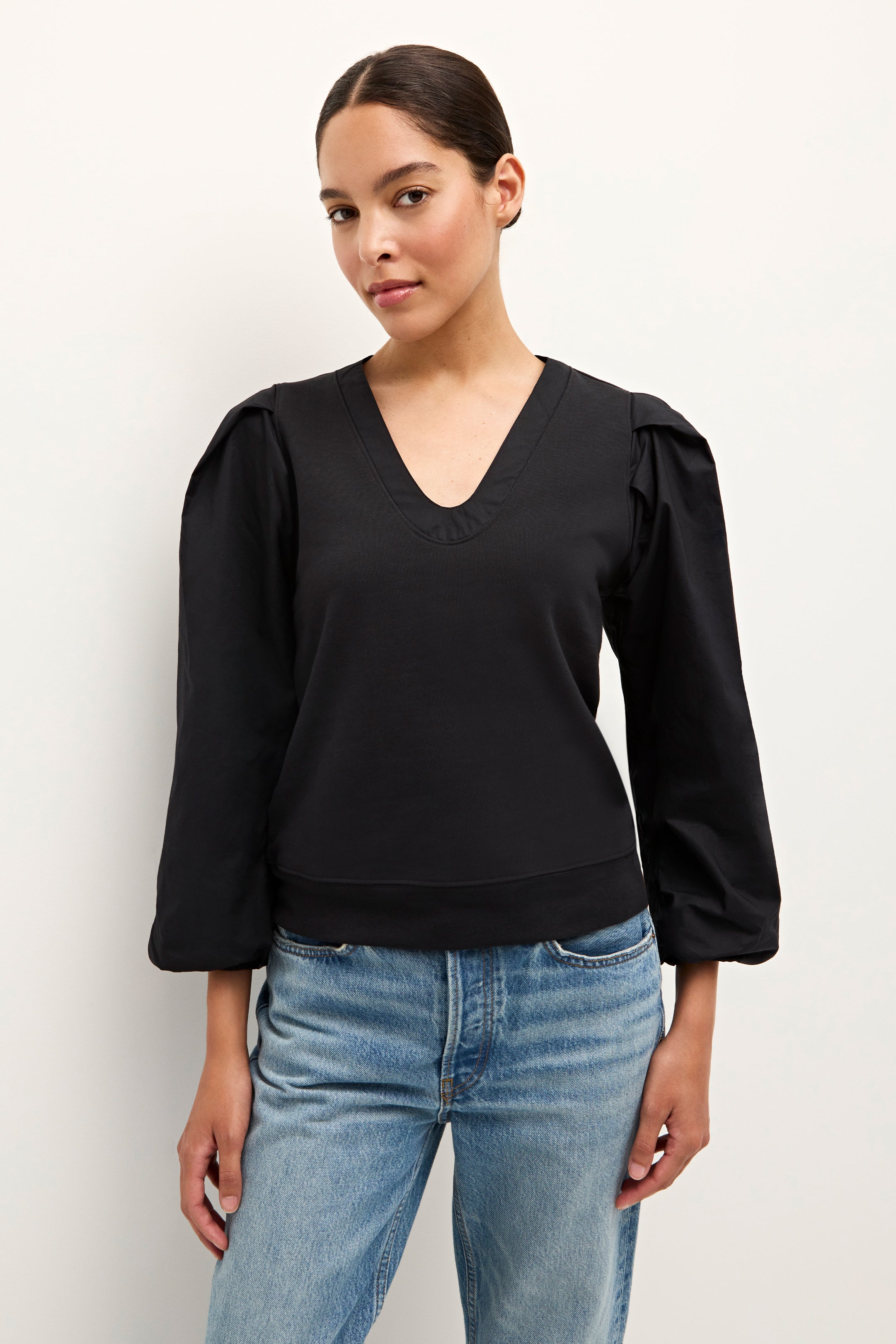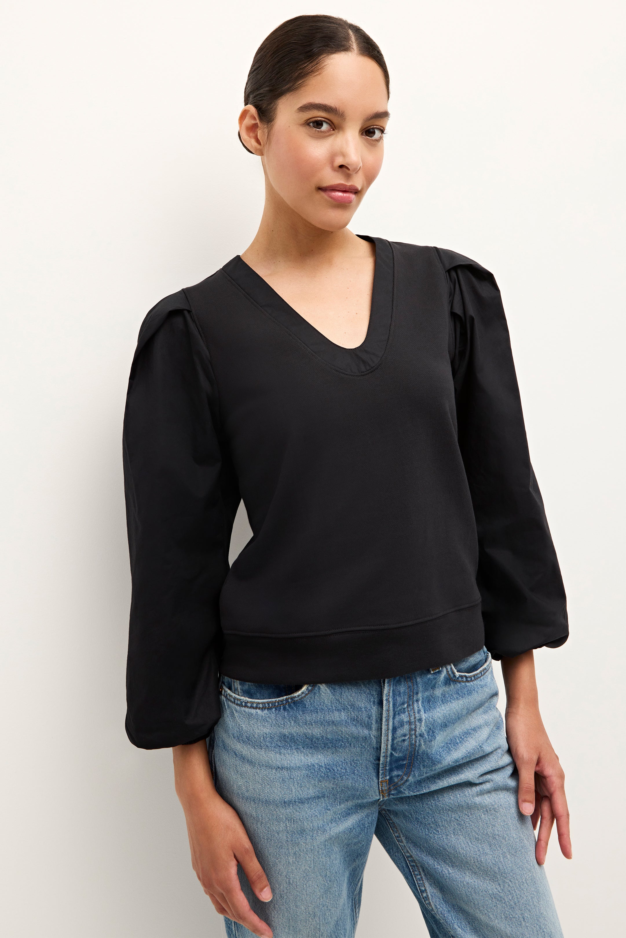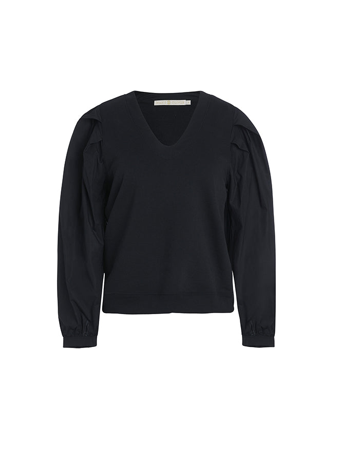 -French Terry Body with Pleated Full Long Sleeve Made From Cotton Poplin