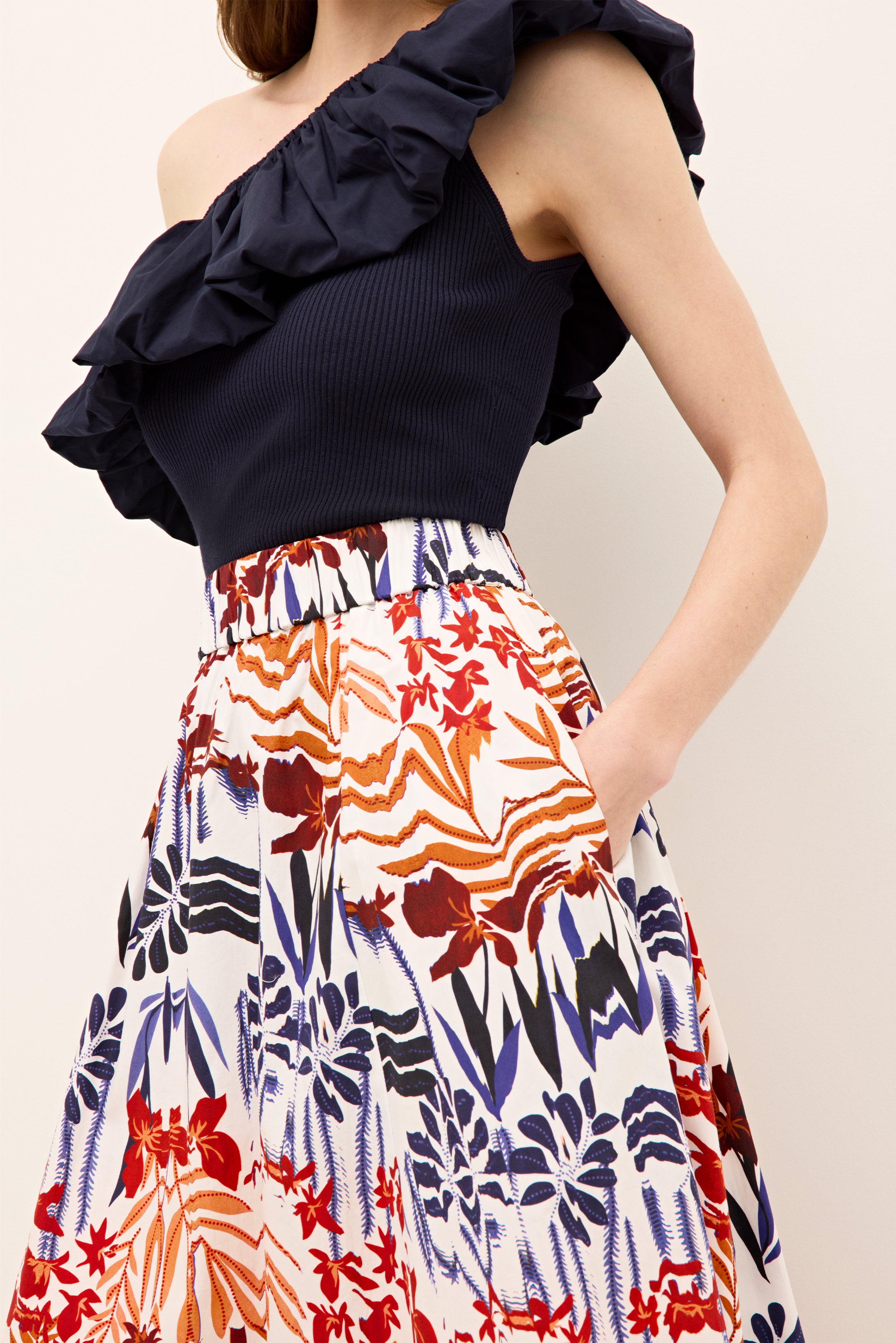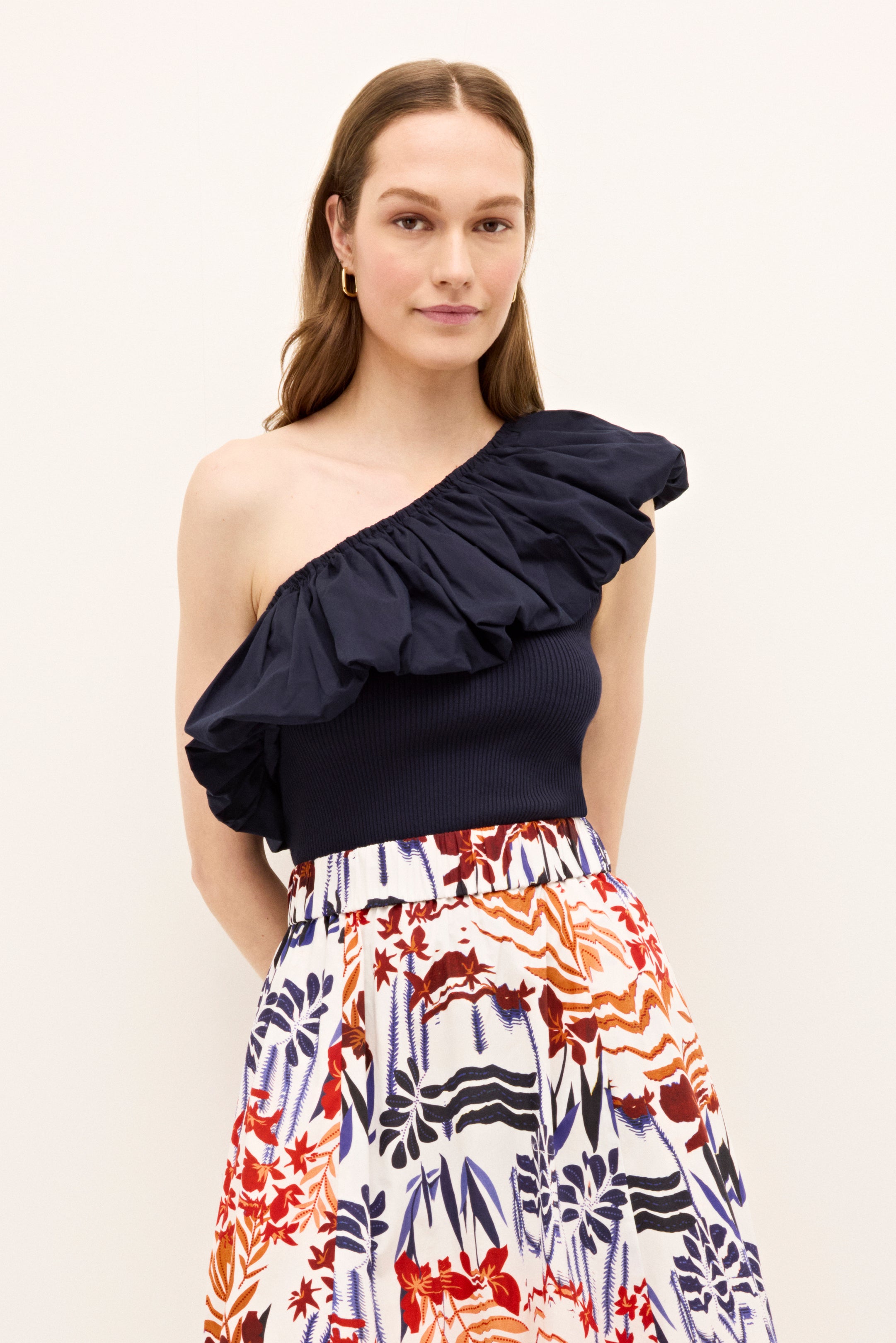 For the Marie Oliver team, this statement-making top sits in the number one slot on our must-have list this season—and now it's available in classic Navy blue. The one-shoulder silhouette features an oversized ruffle at the neckline for added drama and femininity. Pair Lucy back to any of this season’s printed skirts and shorts, particularly Sasha.