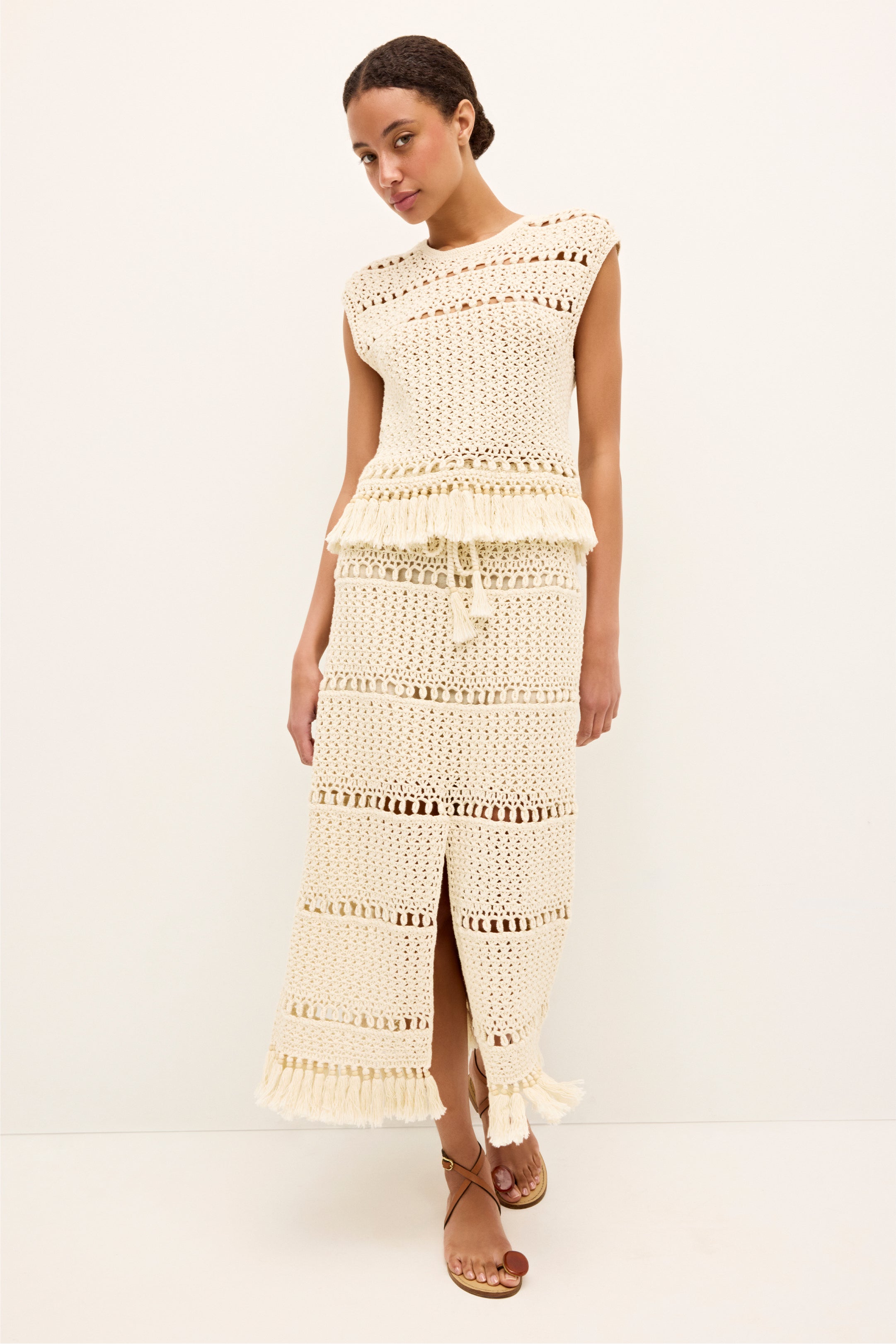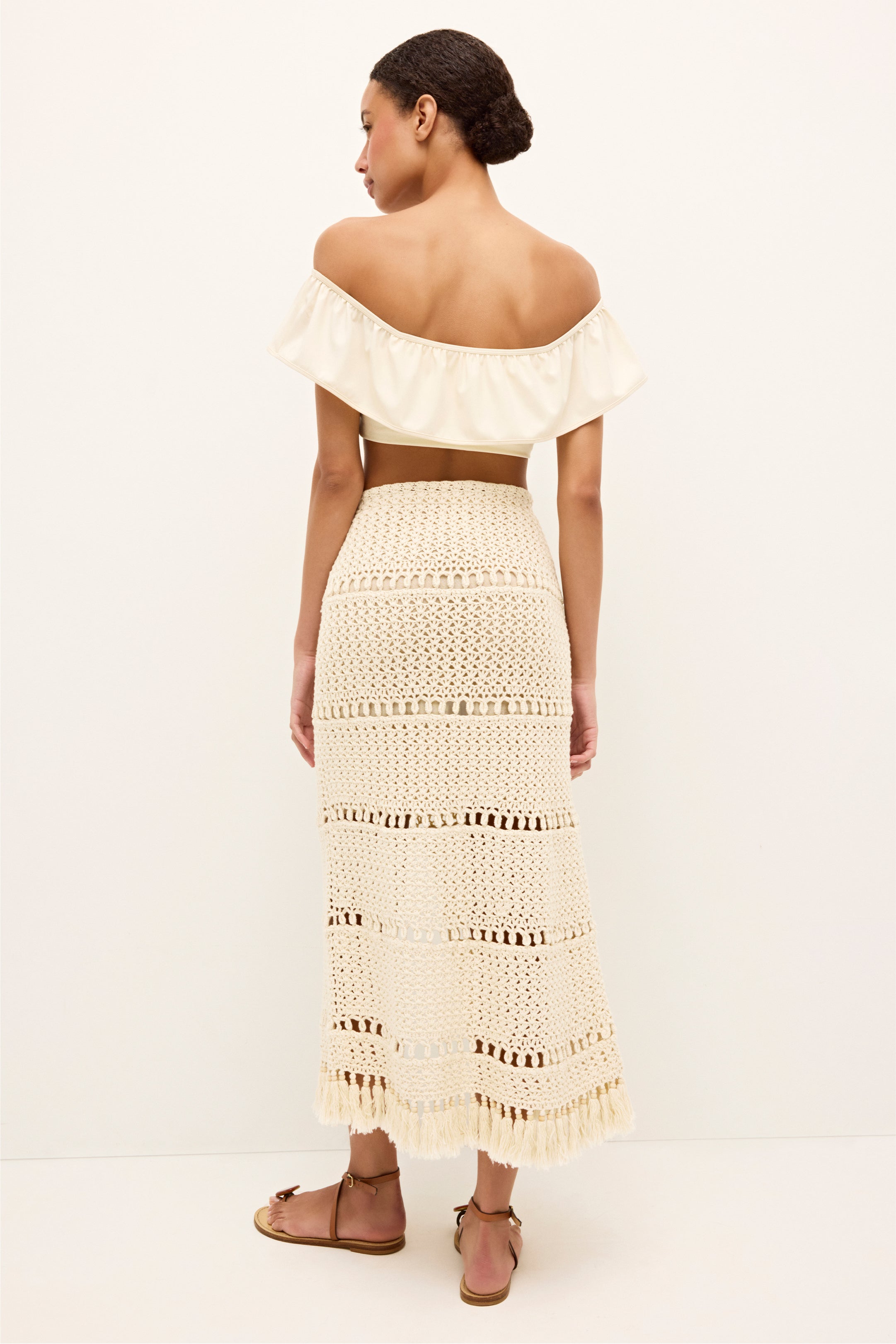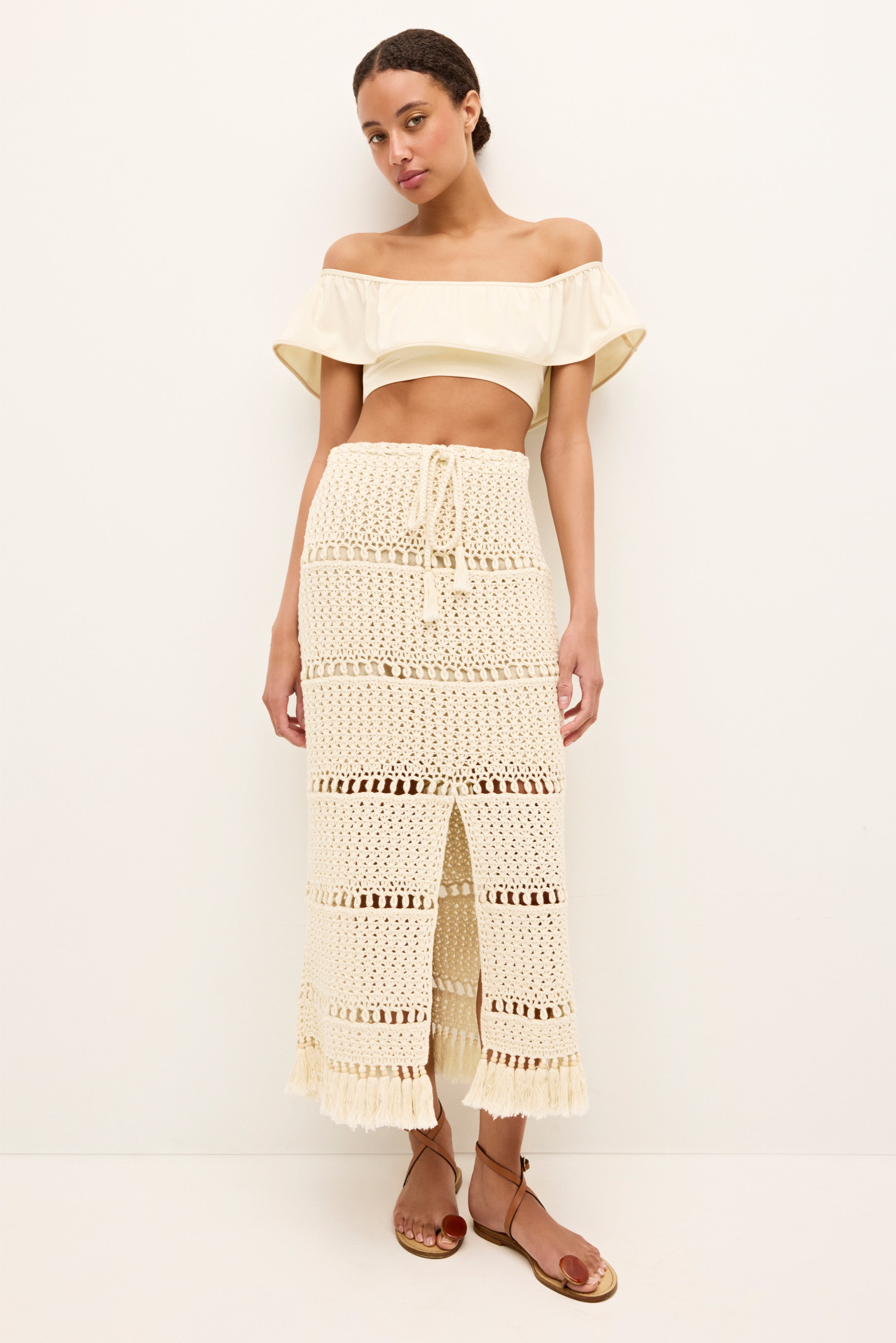 Add instant style and texture to your summer wardrobe with this lined crochet skirt, featuring tassel trim and a pull-on elastic waist. Style Petra with our matching Mira top in Vesper for a chic set that’ll take you from the poolside cabana bar to dinner out.