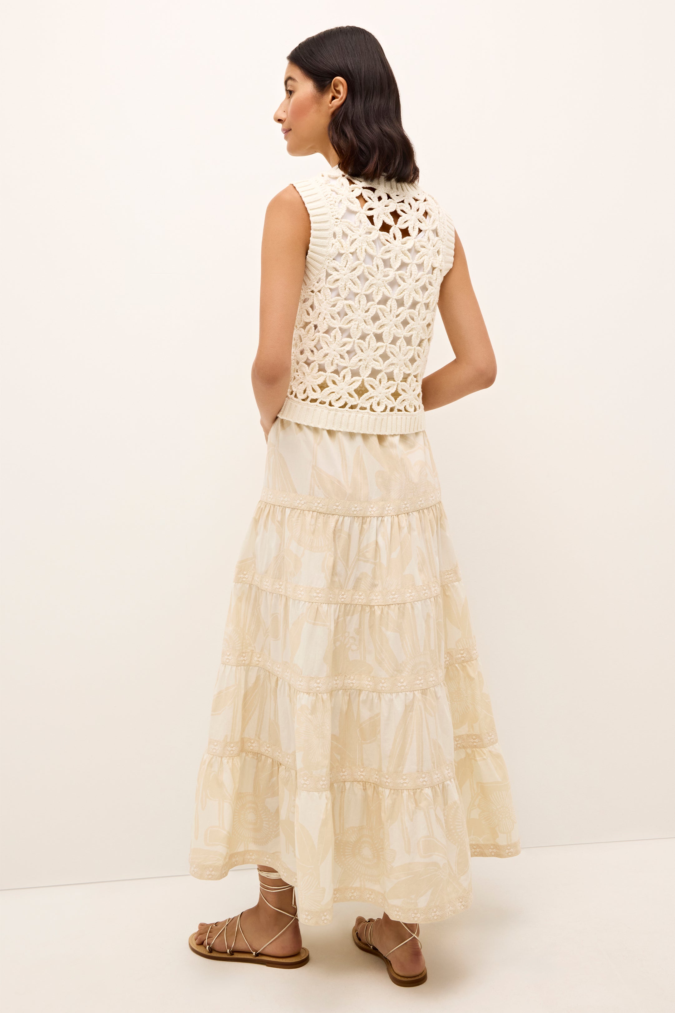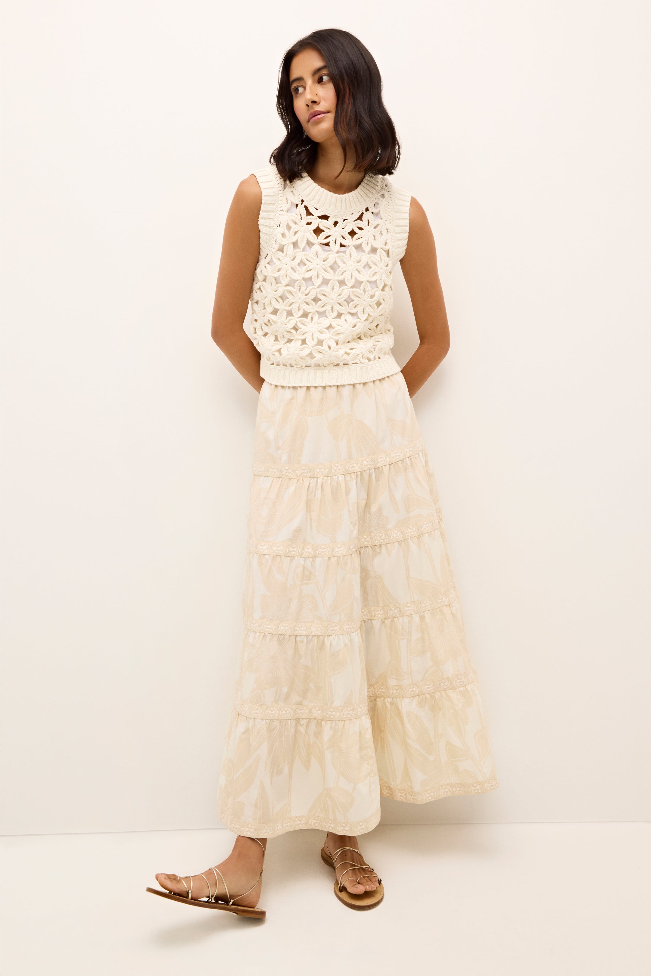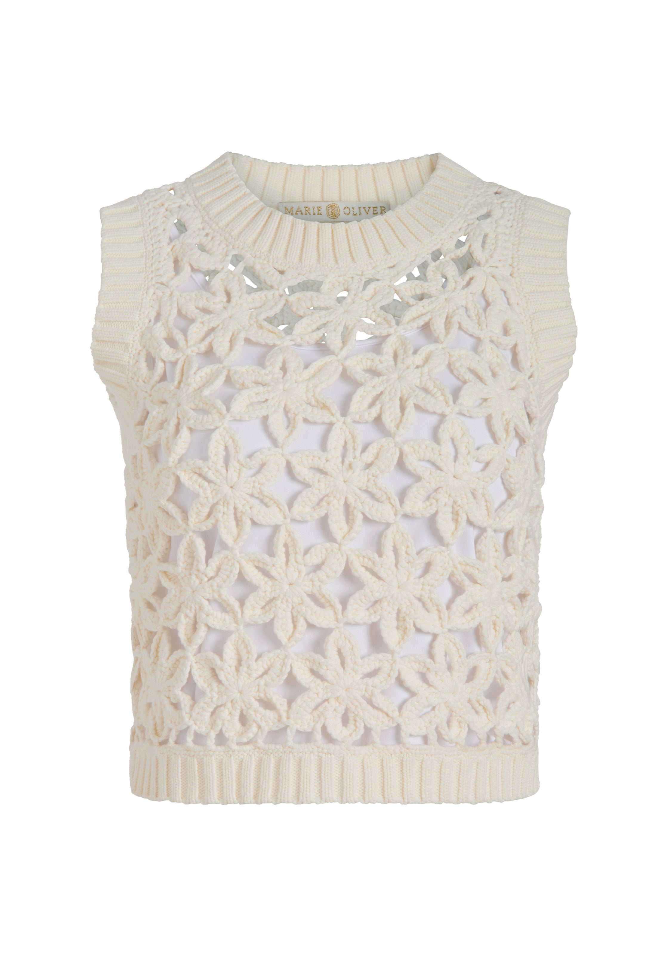Our design team loves a white top for summer, but this lightweight shell in Ecru is a particular favorite. The chic shell silhouette features a cropped figure-skimming fit, a cotton tank liner, and a gorgeous floral “mesh” overlay. Style with our Emmit short or MacBee pant, both in Oyster.