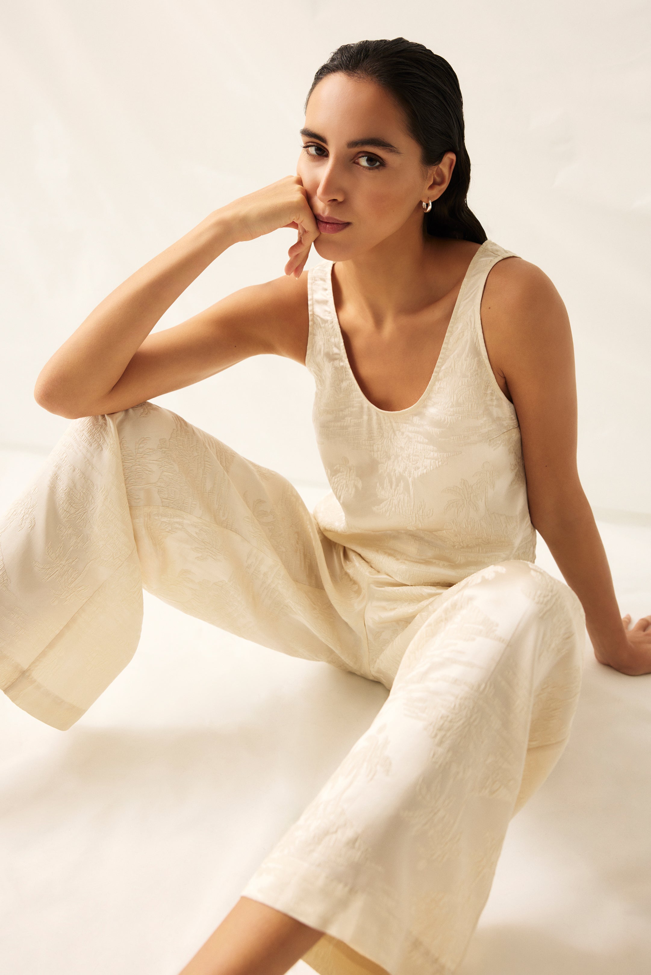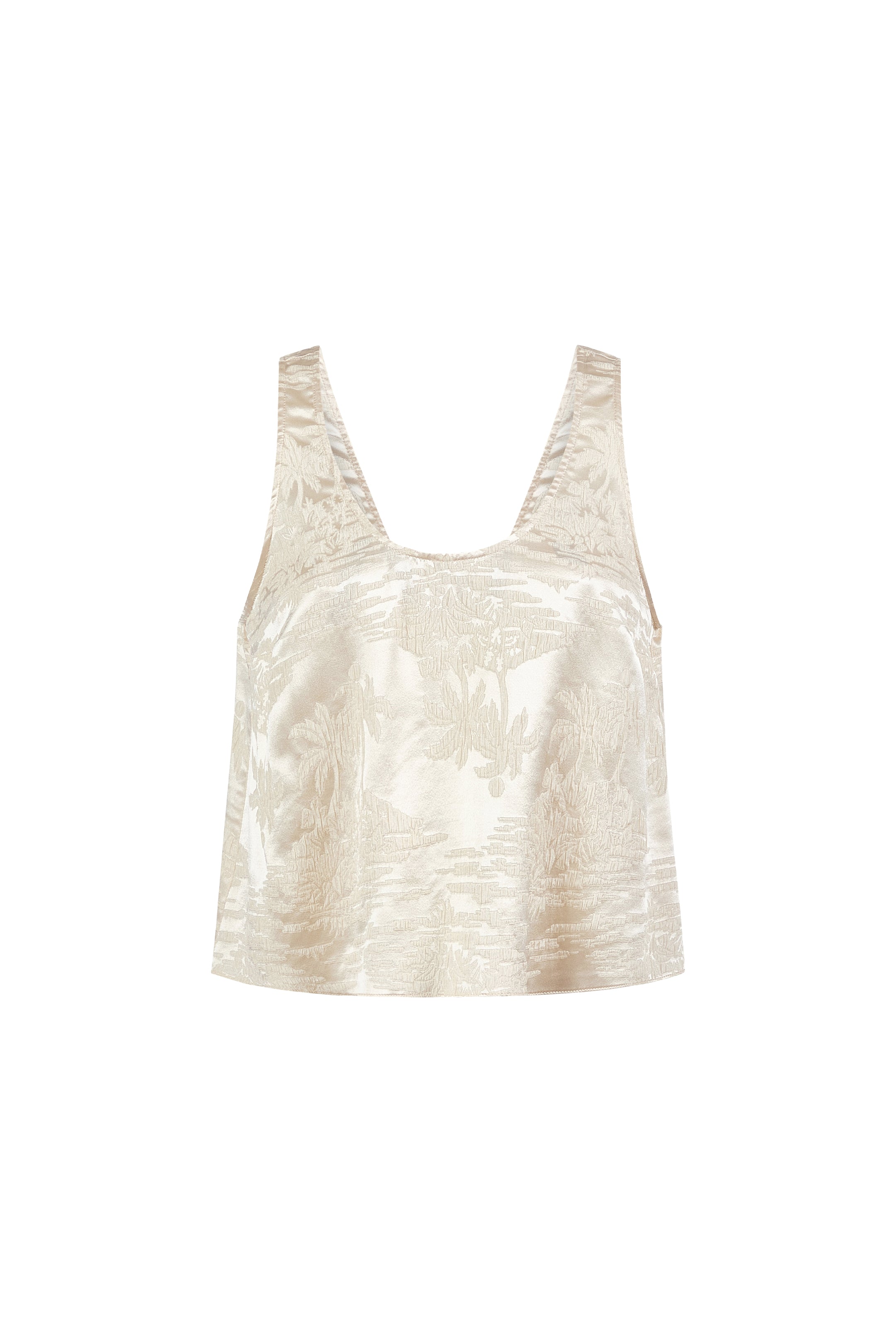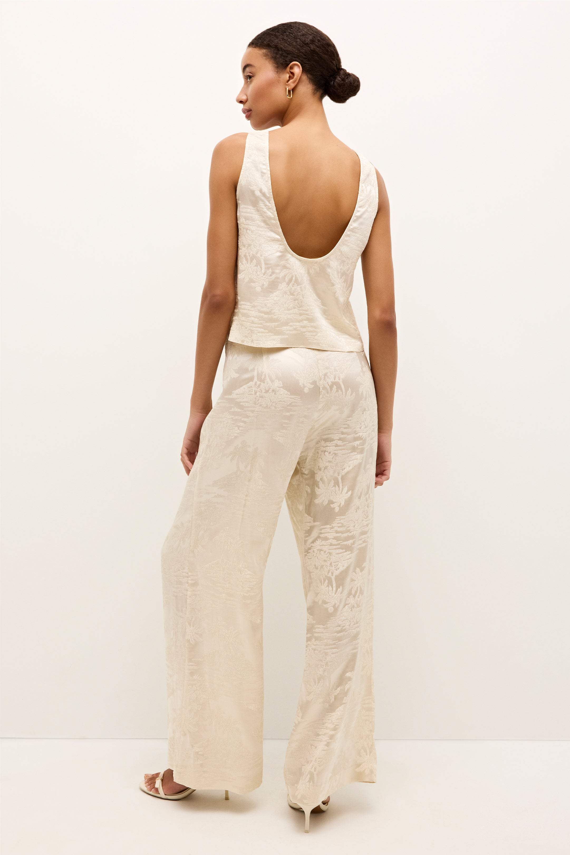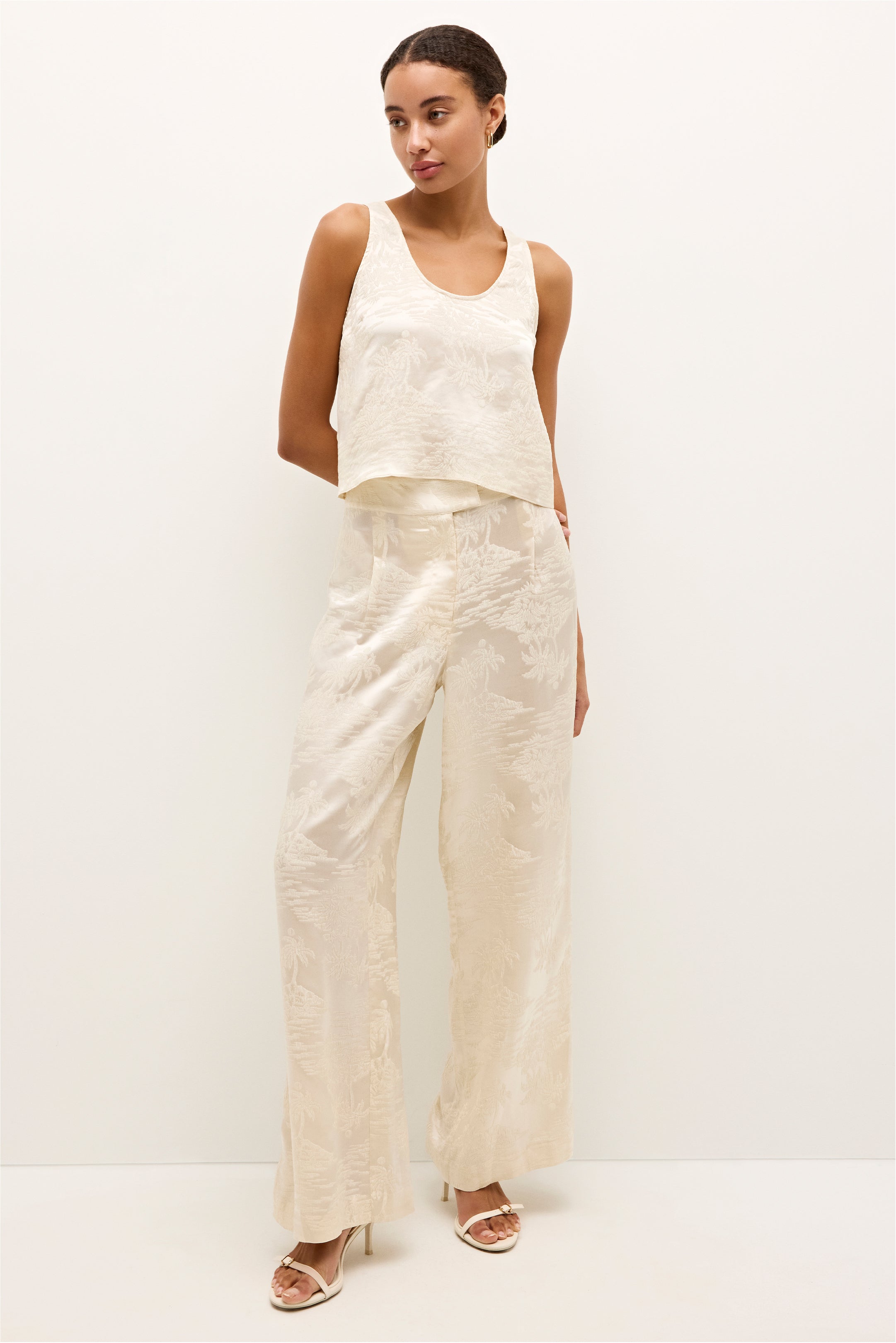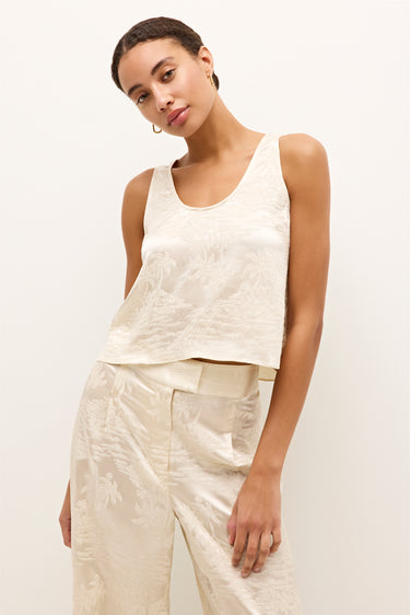 With a deep scoop neckline at the front and back, this slinky silk shell adds a touch of understated allure. Made from palm-printed jacquard in warm summer white, it pairs seamlessly with the matching Rudy pant for a fresh take on timeless glamour.