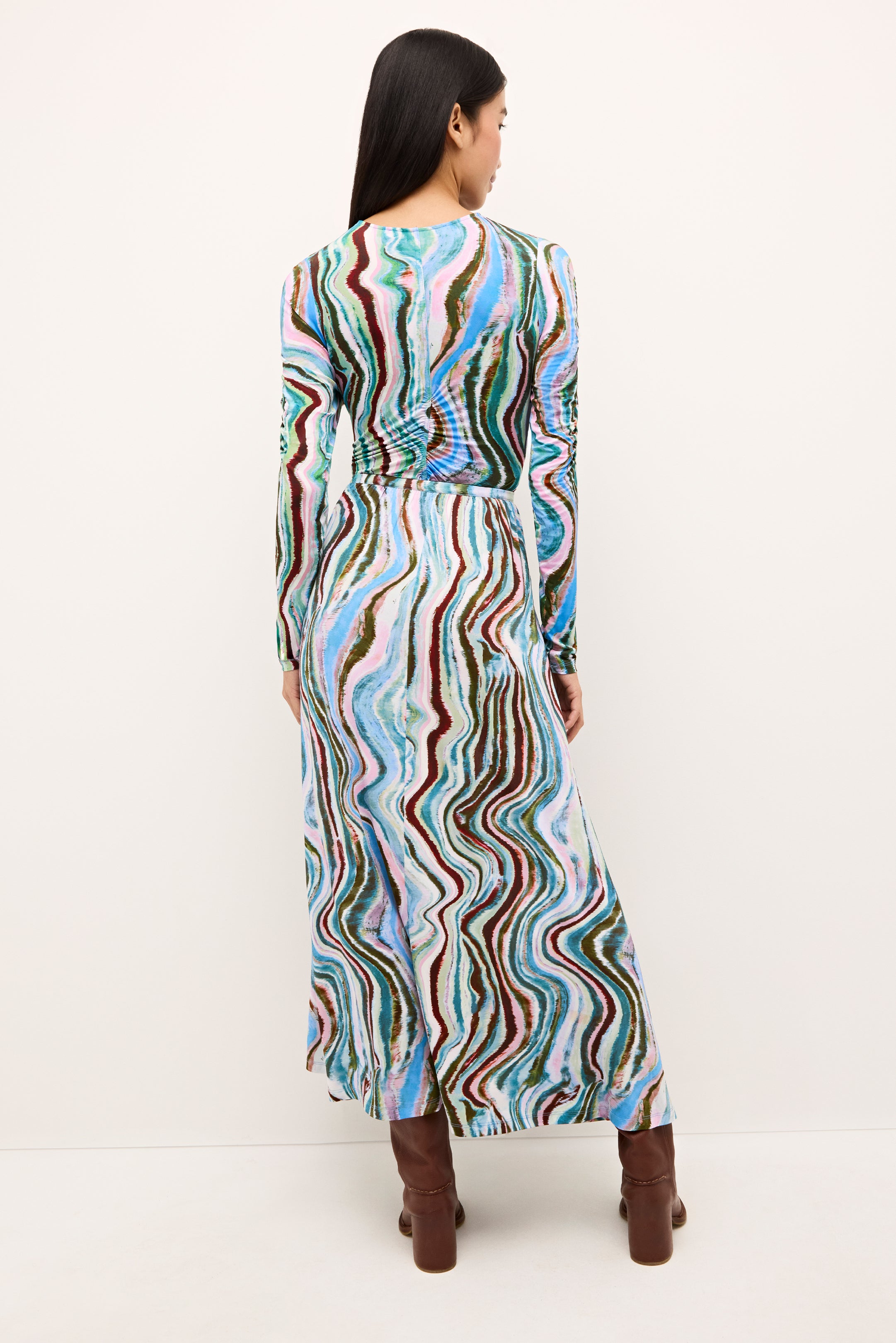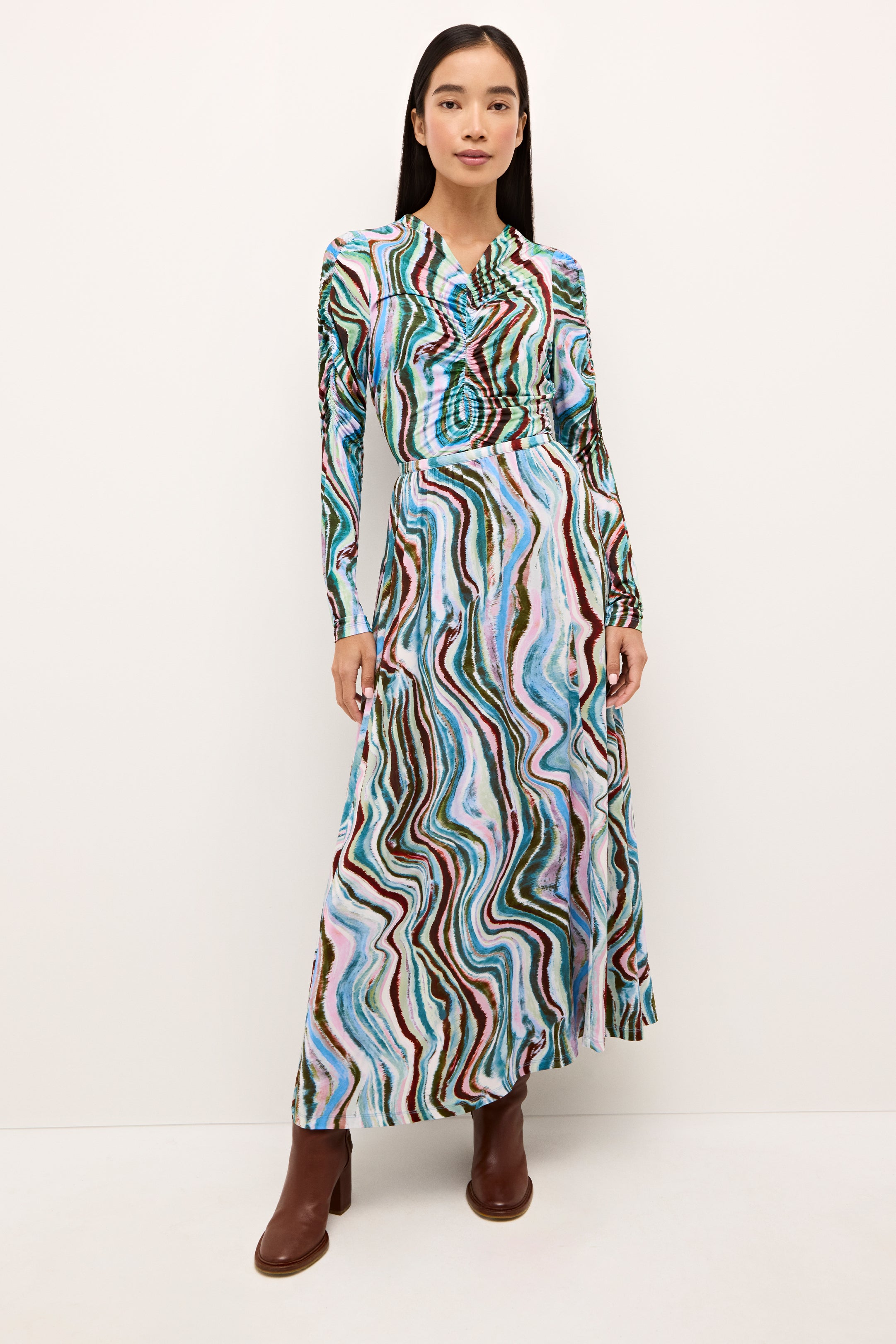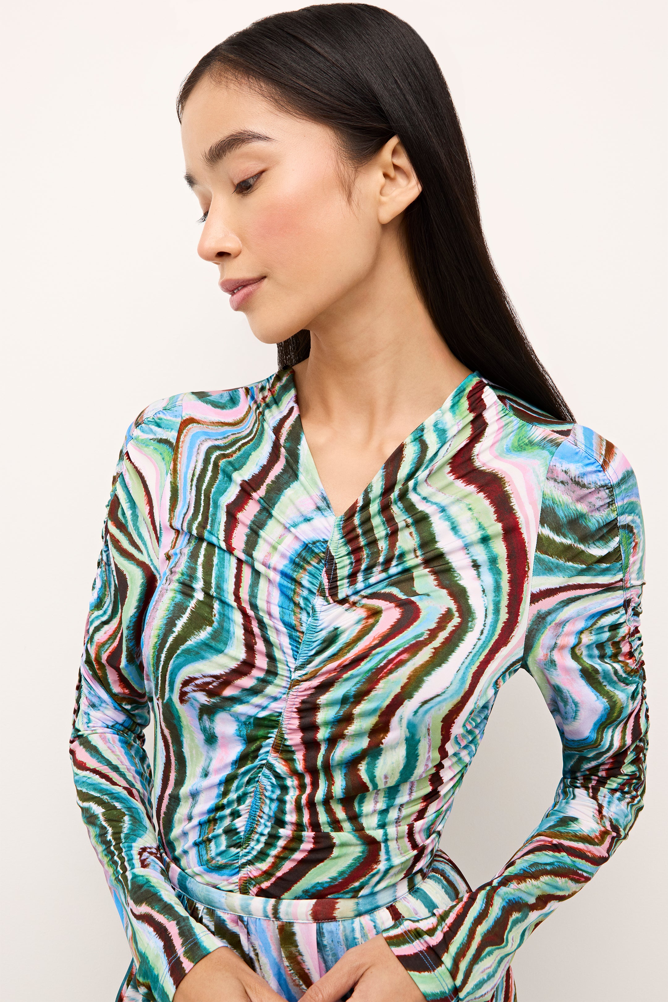 Ruching down the center of this fitted top makes for an especially flattering look. Style the v-neck slip-on silhouette—pictured here in Agate, a striated geological stripe in wintry earth tones—as a set and pair it with our matching Kaia skirt. Cut from the same soft, stretchy fabric, the separates feel as good as they look.